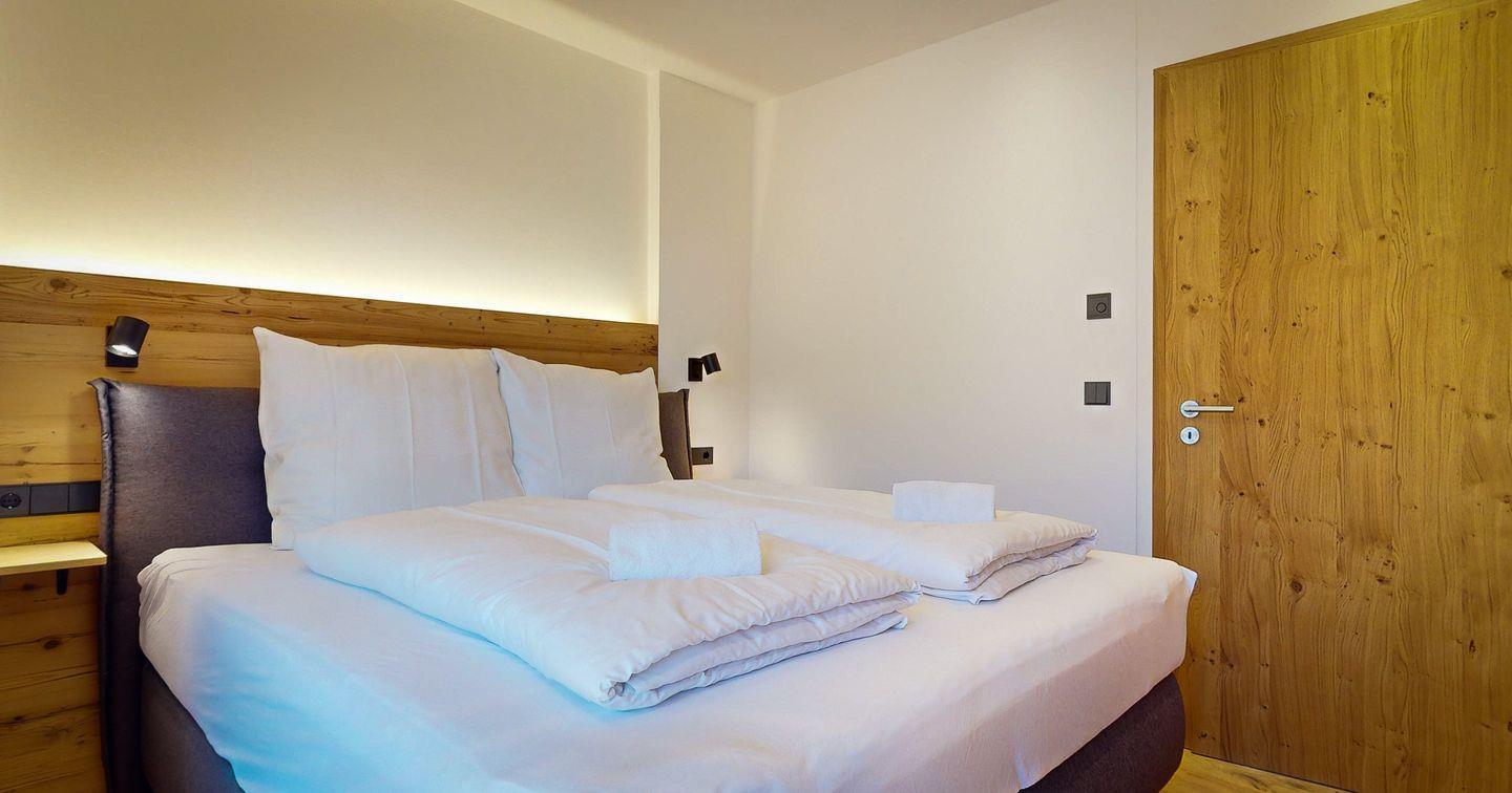 Das Schlafzimmer ist komfortabel und mit einer Garderobe ausgestattet, die ausreichend Platz für Ihr Reisegepäck bietet. Hier finden Sie dank des kuscheligen Doppelbetts einen ruhigen Rückzugsort nach einem spannenden Tag auf den nahe gelegenen Pisten und Wanderwegen.