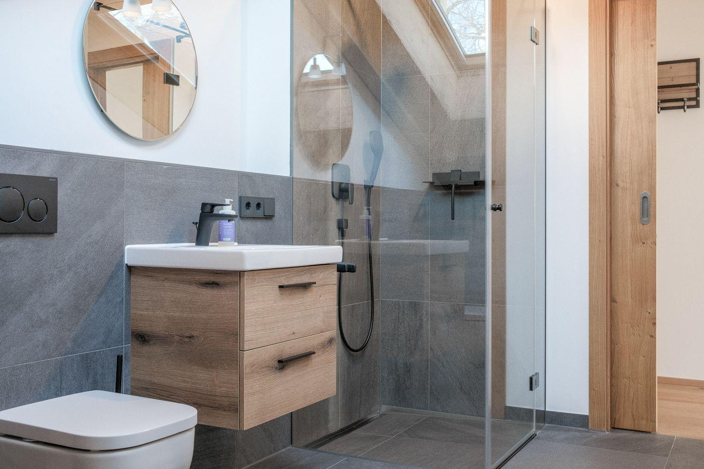 Das mit einer ebenerdigen Regendusche ausgestattete Badezimmer sorgt mit großen Dachfenstern und viel Tageslicht für einen erfrischenden Start in den Tag.