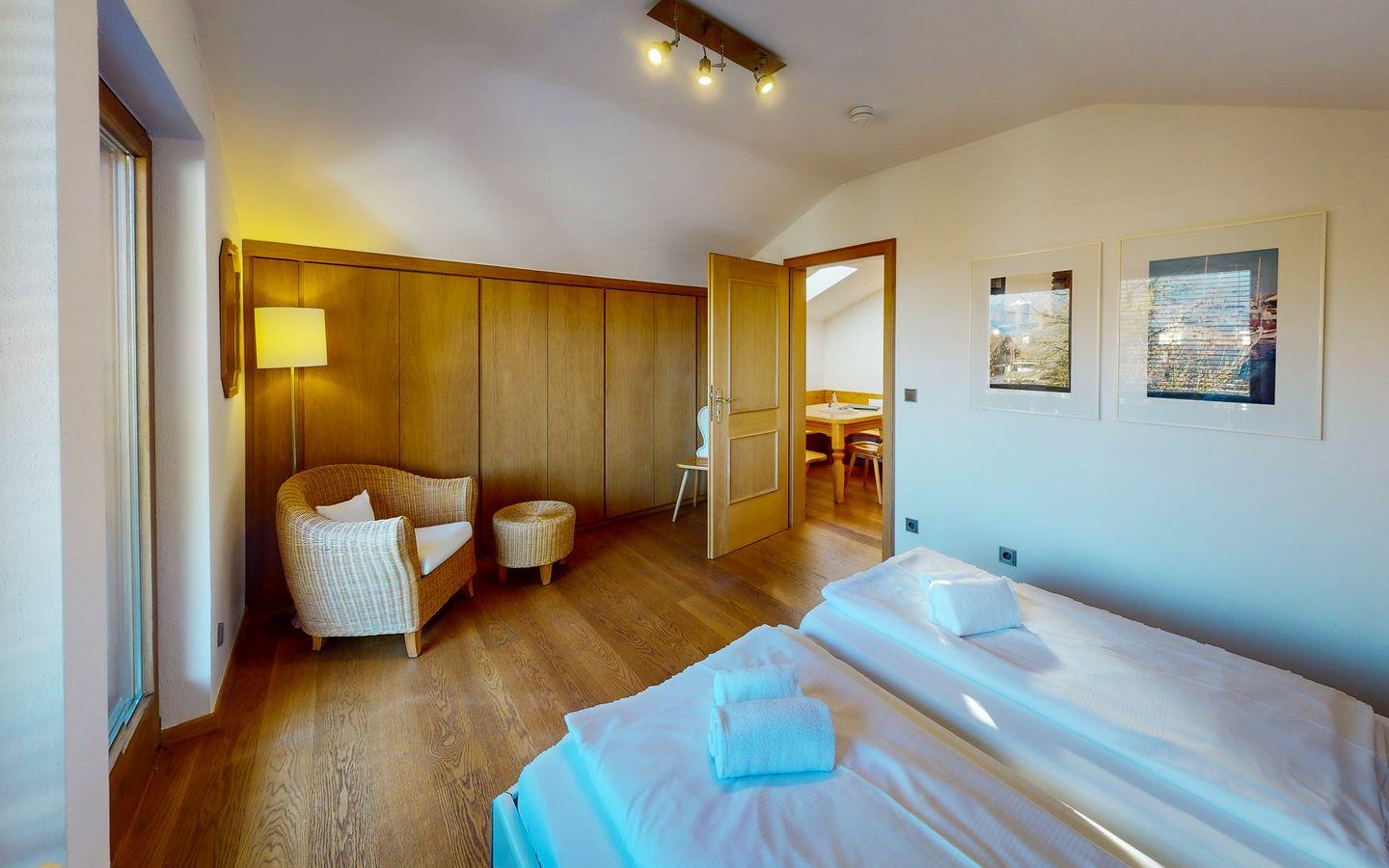 Das eigentliche Schlafzimmer bietet zwei Einzelbetten, die zusammengeschoben als Doppelbett oder separat genutzt werden können, ist mit maßgefertigten Holzschränken ausgestattet, von denen einer sowohl als Kopfteil für das Bett dient. Große Fenster durchfluten den Raum mit natürlichem Licht und bieten gleichzeitig Zugang zum zweiten Balkon, auf dem sich beim Frühstück die ersten Sonnenstrahlen genießen lassen.