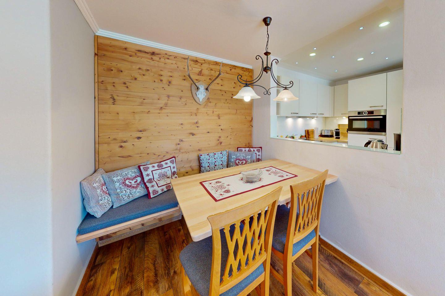 Freuen Sie sich auf ein geräumiges, lichtdurchflutetes Wohnzimmer, das mit einer gemütlichen Couch, einem Sessel und einem Essbereich ausgestattet ist. Perfekt, um entspannte Stunden vor dem Flachbild-Kabel-TV zu verbringen oder Musik über die Stereoanlage zu genießen. Das Sofa lässt sich bei Bedarf ausklappen und in einen bequemen Schlafplatz für 2 Personen umfunktionieren. Direkt angrenzend lädt der Südwestbalkon mit komfortablen Möbeln dazu ein, den Blick auf das beeindruckende Wettersteinmassiv und die Zugspitze schweifen zu lassen – ein idealer Ort, um die Sonne zu genießen und den Tag in Ruhe ausklingen zu lassen.