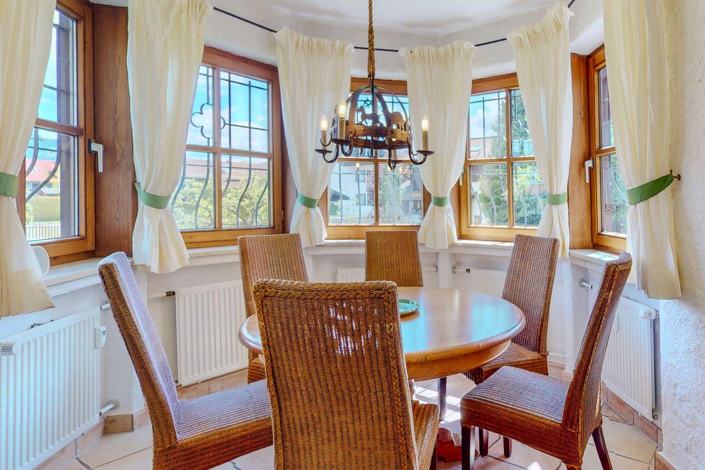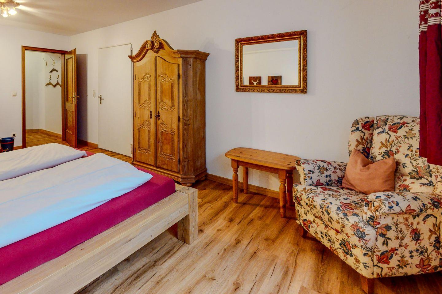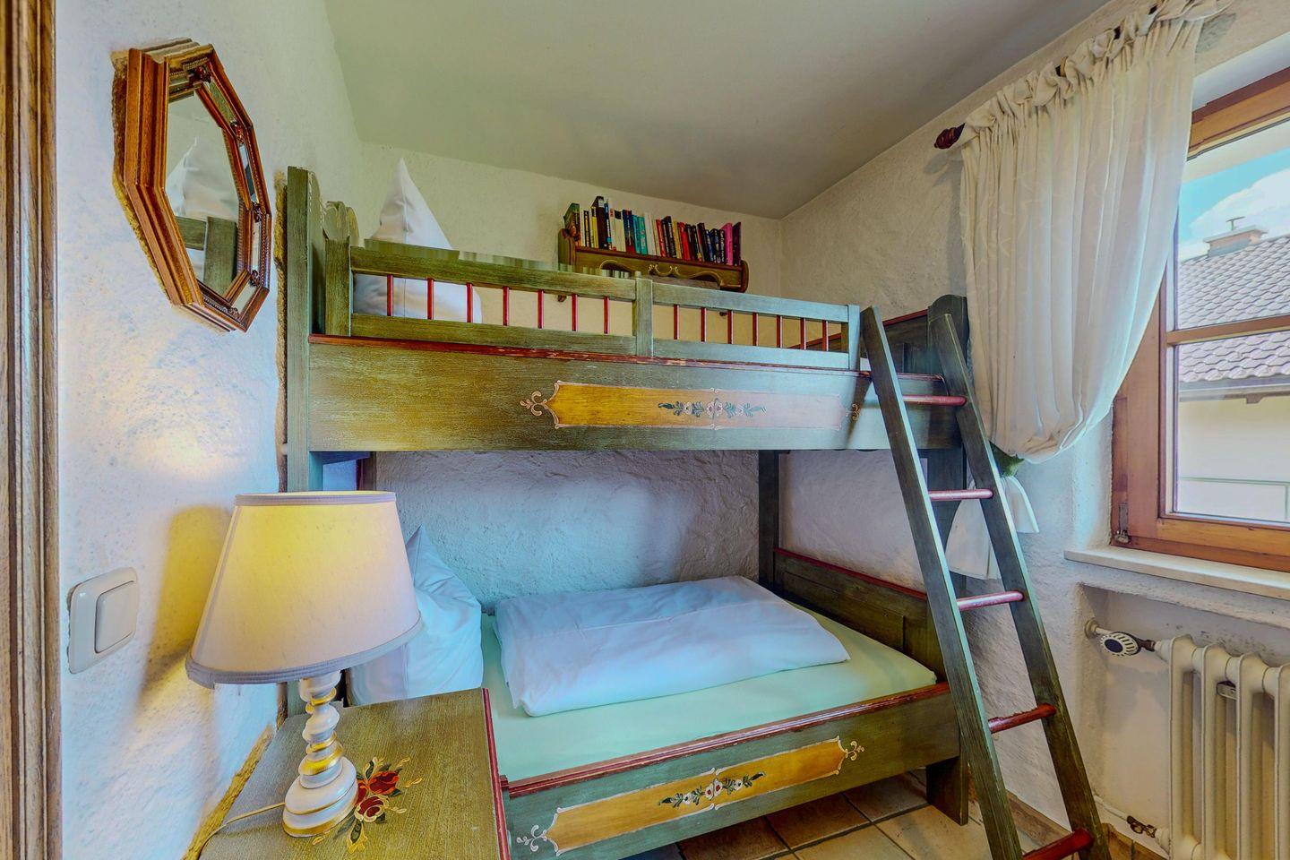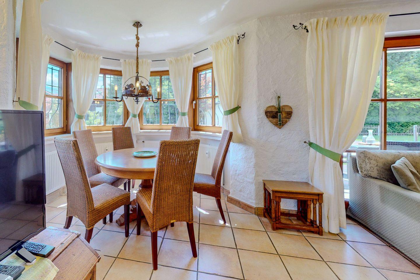 Der helle Wohnbereich ist mit einer bequemen Couchgarnitur, einem Essplatz im Erker sowie Kabel-TV ausgestattet und schafft eine wohnliche Atmosphäre. Die Einrichtung verbindet traditionell-urige Elemente mit modernen Akzenten und lädt zum Verweilen ein – ob für gesellige Abende oder entspannte Lesestunden.