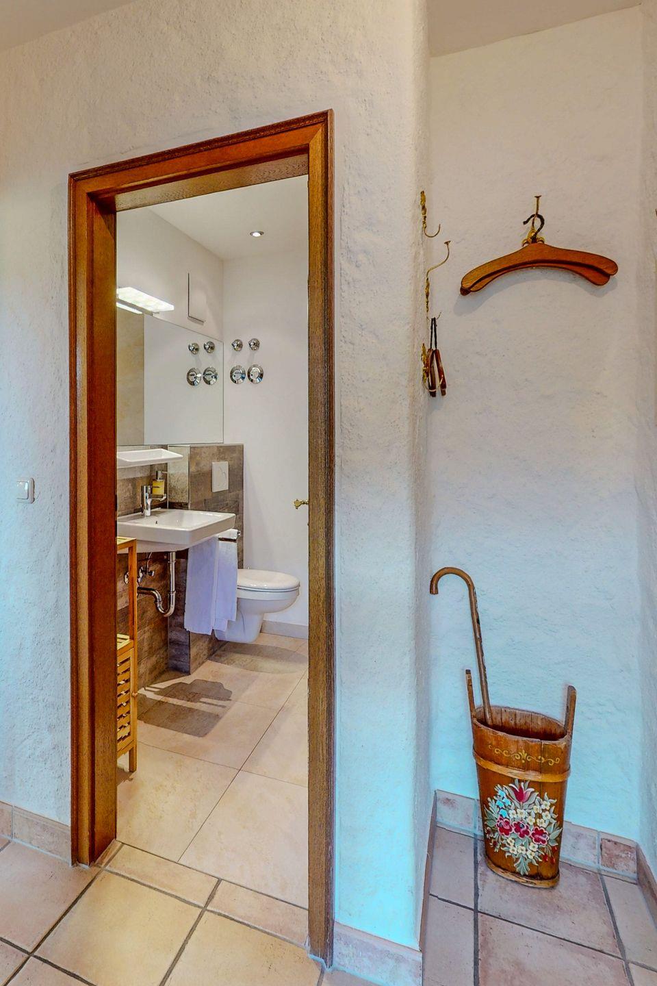 Im Erdgeschoss befinden sich zwei Schlafzimmer – eines mit Doppelbett, das andere mit einem Doppelstockbett – sowie ein modernes Badezimmer mit Dusche und WC. Über eine Wendeltreppe gelangt man in das separate Souterrain-Zimmer, das mit einem weiteren Doppelbett und einem eigenen Duschbad samt WC ausgestattet ist – ideal für mitreisende Jugendliche, Großeltern oder Freunde.