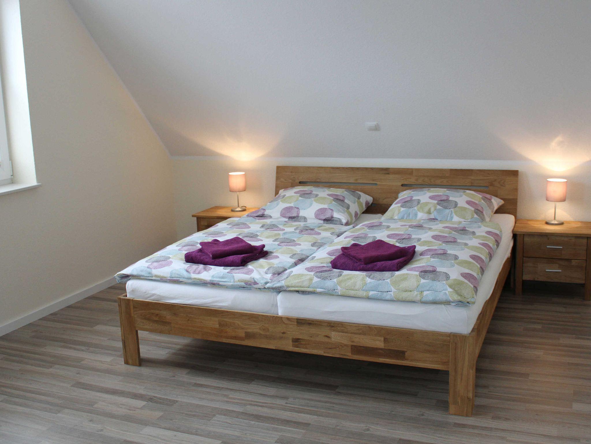 Das Ferienhaus verfügt über sechs Schlafplätze verteilt auf vier Schlafzimmer (zwei Doppelzimmer (je ein Doppelbett mit den Maßen 1,80 m x 2,00 m), zwei Einzelzimmer (je ein Bett mit den Maßen 1,40 m x 2,00 m bzw. 0,90 m x 2,00 m)). Bei Bedarf kann ein Babybett zur Verfügung gestellt werden. Darüber hinaus gibt es zwei Badezimmer, eines im Erdgeschoss und eines im Obergeschoss. Diese sind jeweils mit einer Dusche, Toilette und Waschbecken ausgestattet. Eine Waschmaschine sowie ein Wäscheständer sind ebenfalls vorhanden. Der offene Wohn- und Essbereich ist mit einer modernen Küchenzeile (E-Herd, Spülmaschine, Mikrowelle, Kaffeemaschine, Wasserkocher und Toaster) und einem Esstisch für sechs Personen ausgestattet. Bei Bedarf wird ein Kinderhochstuhl zur Verfügung gestellt. Ebenfalls befindet sich im Wohn- und Essbereich eine Sofaecke, ein Kaminofen sowie ein Flachbildfernseher und eine Wii-Spielekonsole. Ein weiterer Flachbildfernseher befindet sich im Obergeschoss, im Doppelschlafzimmer. Das gesamte Ferienhaus ist mit einer Fußbodenheizung sowie mit WLAN ausgestattet. Ebenso ist das gesamte Haus mit Außenrollläden und z.T. auch Plissees ausgestattet.