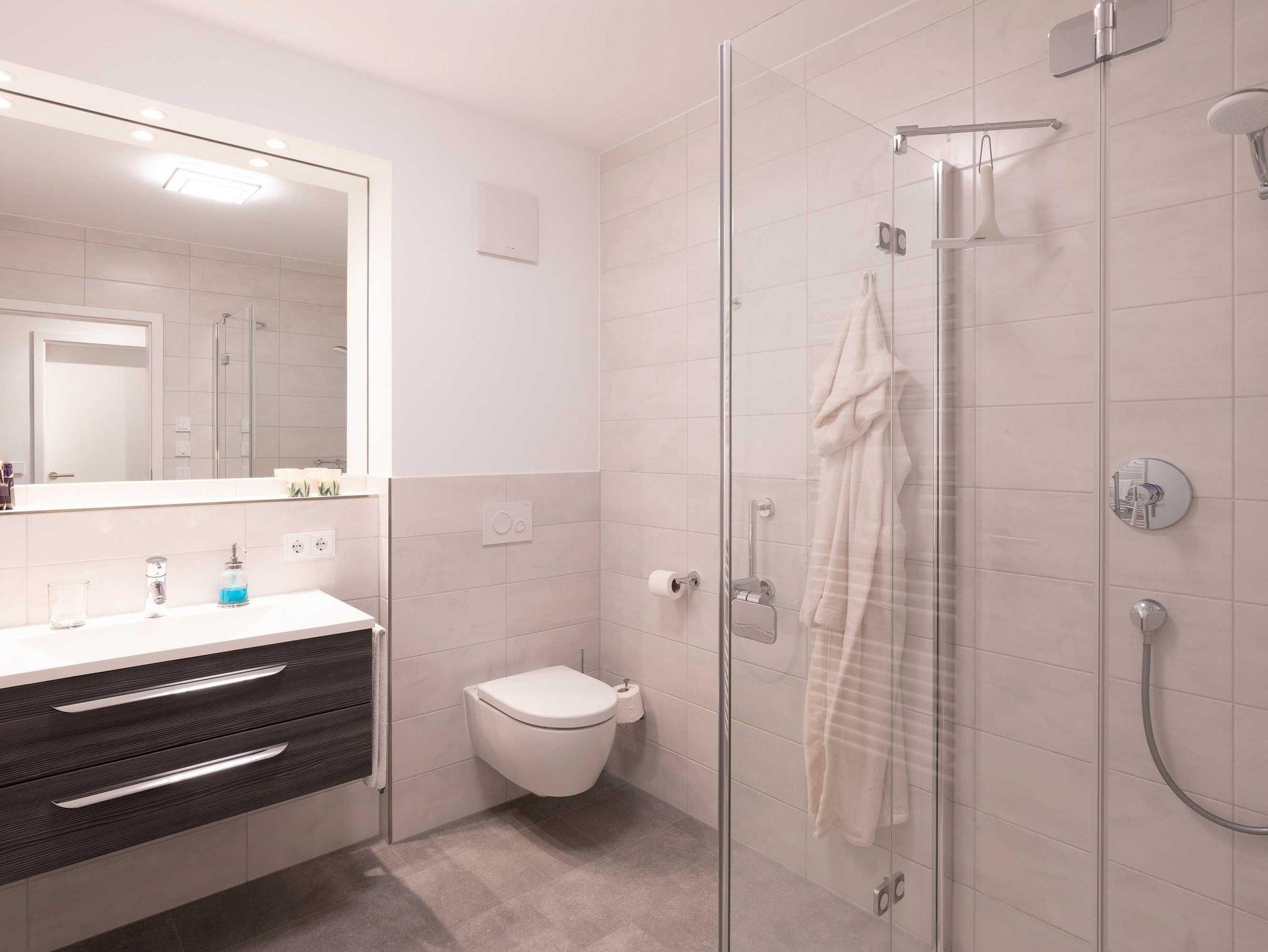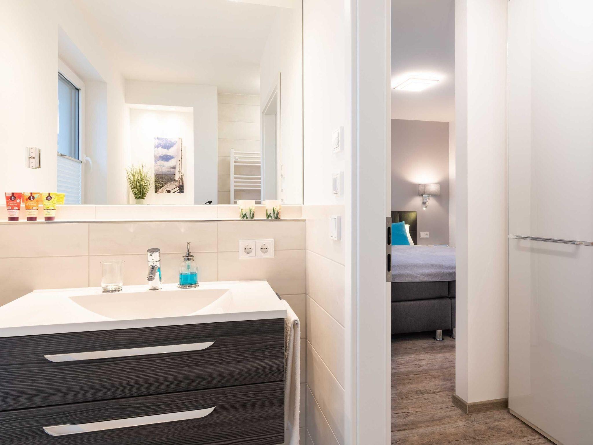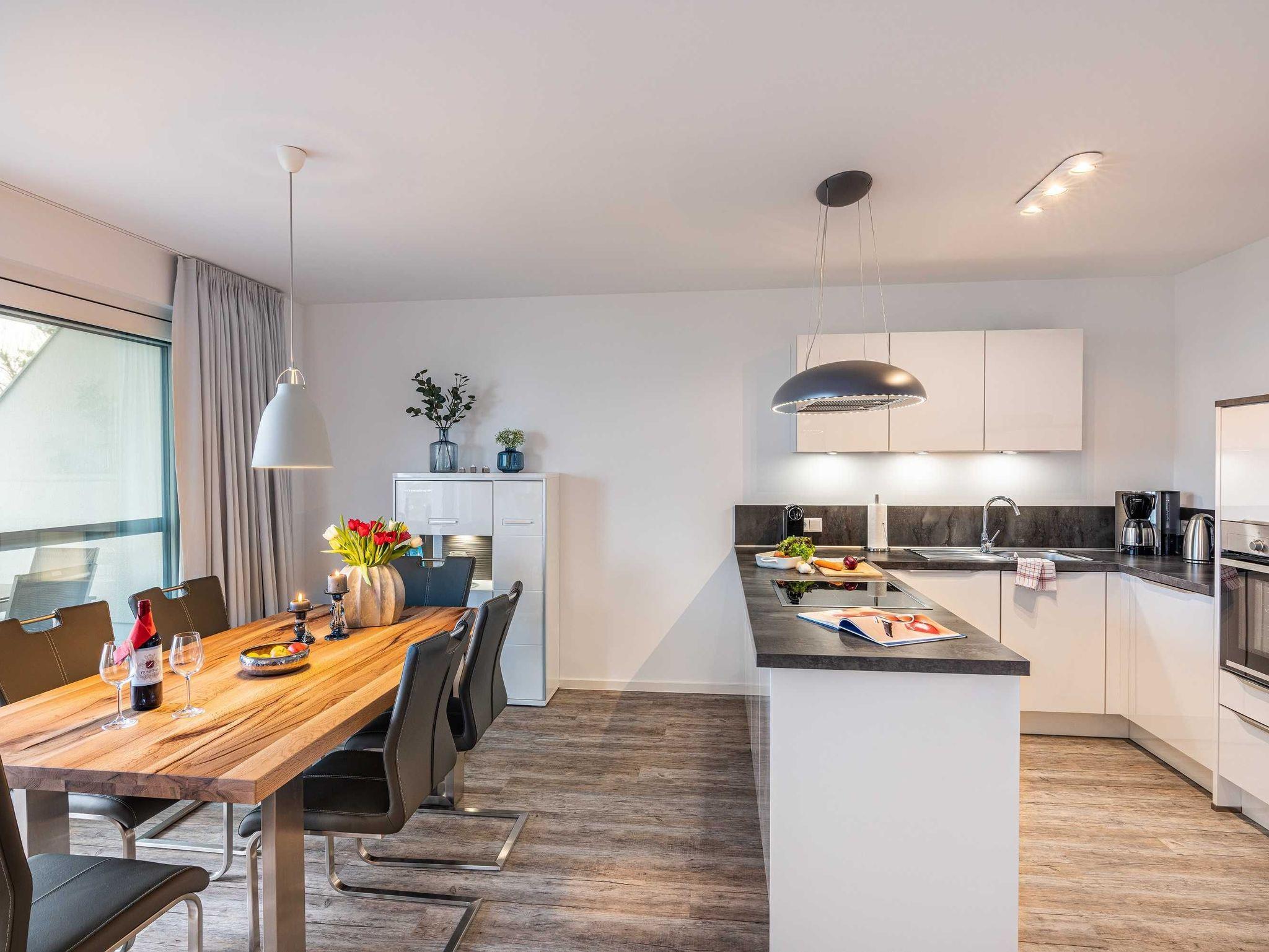 Diese lichtdurchflutete, helle 4-Zimmer-Wohnung im obersten Geschoss von Haus 7 (Aufzug vorhanden) mit Platz für maximal 6 Personen verfügt über eine Wohnfläche von 100 m² und hat 3 Schlafzimmer sowie 2 voll ausgestattete Duschbäder. Die große Sonnenterrasse mit 17 m² liegt in idealer Süd-Ausrichtung. Die Wohnung ist modern eingerichtet mit offenem Wohn-Essbereich, großem Esstisch, Ledersofa sowie Smart-TV (inkl. Sky-Abo). Die hochwertig ausgestattete Küche, offen zum Wohnbereich, lässt keine Wünsche offen. Erholsamer Schlaf in den beiden Schlafzimmern mit Boxspringbetten und Smart-TV ist garantiert. Im dritten Schlafzimmer befindet sich ein bequemes Schlafsofa (Liegefläche: 1,60 x 2,00 m) und ein Smart-TV. Das Badezimmer en Suite ist mit einer begehbaren Dusche ausgestattet. Auf der großen, überdachten Sonnenterrasse mit Essgruppe und jeweils zwei Relax-Sesseln, Fußhockern sowie einem Sonnenschirm können Sie die Seele baumeln lassen.