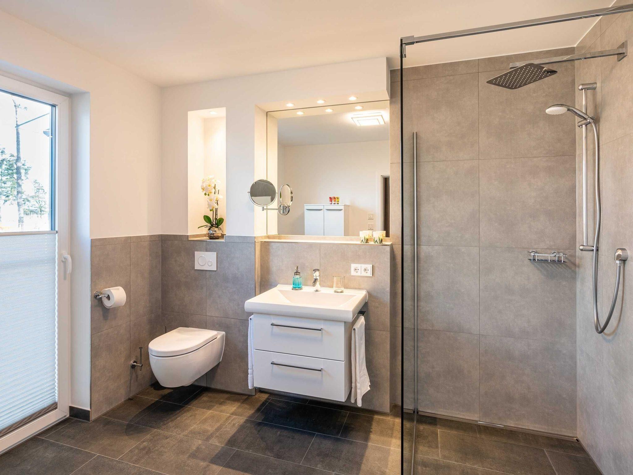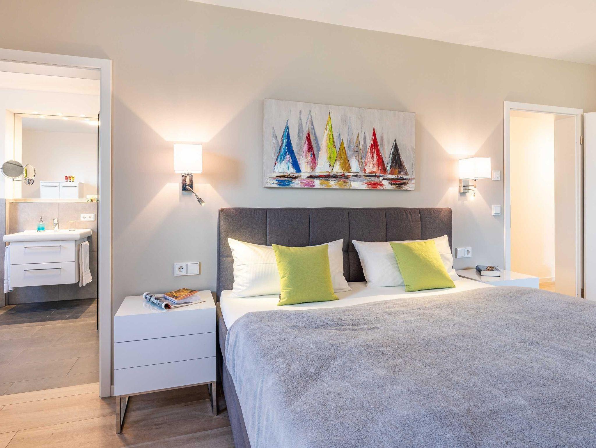 Diese luxuriöse 3-Zimmer-Wohnung im Erdgeschoss von Haus 6 mit Platz für maximal 4 Personen sowie einem Kleinkind bis 2 Jahre im Babybett verfügt über eine Wohnfläche von 101 m² und hat 2 Schlafzimmer sowie 2 voll ausgestattete Duschbäder. Die große Sonnenterrasse mit 21 m² liegt in idealer Süd-Ausrichtung. Die Wohnung ist modern eingerichtet mit offenem Wohn-Essbereich, großem Esstisch, Ledersofa sowie Smart-TV (inkl. Sky-Abo). Die hochwertig ausgestattete Küche, offen zum Wohnbereich, lässt keine Wünsche offen. Erholsamer Schlaf in den beiden Schlafzimmern mit Boxspringbetten und Smart-TV ist garantiert. Das Badezimmer en Suite ist mit einer begehbaren Dusche ausgestattet. Auf der großen, überdachten Sonnenterrasse mit Essgruppe und jeweils zwei Relax-Sesseln, Fußhockern, Sonnenschirm und Sonnenliegen können Sie die Seele baumeln lassen.