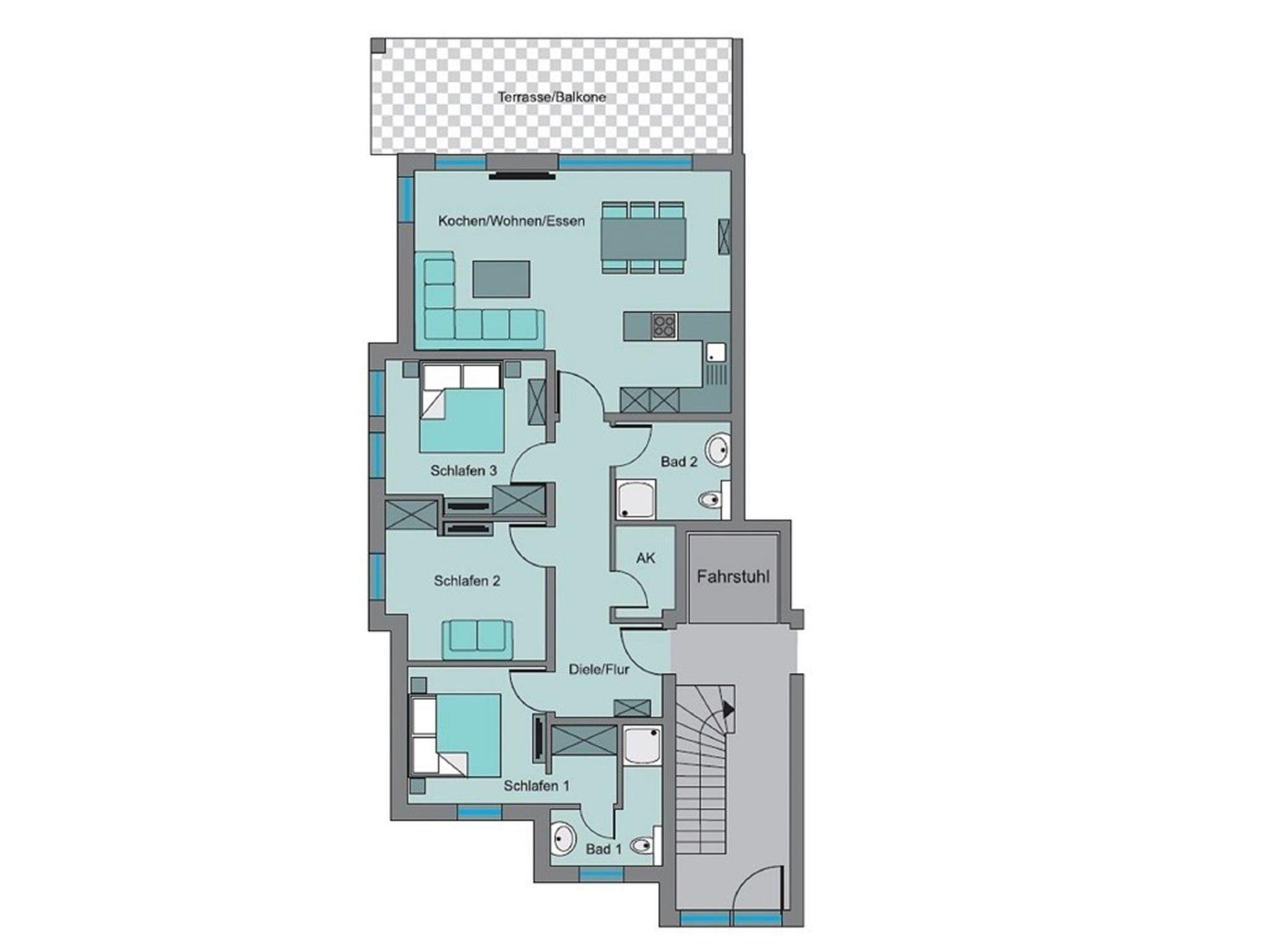 Die barrierefreie und sonnendurchflutete 4-Zimmer-Ferienwohnung liegt im zweiten Obergeschoss des 8-Parteienhauses. Ein Aufzug ist vorhanden, der jede Etage anfährt.