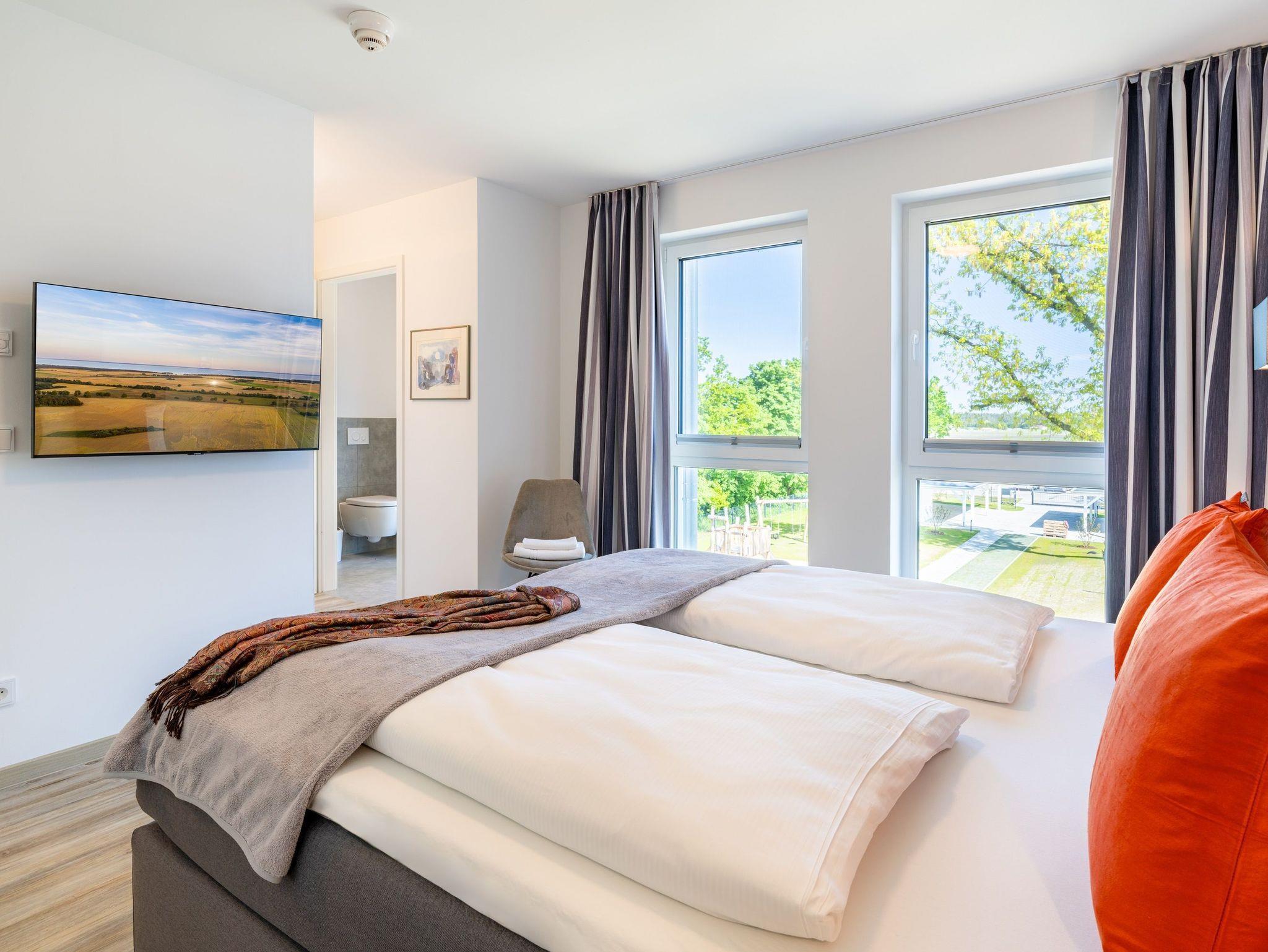 Das Hauptschlafzimmer bietet ein hochwertiges Boxspringbett (180 x 200 cm), einen Kleiderschrank sowie einen Smart-TV. Das en suite Badezimmer mit begehbarer Dusche rundet den Komfort ab.