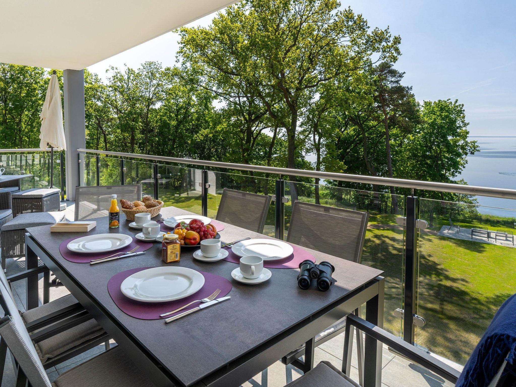 Freuen Sie sich auf den atemberaubenden Meerblick auf das Stettiner Haff vom 18 m² großen, überdachten Sonnenbalkon, der schnell Ihr Lieblingsplatz in diesem Ferienapartment wird.