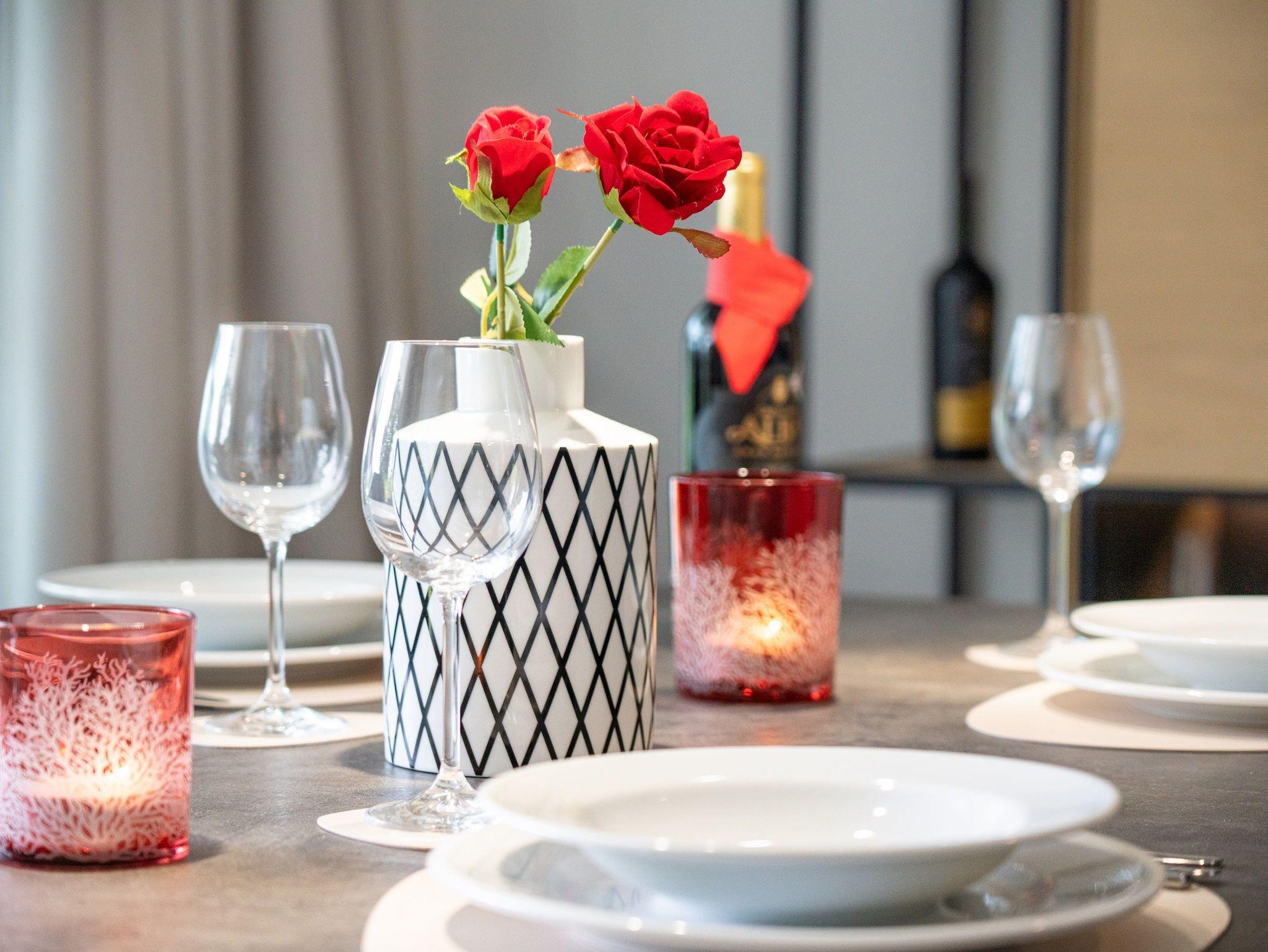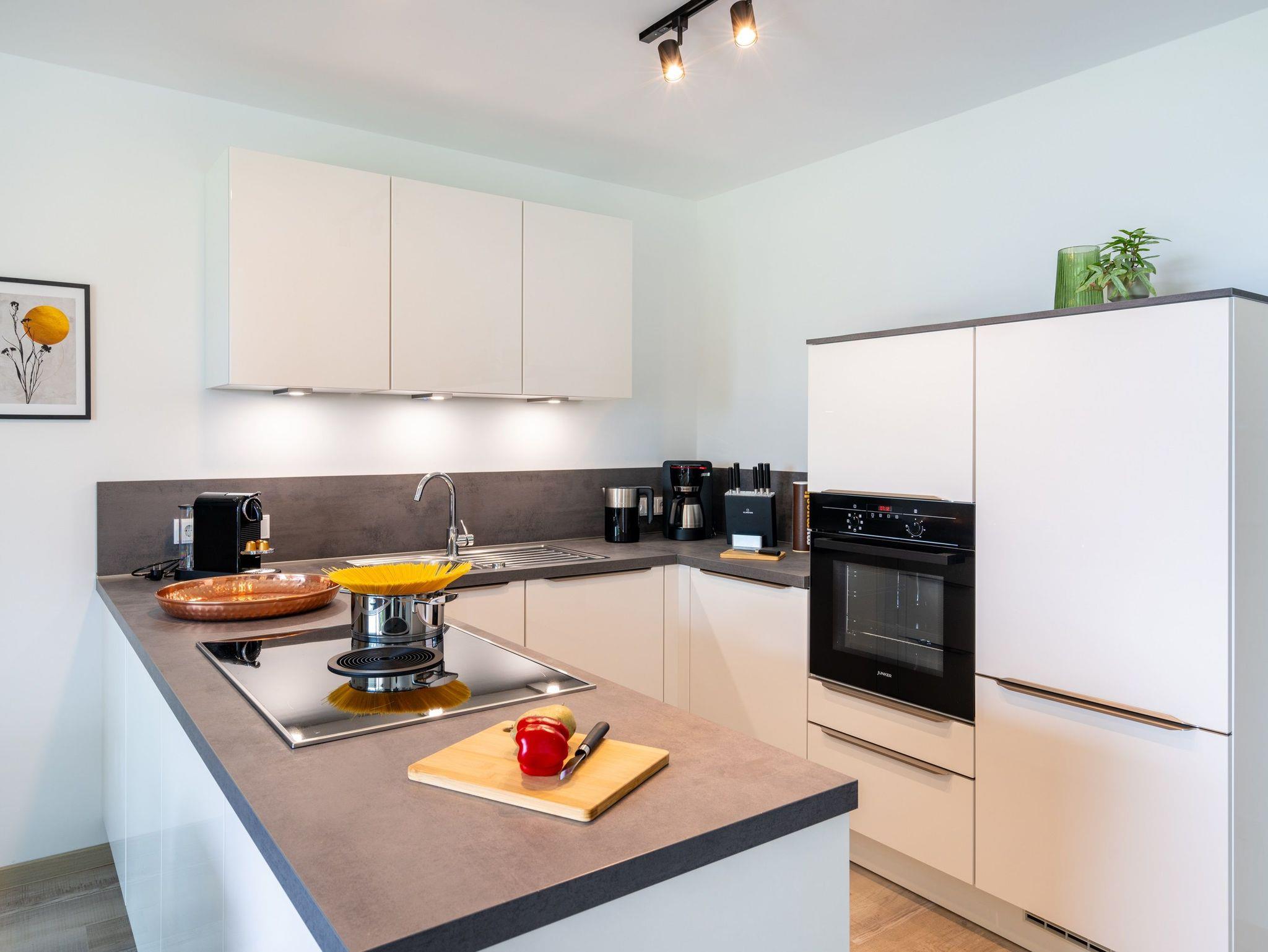 Die weiße Hochglanzküche von Nobilia ist umfassend ausgestattet mit schönem Porzellan, Kochgeschirr und allen notwendigen Küchenutensilien. Sie finden hier einen großen Kühlschrank mit separatem Gefrierfach, einen Backofen in Sichthöhe, eine Spülmaschine, eine Filterkaffeemaschine, einen Milchschäumer, eine Nespresso-Kapselmaschine, einen Toaster und einen Wasserkocher, sowie vieles mehr.