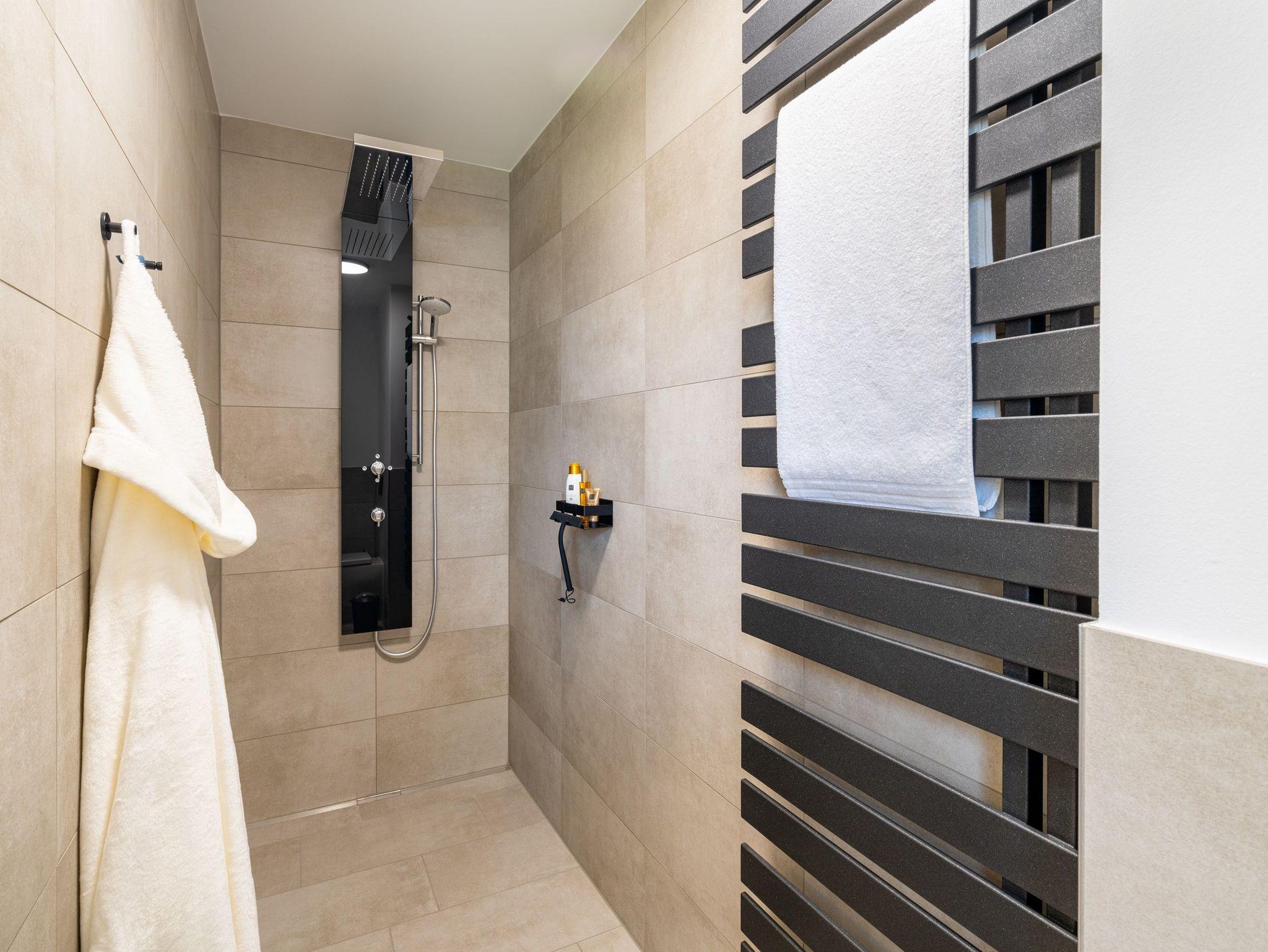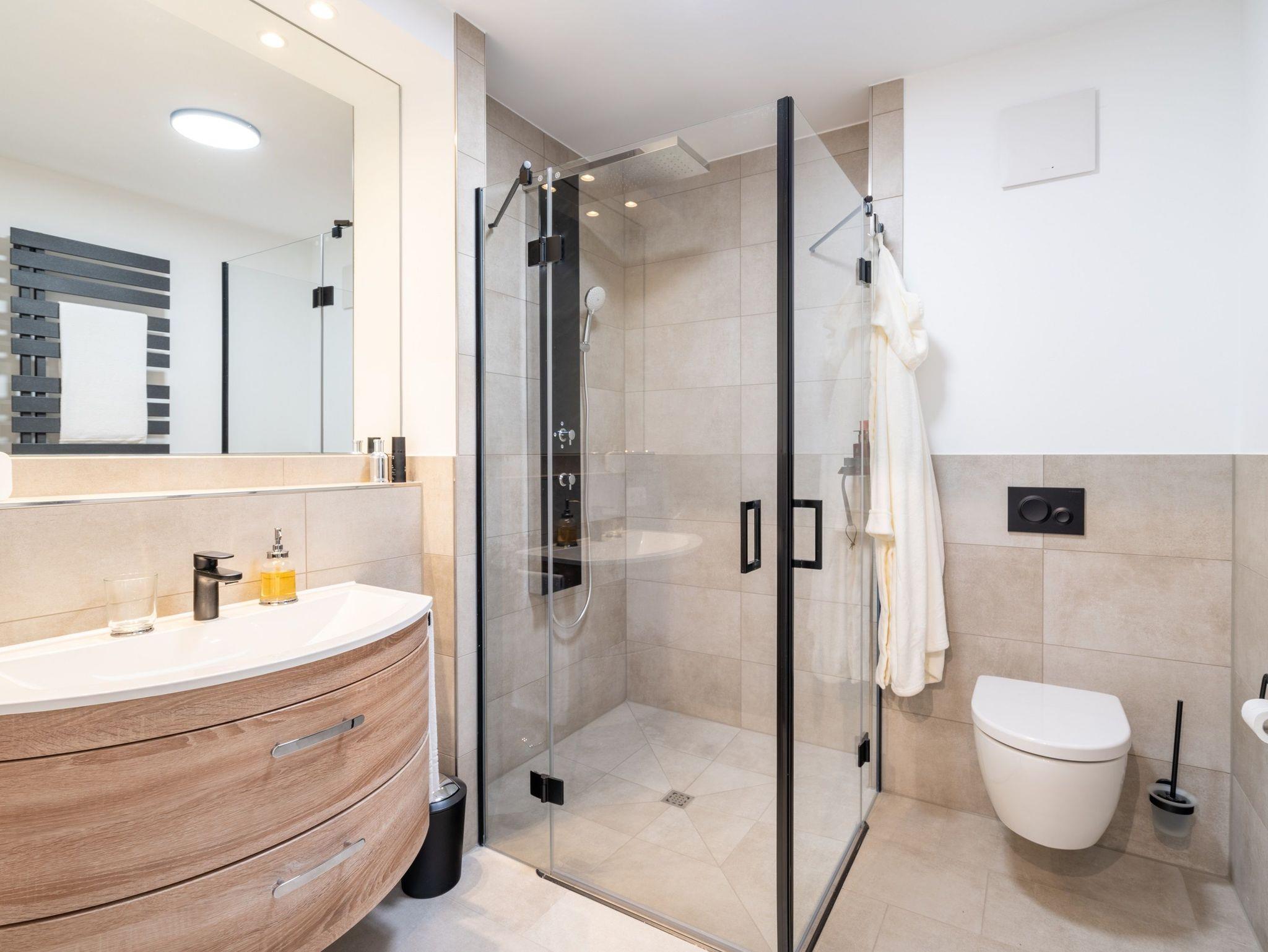 Im zweiten, voll ausgestatteten Badezimmer steht Ihnen eine großzügige Ganzglas-Duschkabine mit den Maßen 120 x 120 cm zur Verfügung.