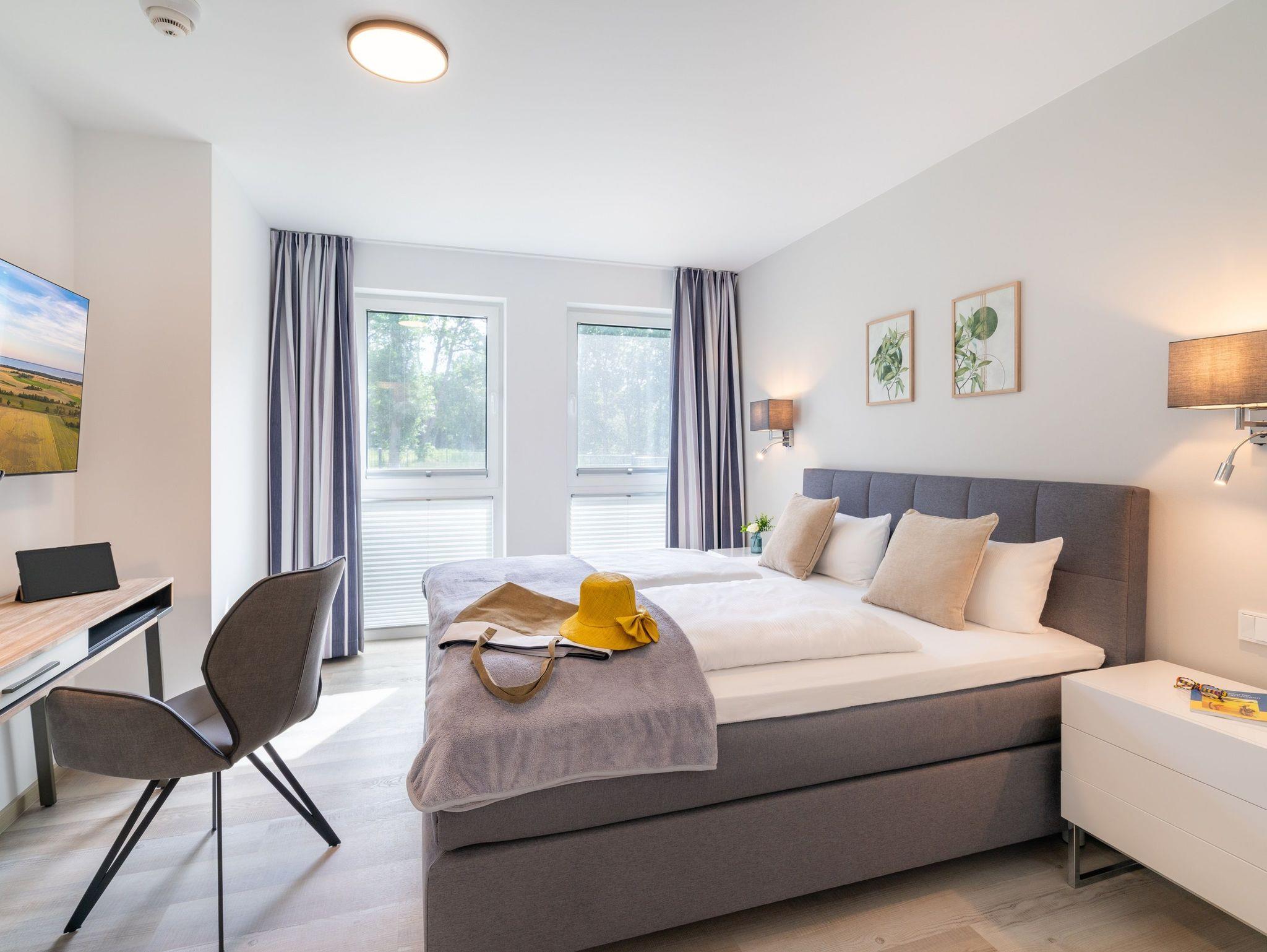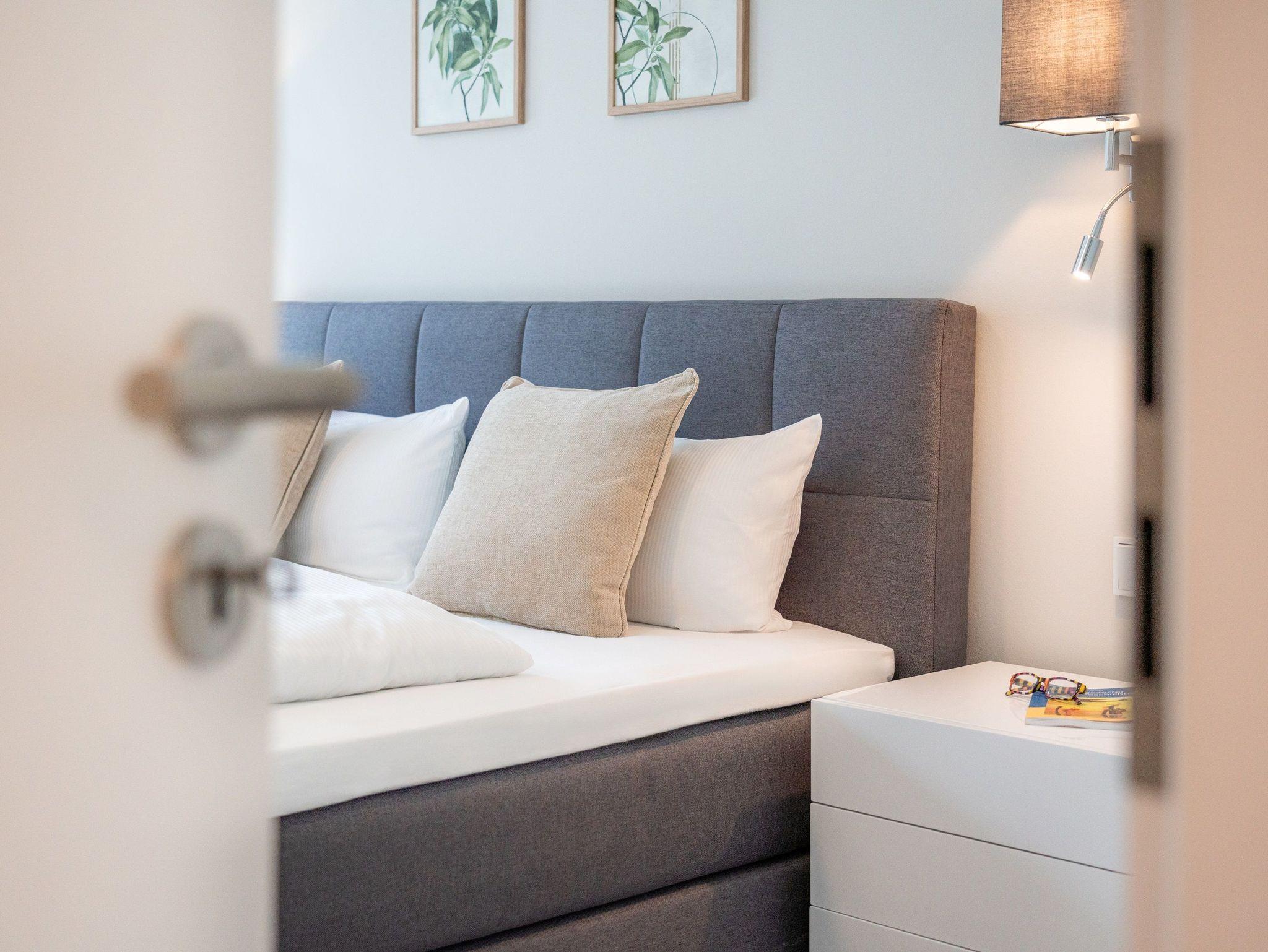 Im zweiten Schlafzimmer finden Sie ebenfalls ein komfortables Boxspringbett (180 x 200 cm), einen Kleiderschrank, einen Schreibtisch und einen Smart-TV vor.
