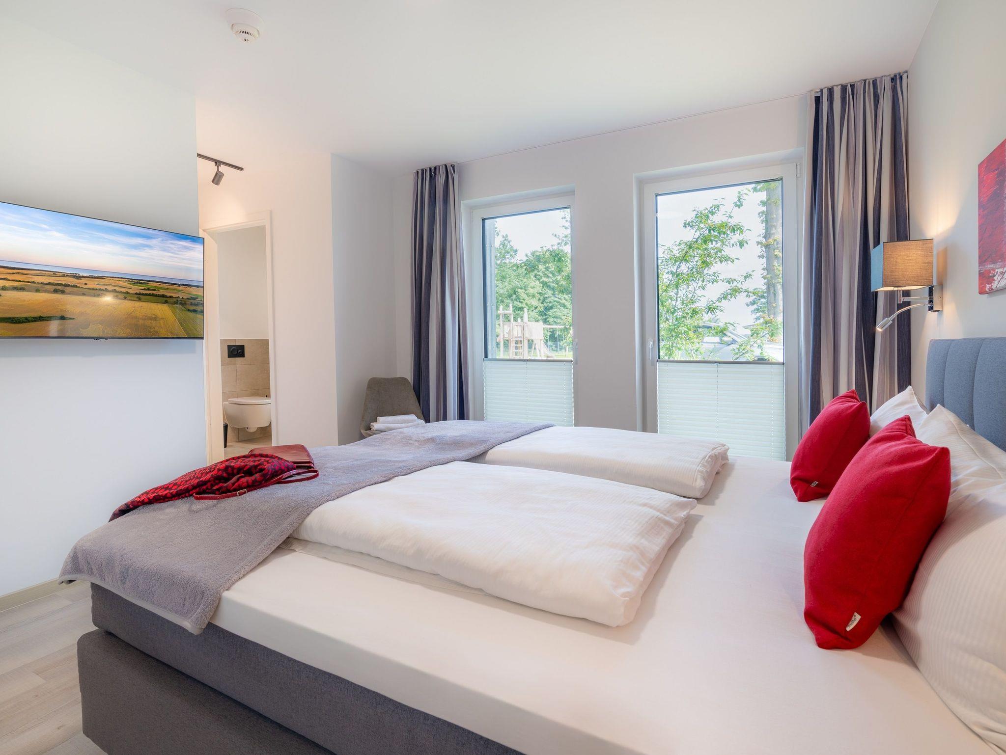 Das Hauptschlafzimmer bietet ein hochwertiges Boxspringbett (180 x 200 cm), einen Kleiderschrank sowie einen Smart-TV. Das en suite Badezimmer mit begehbarer Dusche rundet den Komfort ab.