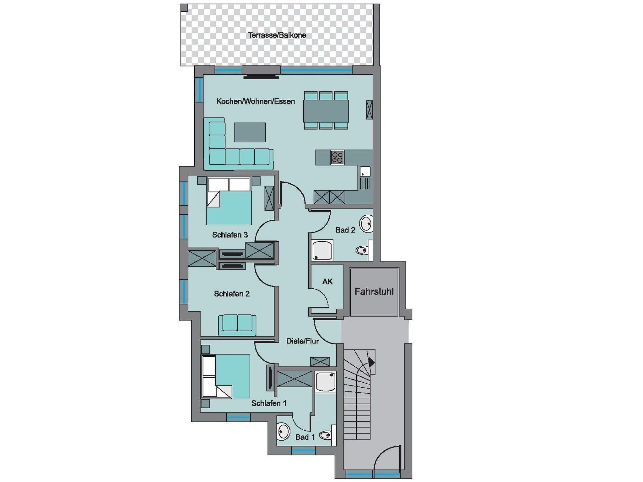 Die barrierefreie und sonnendurchflutete 4-Zimmer-Ferienwohnung liegt im Erdgeschoss des 8-Parteienhauses. Ein Aufzug ist vorhanden, der jede Etage anfährt.