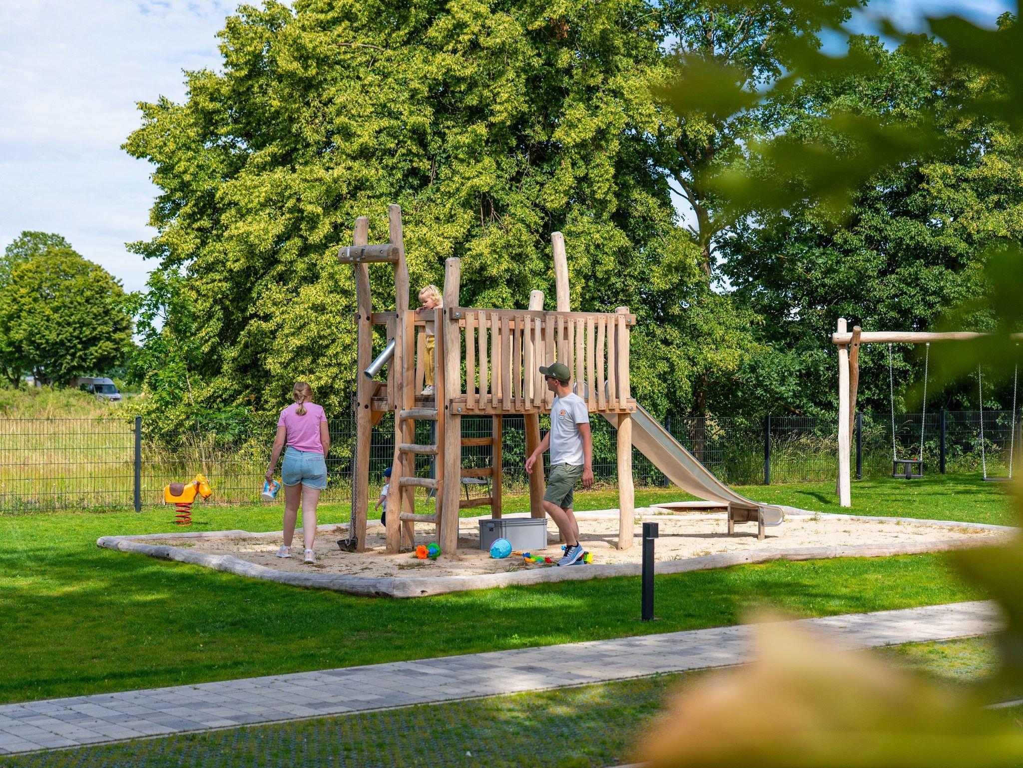 Der vordere, eingezäunte Grundstücksbereich bietet zahlreiche Spielmöglichkeiten für Kinder, darunter eine große Spielanlage mit Rutsche, ein Sandkasten sowie eine Sandbaustelle, ein Wipptier, eine Kinderschaukel und ein Drehkarussell. Zahlreiche Sitzgelegenheiten laden zum Verweilen und Sonne tanken ein.