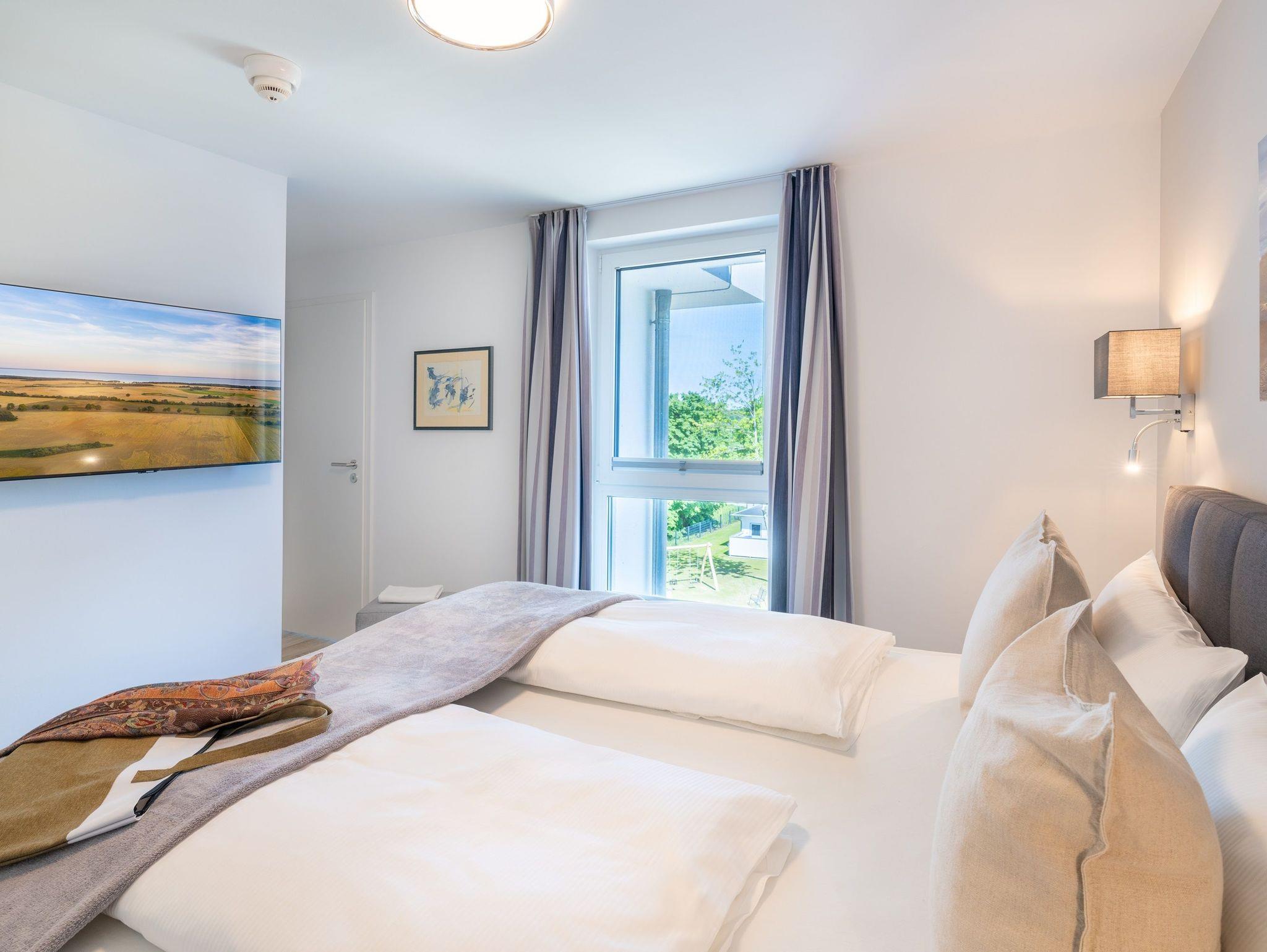 Im zweiten Schlafzimmer finden Sie ebenfalls ein komfortables Boxspringbett (180 x 200 cm), einen Kleiderschrank, einen Schreibtisch und einen Smart-TV vor.