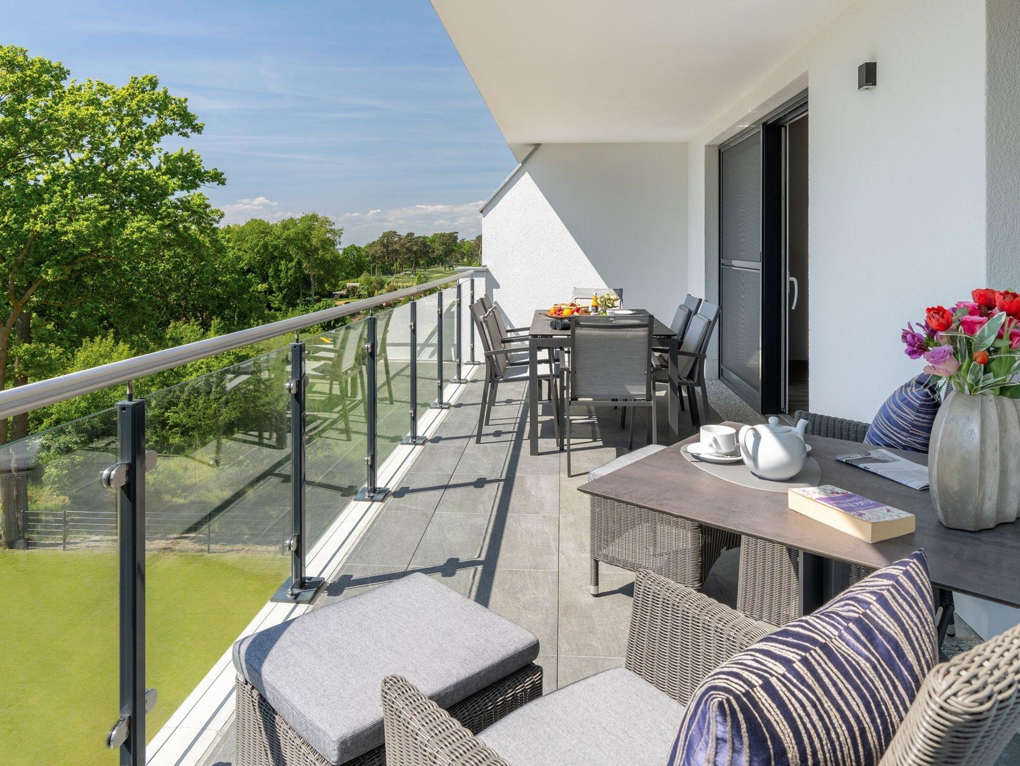 Der 18 m² große, überdachte Sonnenbalkon bietet reichlich Platz für Entspannung und Geselligkeit. Ein großer Esstisch mit sechs Stühlen lädt zu gemeinsamen Mahlzeiten ein, während die gemütliche Sitzgruppe mit Bistrotisch und zwei verstellbaren Relaxsesseln samt Fußhockern perfekte Plätze für entspannte Stunden bieten.