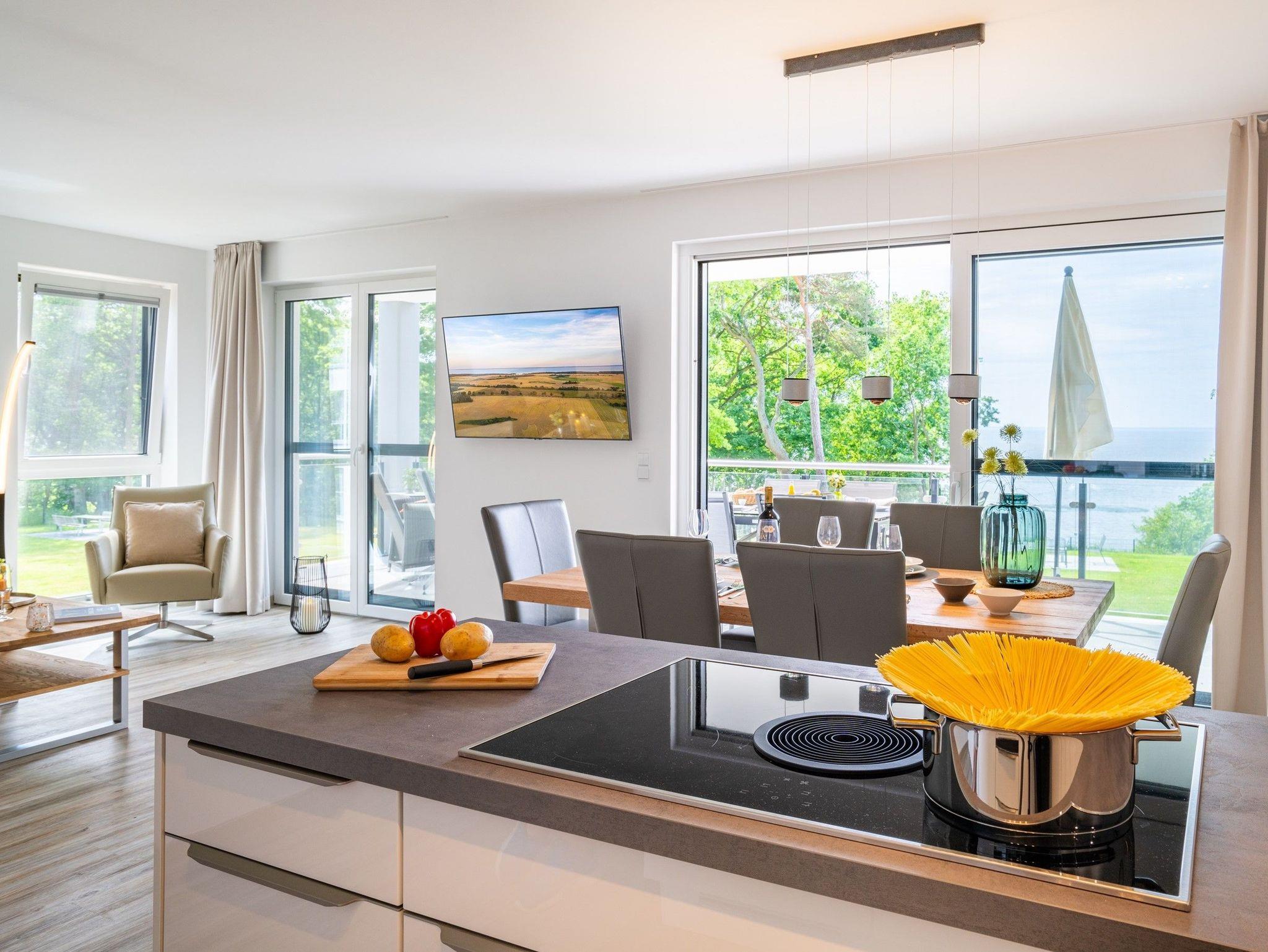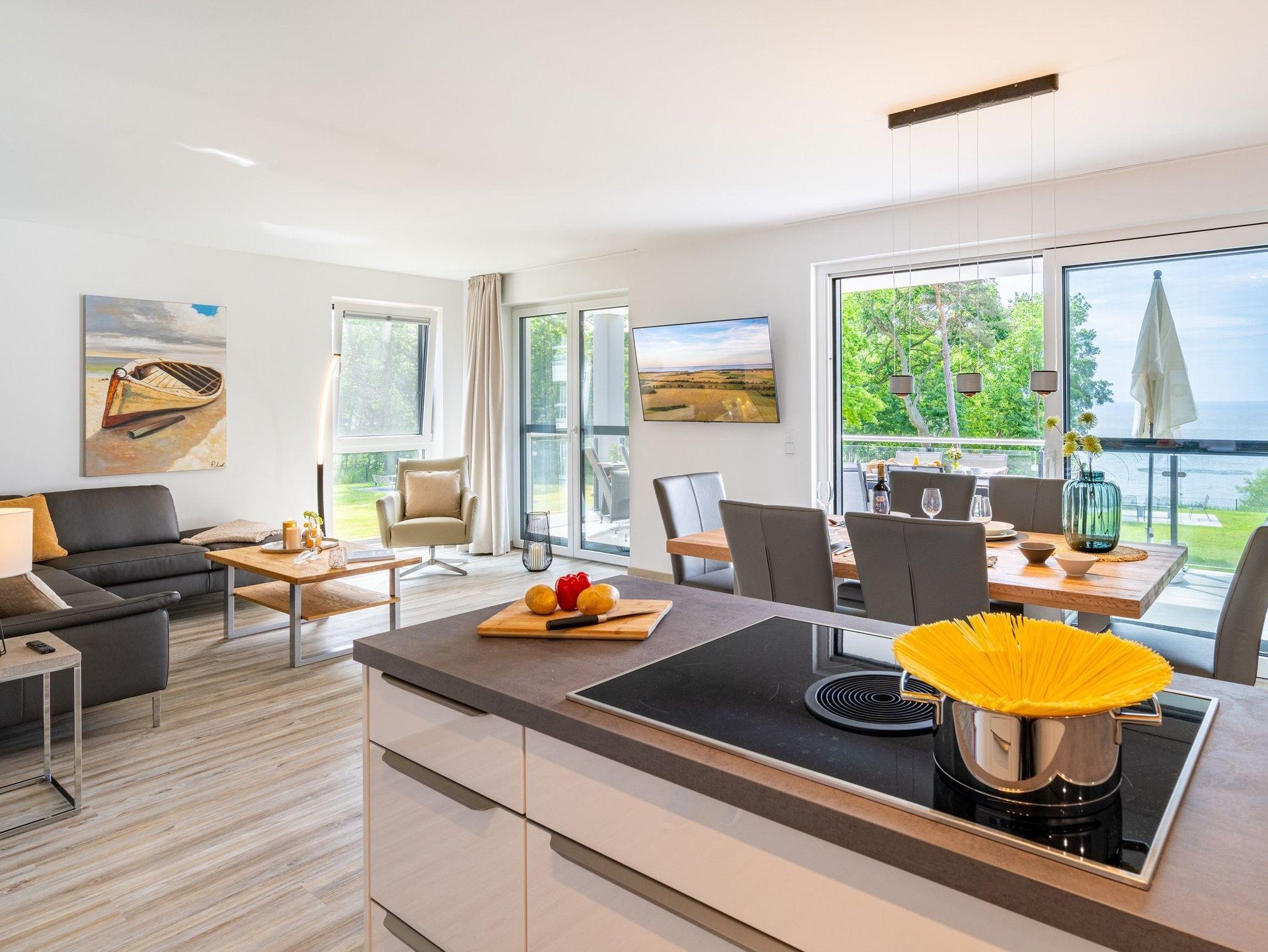 Das Induktionskochfeld mit Bora-Abzug ermöglicht Ihnen beim Kochen einen ungestörten Blick auf das Wasser ? einfach fantastisch!