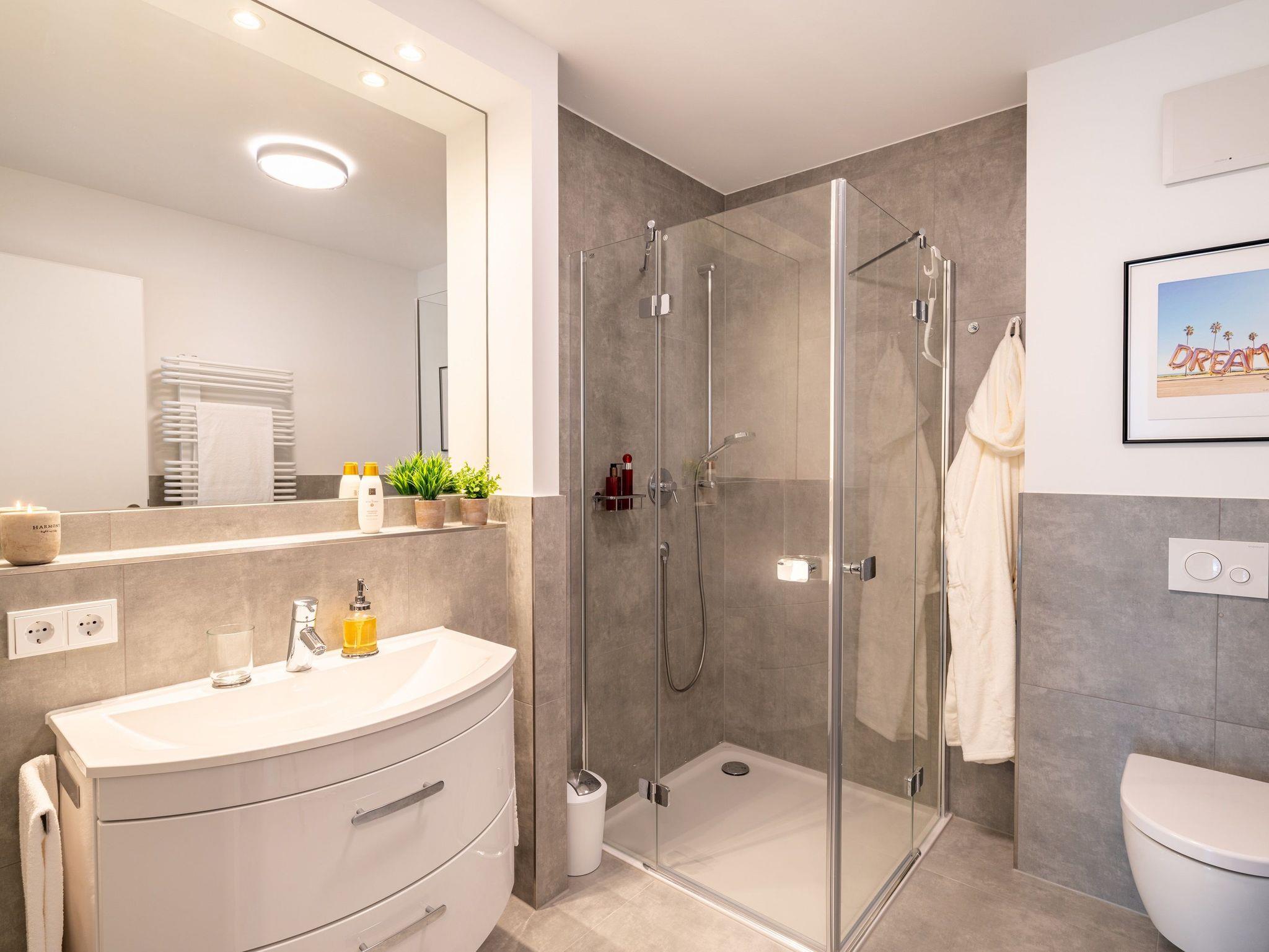 Im zweiten, voll ausgestatteten Badezimmer steht Ihnen eine großzügige Ganzglas-Duschkabine mit den Maßen 90 x 90 cm zur Verfügung.