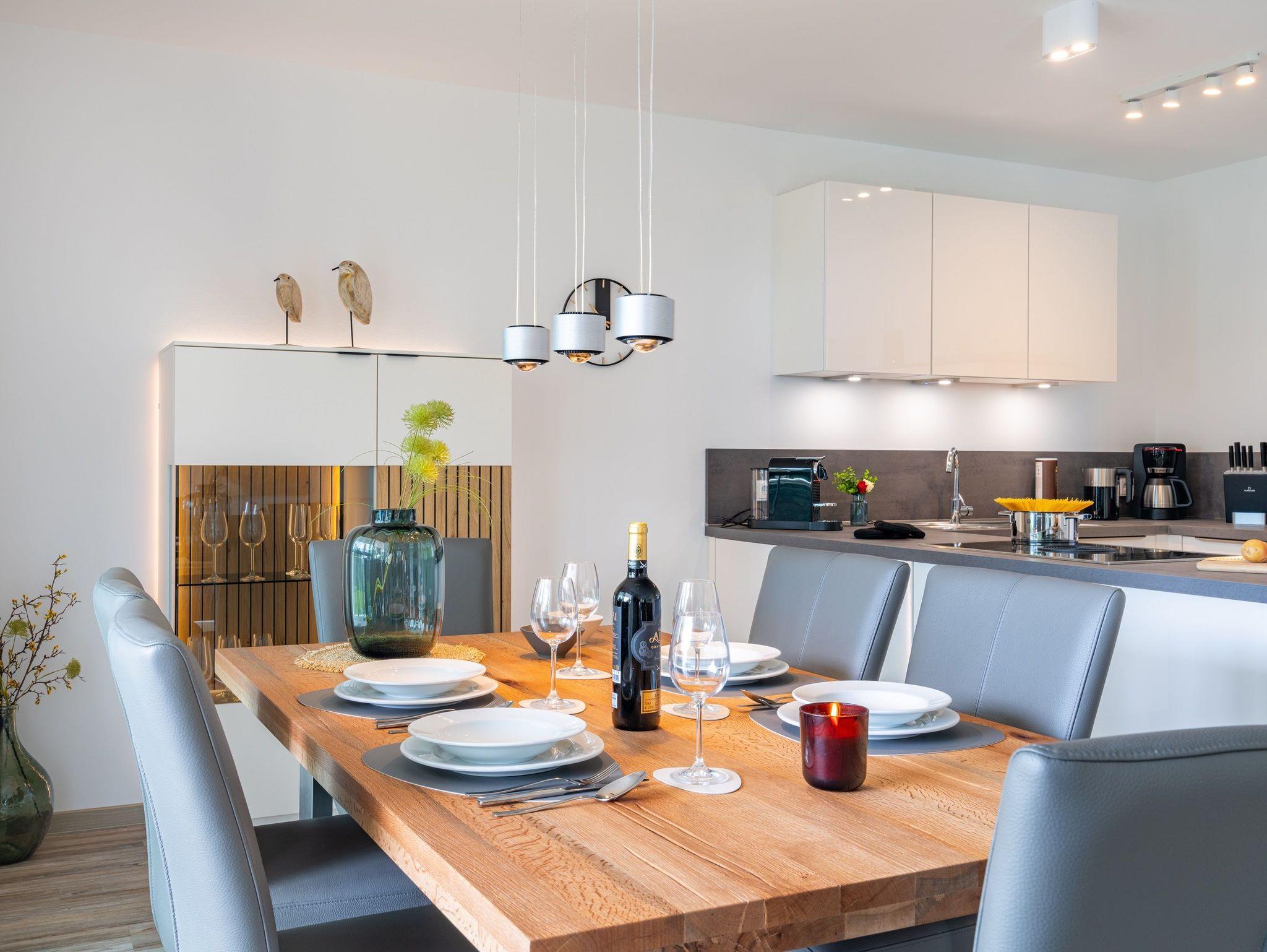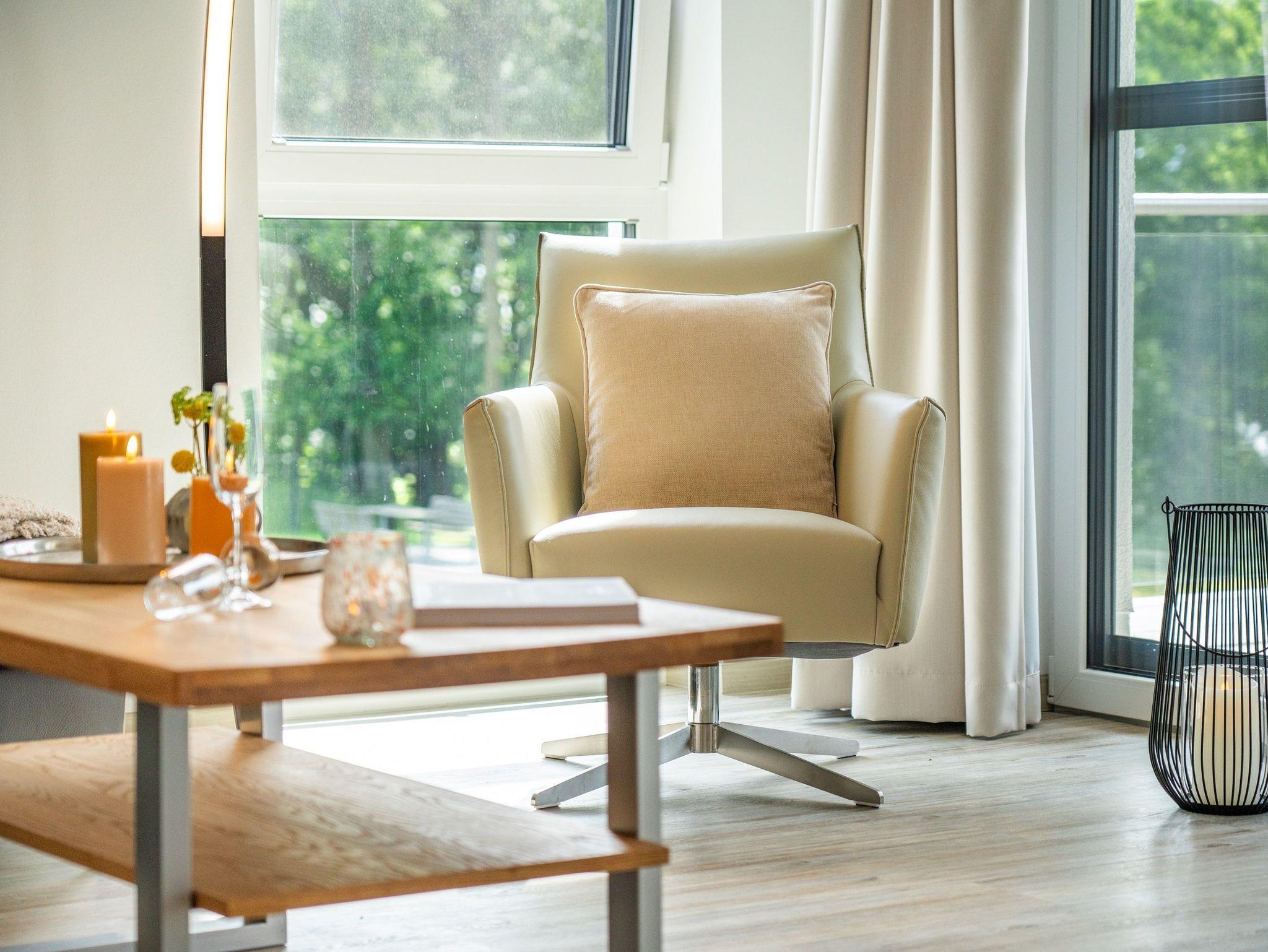 Diese im Jahr 2024 fertiggestellte Ferienwohnung verfügt über eine Wohnfläche von 115 m² und befindet sich im Haus 8, das etwa 400 Meter von den anderen „Oase am Haff“-Häusern entfernt auf einem separaten Grundstück in gleicher Südlage liegt.