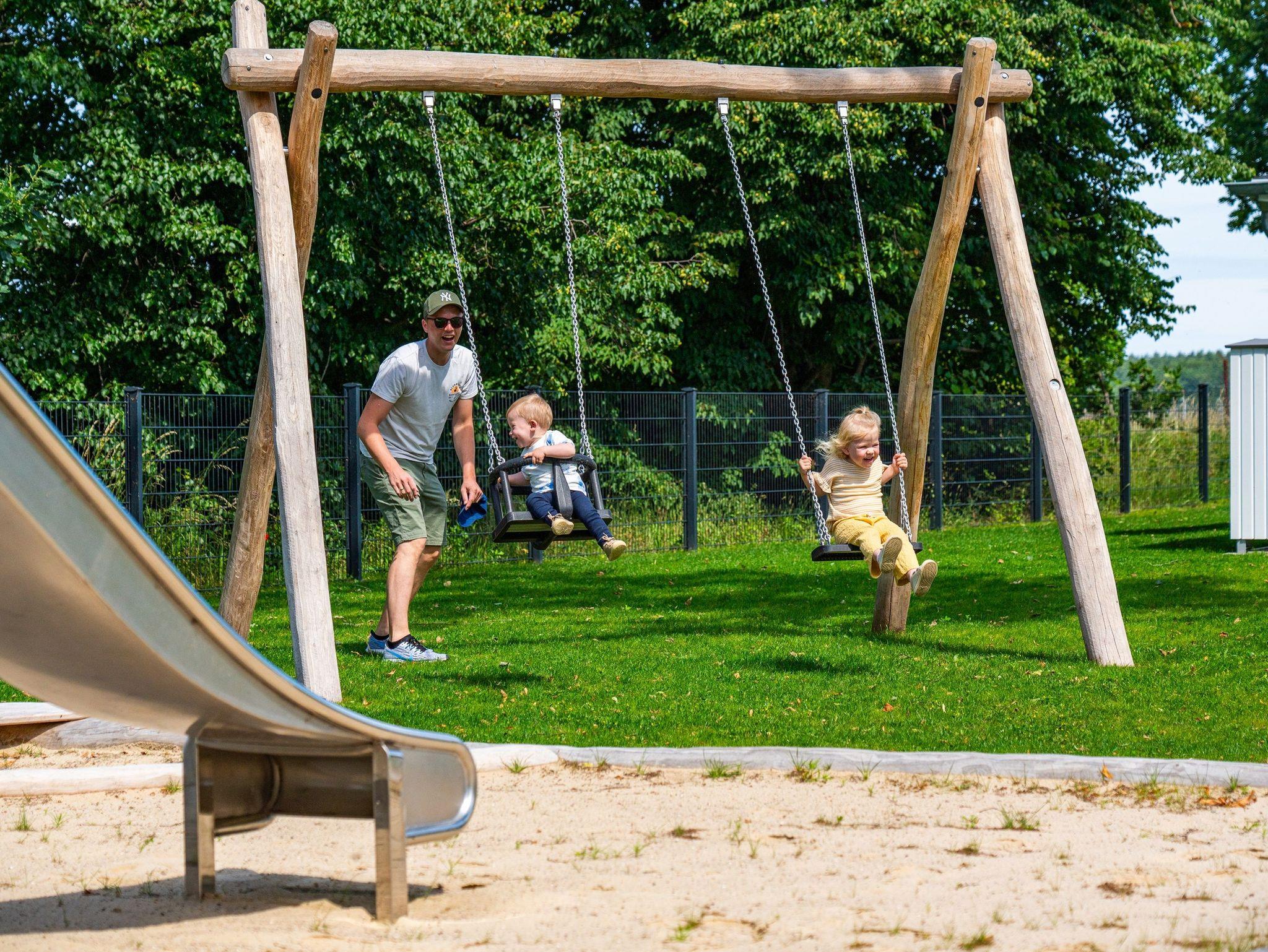 Der vordere, eingezäunte Grundstücksbereich bietet zahlreiche Spielmöglichkeiten für Kinder, darunter eine große Spielanlage mit Rutsche, ein Sandkasten sowie eine Sandbaustelle, ein Wipptier, eine Kinderschaukel und ein Drehkarussell. Zahlreiche Sitzgelegenheiten laden zum Verweilen und Sonne tanken ein.