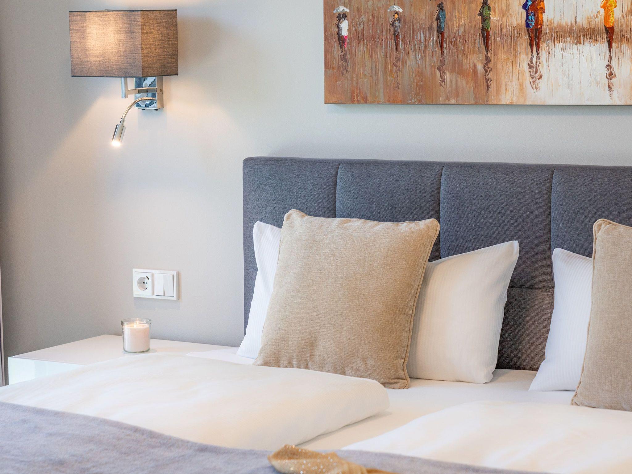 Informationen für Gäste mit Mobilitätseinschränkung: Der Zugang vom Carportstellplatz bis zum Hauseingang ist barrierefrei gestaltet. Direkt vor dem Haus befindet sich eine Kurzzeitparkfläche, die für Be- und Entladevorgänge genutzt werden kann. Die Distanz von der Carportanlage bis zur Hauseingangstür beträgt etwa 30 Meter. Die Breite der Haustür beträgt 100 cm und weist eine Schwelle von etwa 1,5 cm Höhe auf. Der Aufzug im Treppenhaus bedient alle Etagen des Hauses, einschließlich des Freizeit- und Saunabereichs im Untergeschoss. Die Türbreite des Aufzugs beträgt 90 cm, die Tiefe liegt bei 130 cm. Die schwellenlose Wohnungstür weist eine Breite von 90 cm auf. Die Breiten der schwellenlosen Zimmertüren liegen bei 80 cm (Ausnahme: Türbreite von der Abstellkammer beträgt 70 cm). Der schwellenlose Duscheingang im en suite Badezimmer weist eine Breite von 90 cm auf, die Tiefe liegt bei 200 cm. Auf Wunsch kann ein Duschhocker kostenfrei zur Verfügung gestellt werden. Die Waschtische sind nicht unterfahrbar und Haltegriffe sind nicht in den Badezimmern vorhanden. Der Duscheingang im zweiten Badezimmer weist eine Breite von 80 cm auf. Die Höhe der Duschtasse beträgt 2 cm. Die Betten weisen eine Höhe von 65 cm auf und sind unterfahrbar (max. 10 cm). Die Balkonschiebetür lässt sich auf eine Breite von 130 cm öffnen, die Höhe der Schwelle beträgt 1,5 cm. Die Sauna im Untergeschoss ist schwellenlos erreichbar. Die Schwelle am Saunaeingang beträgt 10 cm, die Breite der Saunatür beträgt 60 cm. Die Breite der Tür zum Ruheraum beträgt 90 cm und weist eine Schwelle von etwa 2 cm auf.