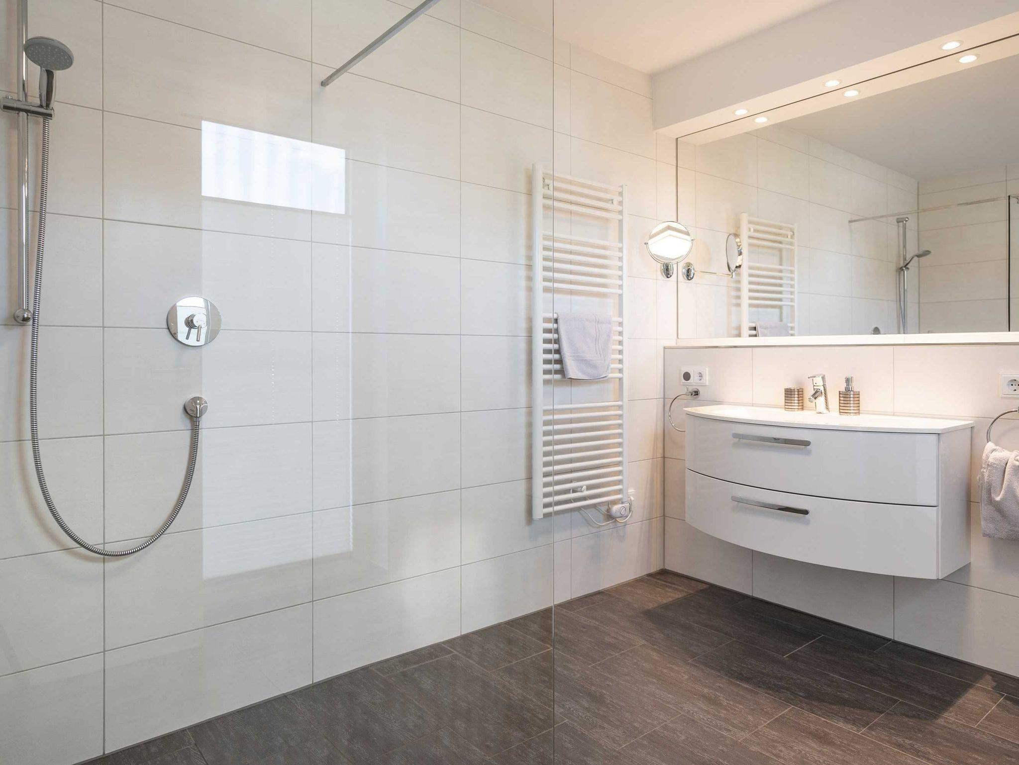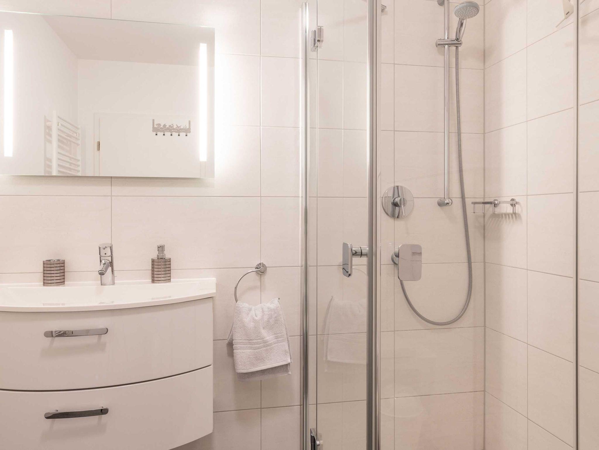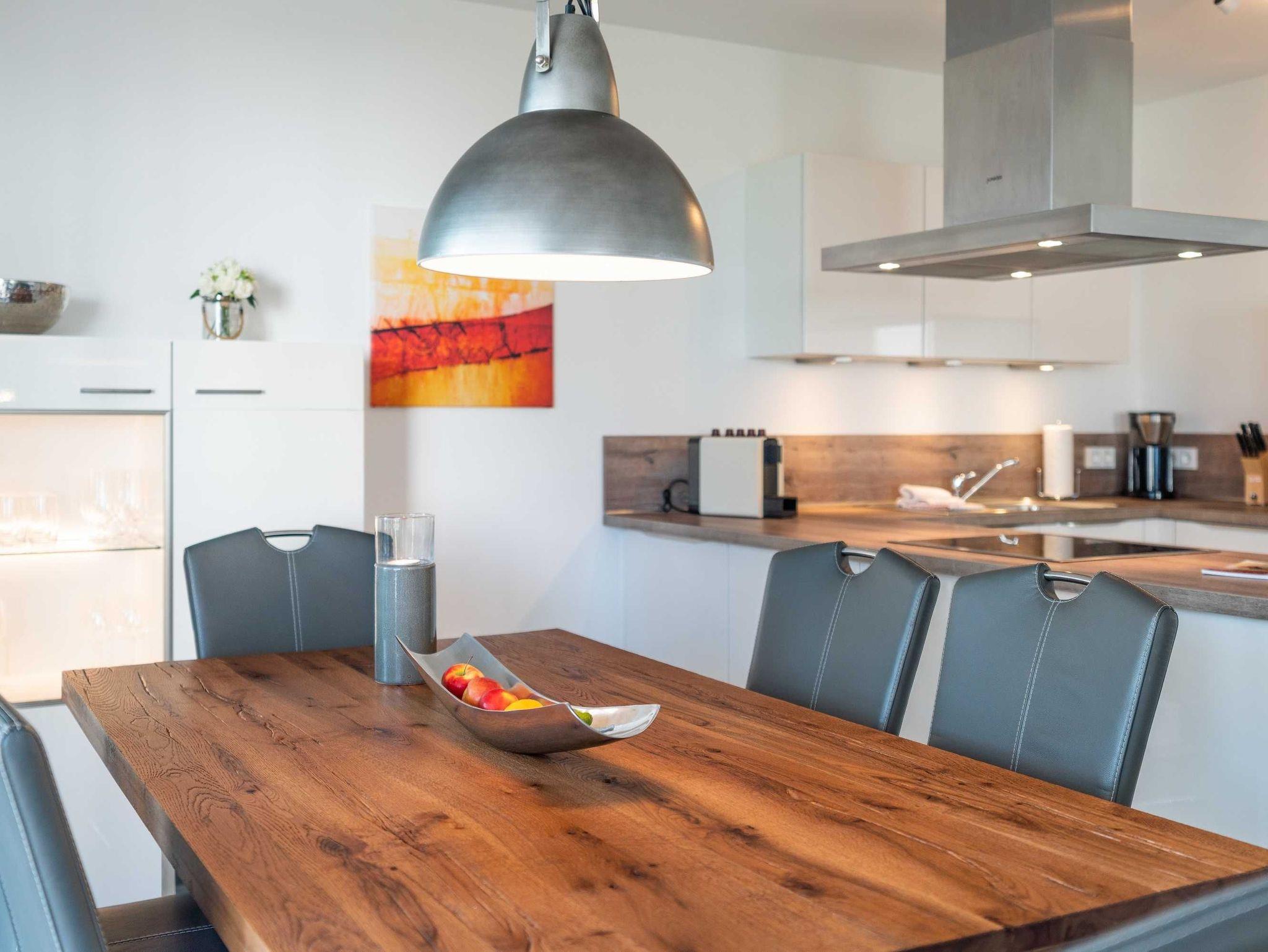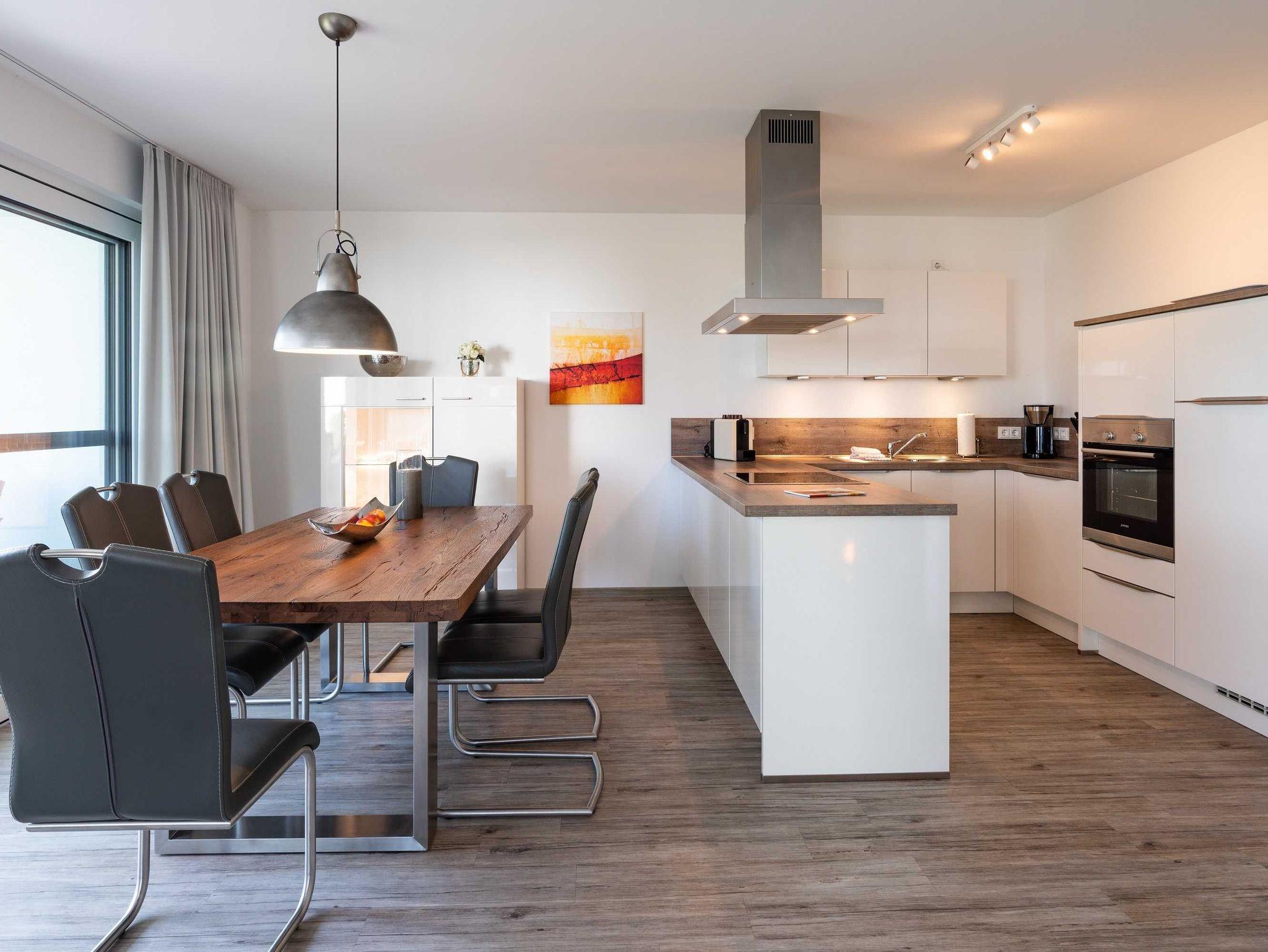 Diese luxuriöse 4-Zimmer-Wohnung im Erdgeschoss von Haus 1 mit Platz für maximal 6 Personen sowie einem Kleinkind bis 2 Jahre im Babybett verfügt über eine Wohnfläche von 119 m² und hat 3 Schlafzimmer sowie 2 voll ausgestattete Duschbäder. Die große Sonnenterrasse mit 21 m² liegt in idealer Süd-Ausrichtung. Die Wohnung ist modern eingerichtet mit offenem Wohn-Essbereich, großem Esstisch, Ledersofa sowie Flat-TV (inkl. Sky-Abo). Die hochwertig ausgestattete Küche, offen zum Wohnbereich, lässt keine Wünsche offen. Erholsamer Schlaf in den beiden Schlafzimmern mit Boxspringbetten und Flat-TV ist garantiert. Im dritten Schlafzimmer befindet sich ein bequemes Schlafsofa (Liegefläche: 1,80 x 2,00 m) und ein Flat-TV. Das Badezimmer en Suite ist mit einer begehbaren Dusche ausgestattet. Auf der großen, überdachten Sonnenterrasse mit Essgruppe und jeweils zwei Relax-Sesseln mit Fußhockern sowie einem Sonnenschirm können Sie die Seele baumeln lassen.