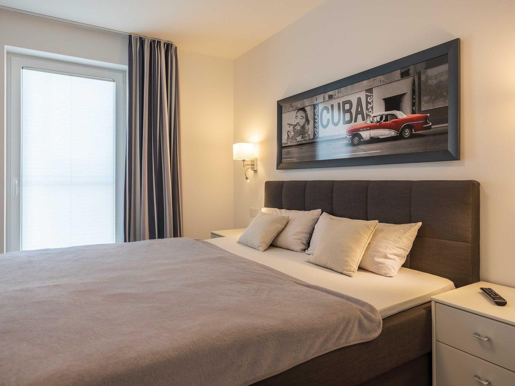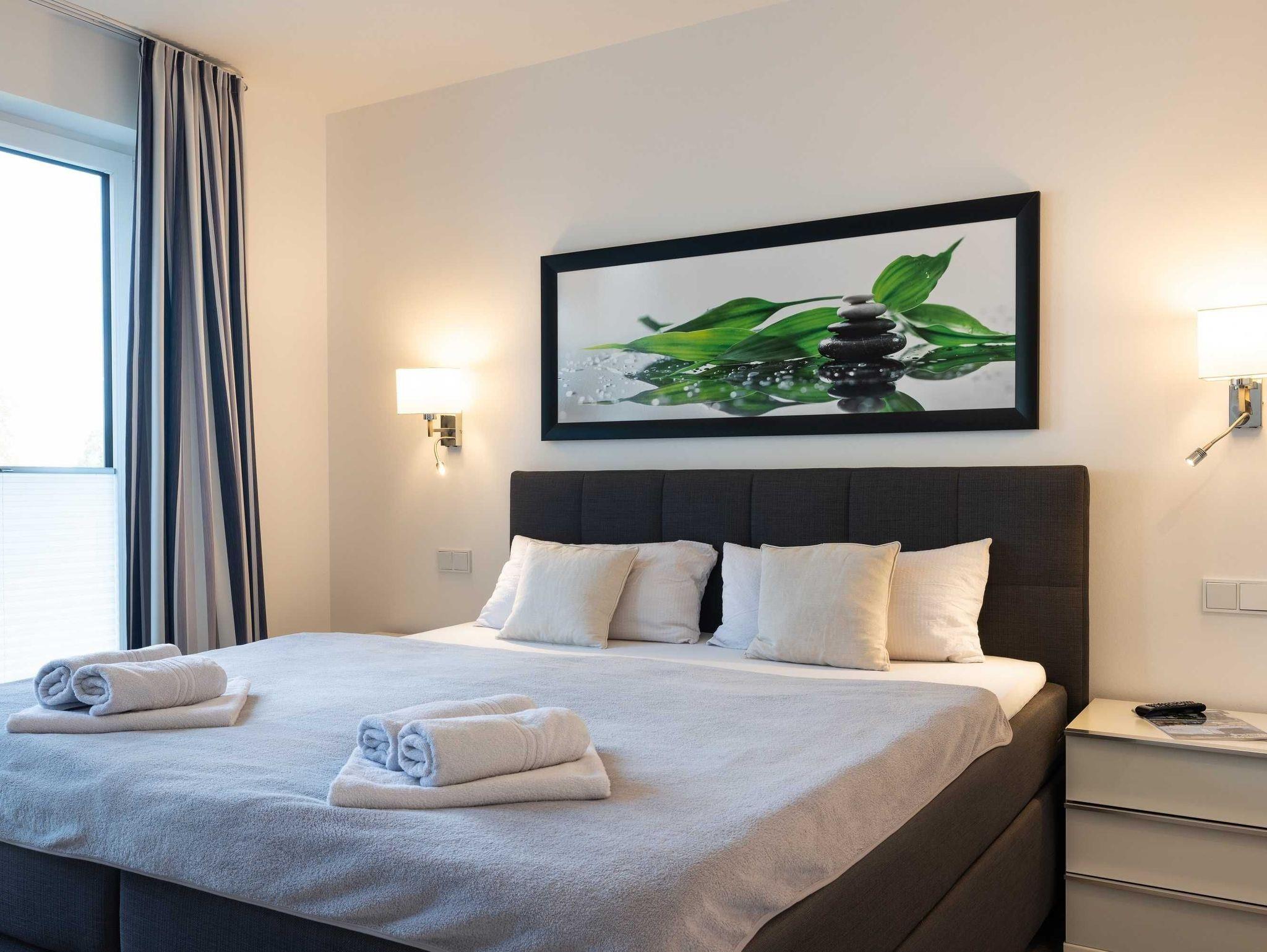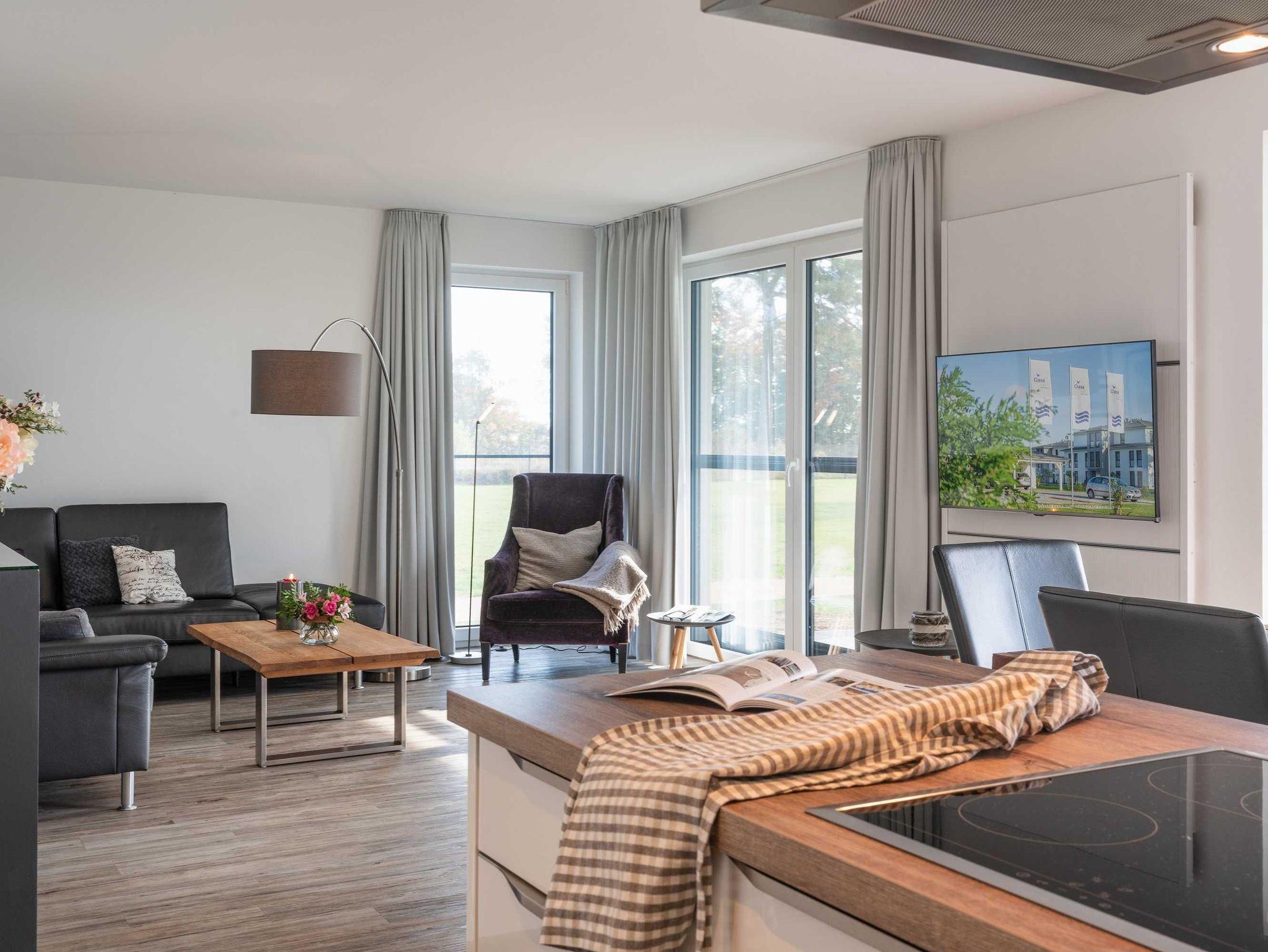 Diese luxuriöse 4-Zimmer-Wohnung im Erdgeschoss von Haus 2 mit Platz für maximal 6 Personen sowie einem Kleinkind bis 2 Jahre im Babybett verfügt über eine Wohnfläche von 119 m² und hat 3 Schlafzimmer sowie 2 voll ausgestattete Duschbäder. Die große Sonnenterrasse mit 21 m² liegt in idealer Süd-Ausrichtung. Die Wohnung ist modern eingerichtet mit offenem Wohn-Essbereich, großem Esstisch, Ledersofa sowie Flat-TV (inkl. Sky-Abo). Die hochwertig ausgestattete Küche, offen zum Wohnbereich, lässt keine Wünsche offen. Erholsamer Schlaf in den beiden Schlafzimmern mit Boxspringbetten und Flat-TV ist garantiert. Im dritten Schlafzimmer befindet sich ein bequemes Schlafsofa (Liegefläche: 1,80 x 2,00 m) und ein Flat-TV. Das Badezimmer en Suite ist mit einer begehbaren Dusche ausgestattet. Auf der großen, überdachten Sonnenterrasse mit Essgruppe und jeweils zwei Relax-Sesseln, Fußhockern, Sonnenschirm und Sonnenliegen können Sie die Seele baumeln lassen.