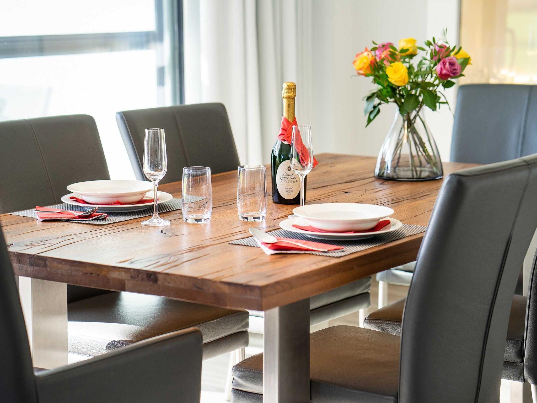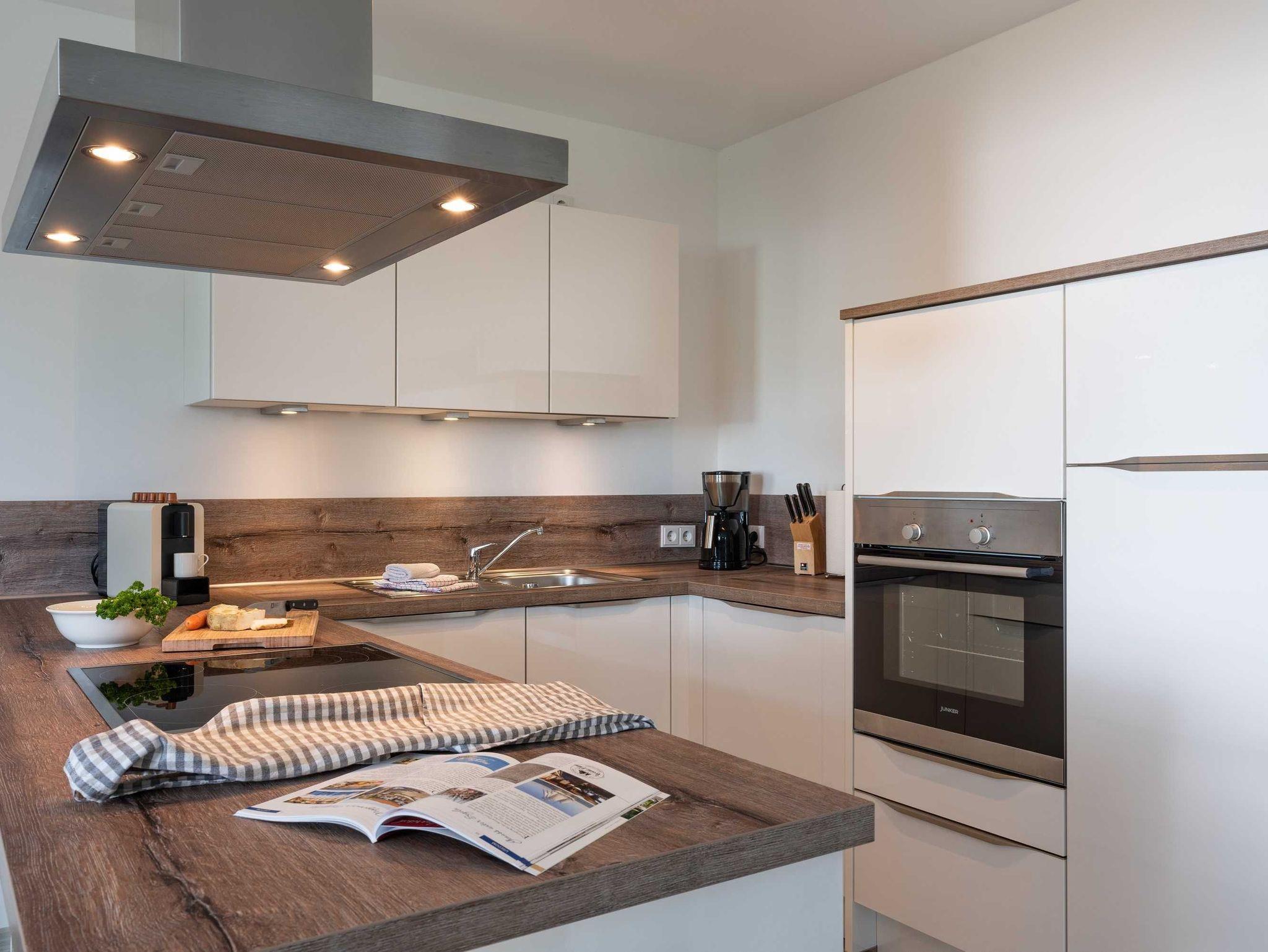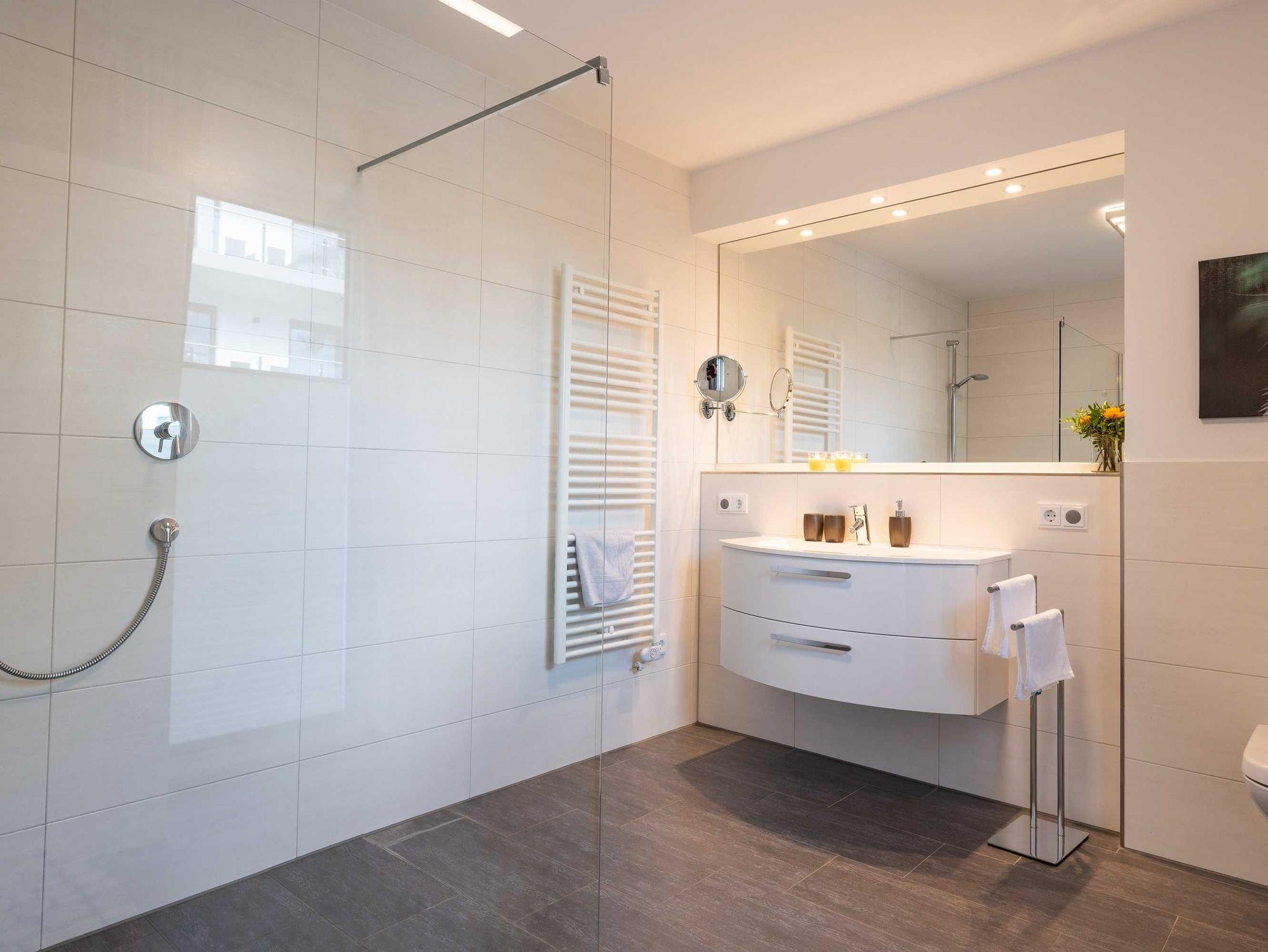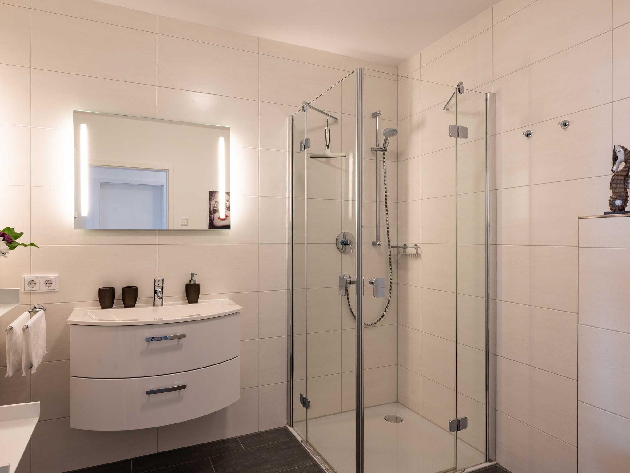 Diese luxuriöse 4-Zimmer-Wohnung im Erdgeschoss von Haus 2 mit Platz für maximal 6 Personen sowie einem Kleinkind bis 2 Jahre im Babybett verfügt über eine Wohnfläche von 119 m² und hat 3 Schlafzimmer sowie 2 voll ausgestattete Duschbäder. Die große Sonnenterrasse mit 21 m² liegt in idealer Süd-Ausrichtung. Die Wohnung ist modern eingerichtet mit offenem Wohn-Essbereich, großem Esstisch, Ledersofa sowie Flat-TV (inkl. Sky-Abo). Die hochwertig ausgestattete Küche, offen zum Wohnbereich, lässt keine Wünsche offen. Erholsamer Schlaf in den beiden Schlafzimmern mit Boxspringbetten und Flat-TV ist garantiert. Im dritten Schlafzimmer befindet sich ein bequemes Schlafsofa (Liegefläche: 1,80 x 2,00 m) und ein Flat-TV. Das Badezimmer en Suite ist mit einer begehbaren Dusche ausgestattet. Auf der großen, überdachten Sonnenterrasse mit Essgruppe und jeweils zwei Relax-Sesseln, Fußhockern, Sonnenschirm und Sonnenliegen können Sie die Seele baumeln lassen.