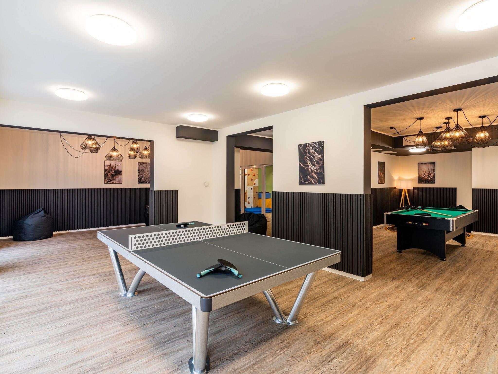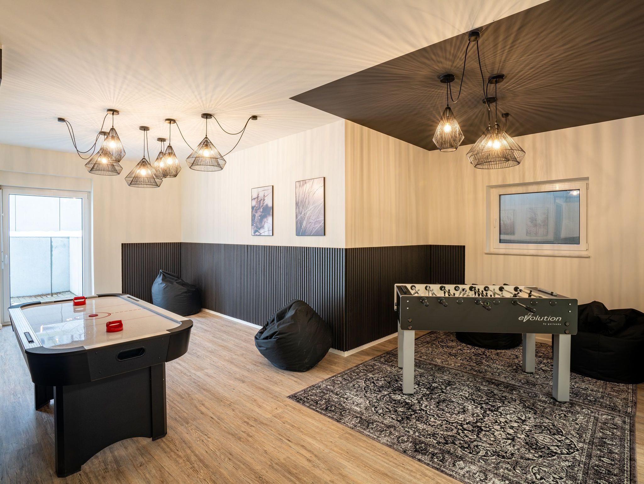 Ihre Kinder dürfen sich auf den vielseitig gestalteten Freizeitbereich (390 m²) im Souterrain des Nachbarhauses (Nr. 3) mit Tischtennis, Airhockey, Spielecke und Kickertisch freuen, der selbst an Schlechtwettertagen keine Langeweile aufkommen lässt. Erwachsene finden am Billardtisch oder in der gemütlichen Lounge-Ecke Ausgleich mit einem guten Buch oder Musik im Ohr.