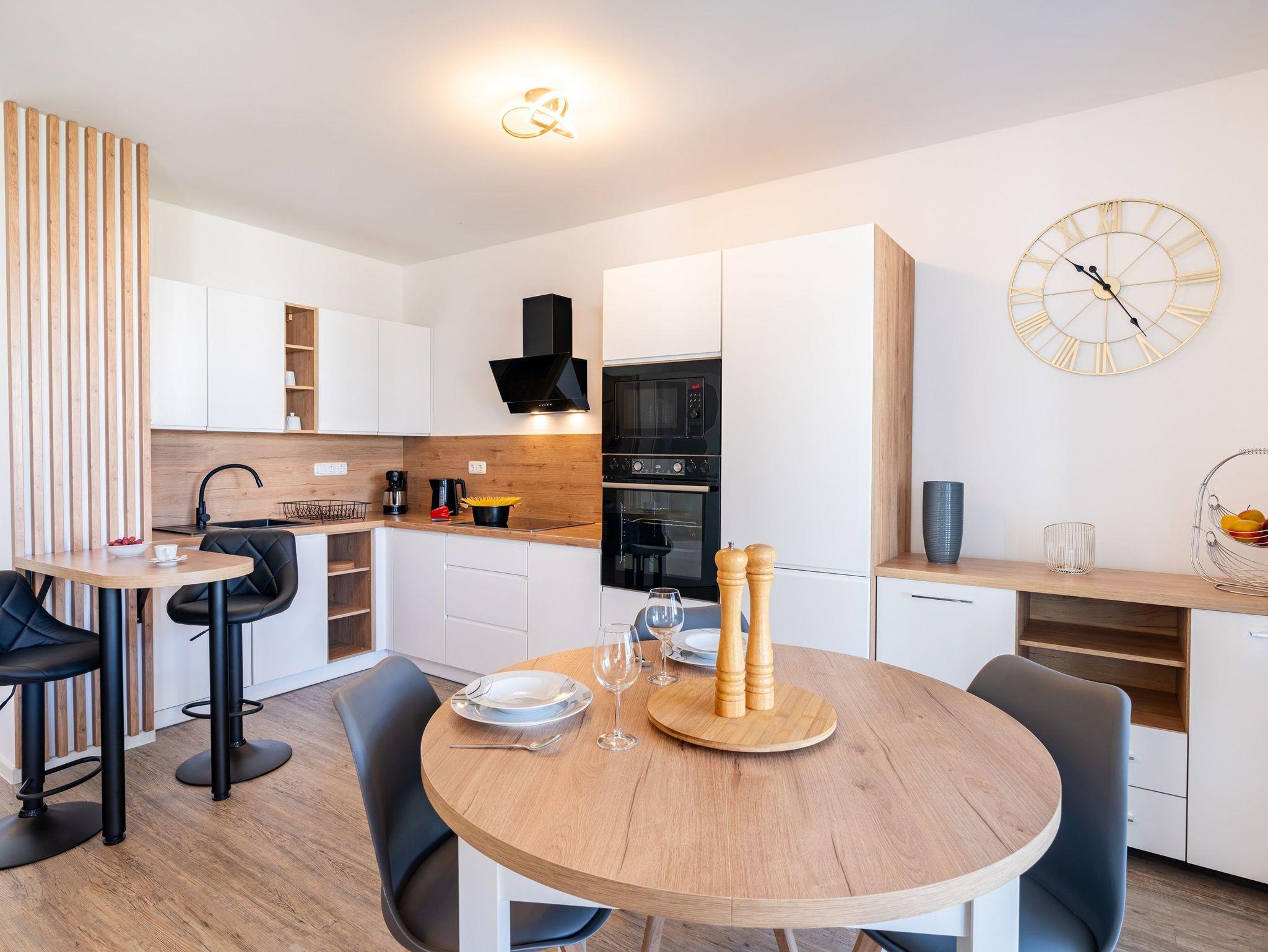 Auf einer Wohnfläche von 70 m² finden drei Erwachsene und ein Kleinkind bis zwei Jahre (im Babybett) in dieser modern eingerichteten Ferienwohnung ausreichend Platz für einen entspannten Urlaub am Stettiner Haff auf Usedom.