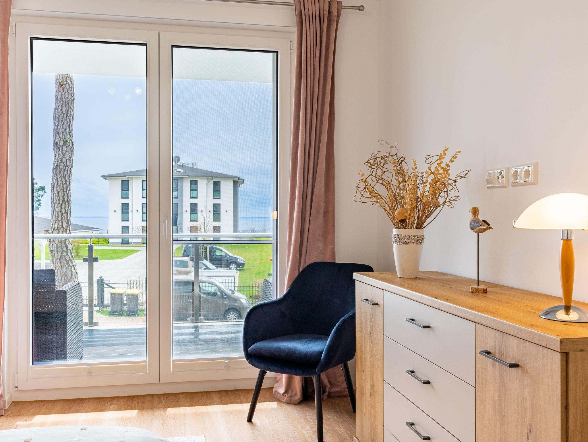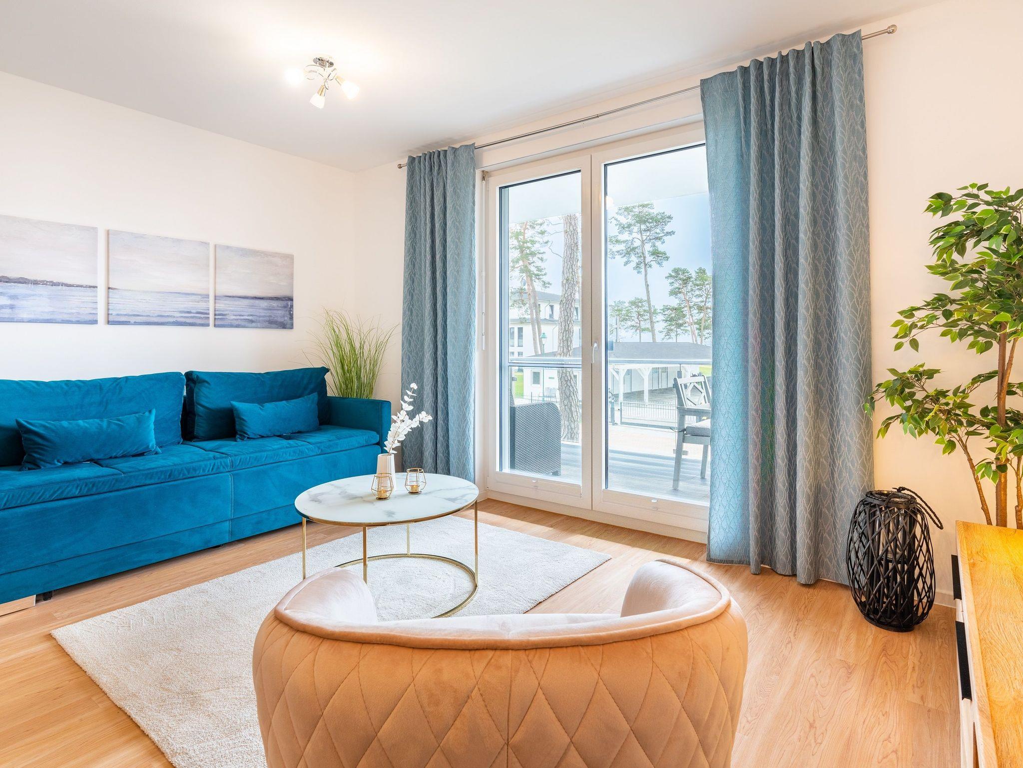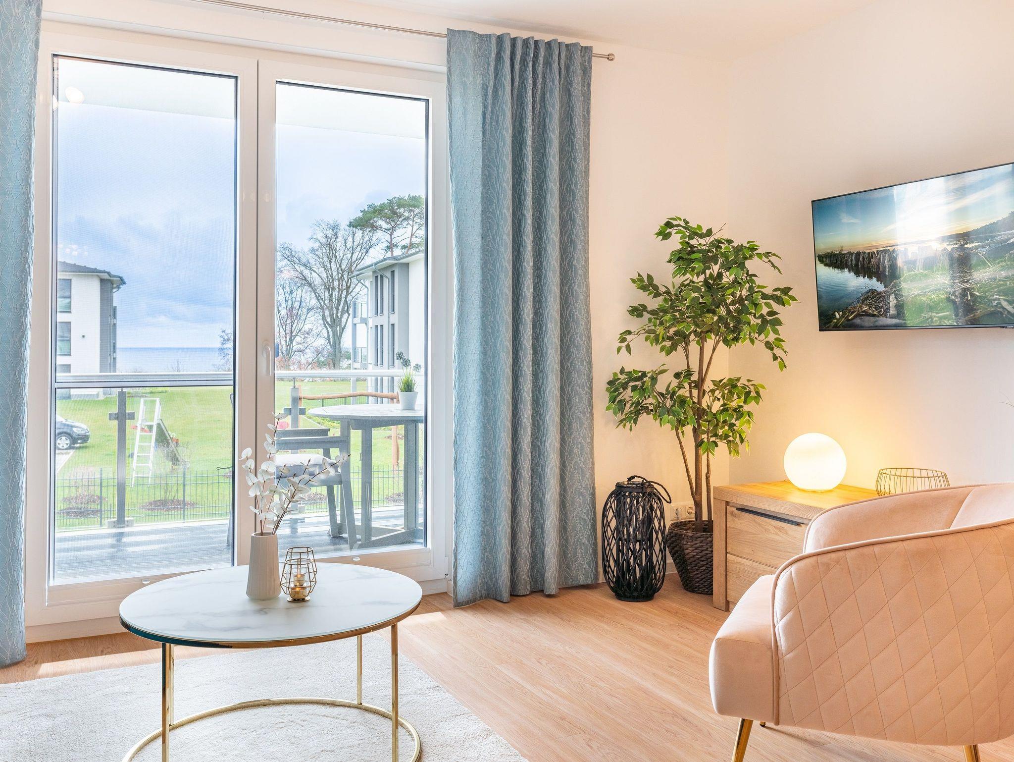 Der offene Wohnbereich ist ausgestattet mit einem gemütlichen Sofa und Smart-TV. Sie haben vom Wohn- und Schlafzimmer aus Zugang zum großen Süd-Balkon. Der möblierte Balkon mit traumhaften Ausblicken auf das Stettiner Haff bietet auch aus der zweiten Reihe einen wunderschönen Ort, um Ihre Mahlzeiten zu genießen und die Aussicht zu bewundern.