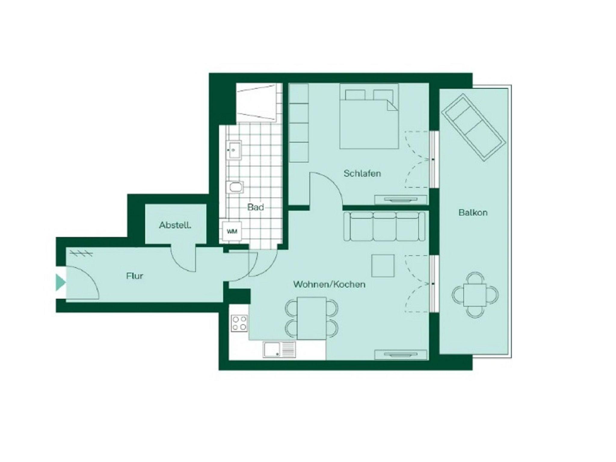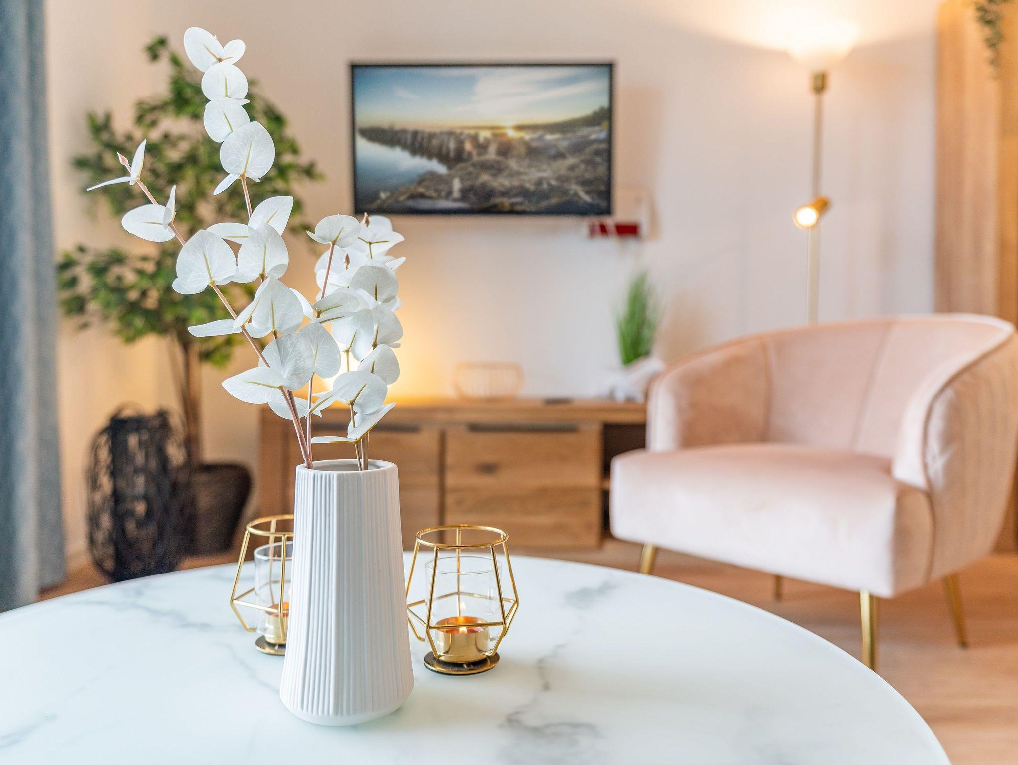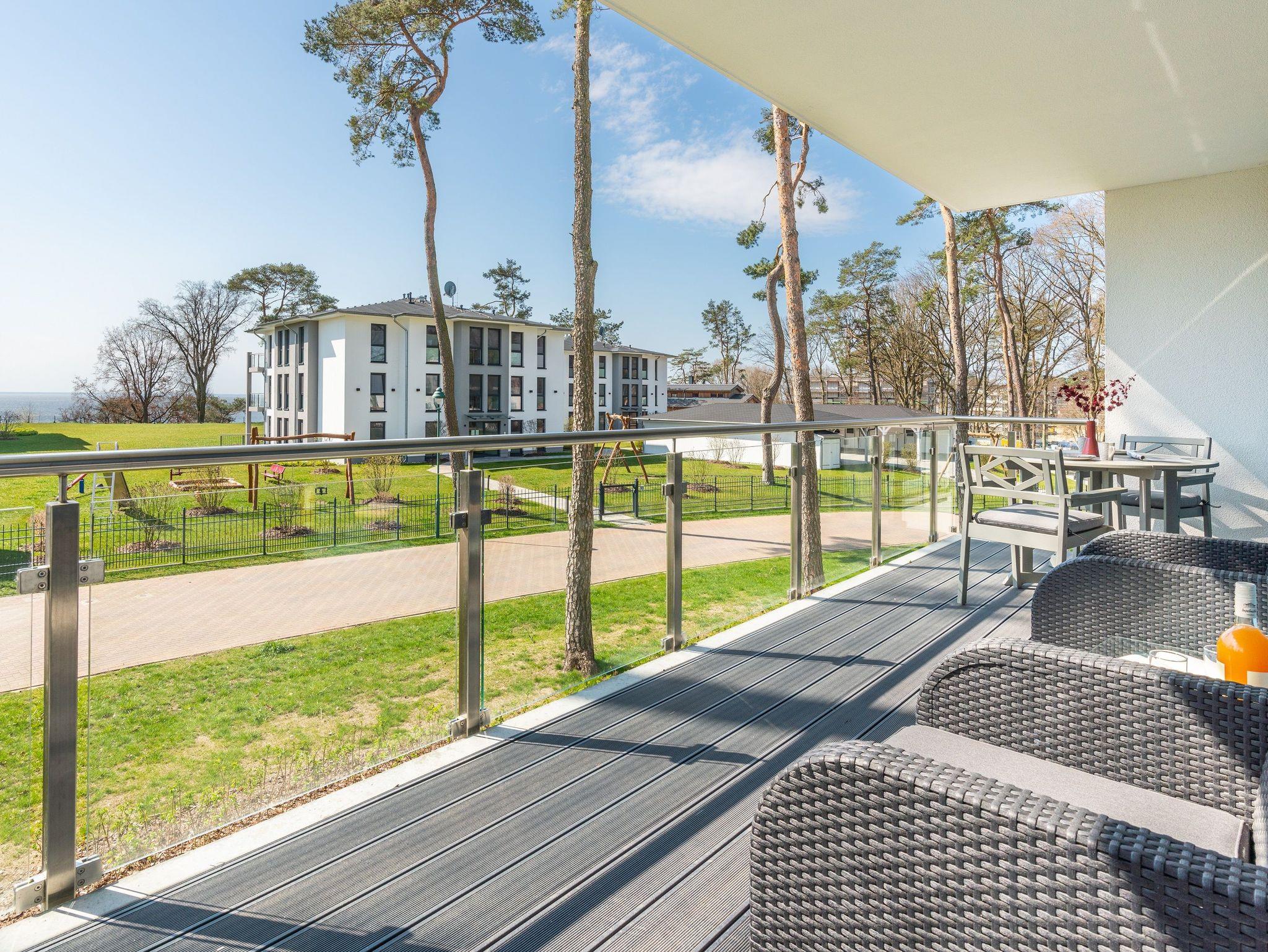 Der offene Wohnbereich ist ausgestattet mit einem gemütlichen Sofa und Smart-TV. Sie haben vom Wohn- und Schlafzimmer aus Zugang zum großen Süd-Balkon. Der möblierte Balkon mit traumhaften Ausblicken auf das Stettiner Haff bietet auch aus der zweiten Reihe einen wunderschönen Ort, um Ihre Mahlzeiten zu genießen und die Aussicht zu bewundern.