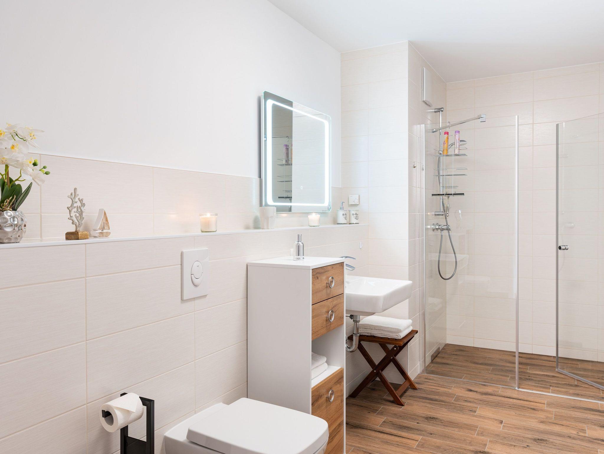 Das Badezimmer ist mit einer ebenerdigen Dusche, WC, Waschtisch und Fön ausgestattet.