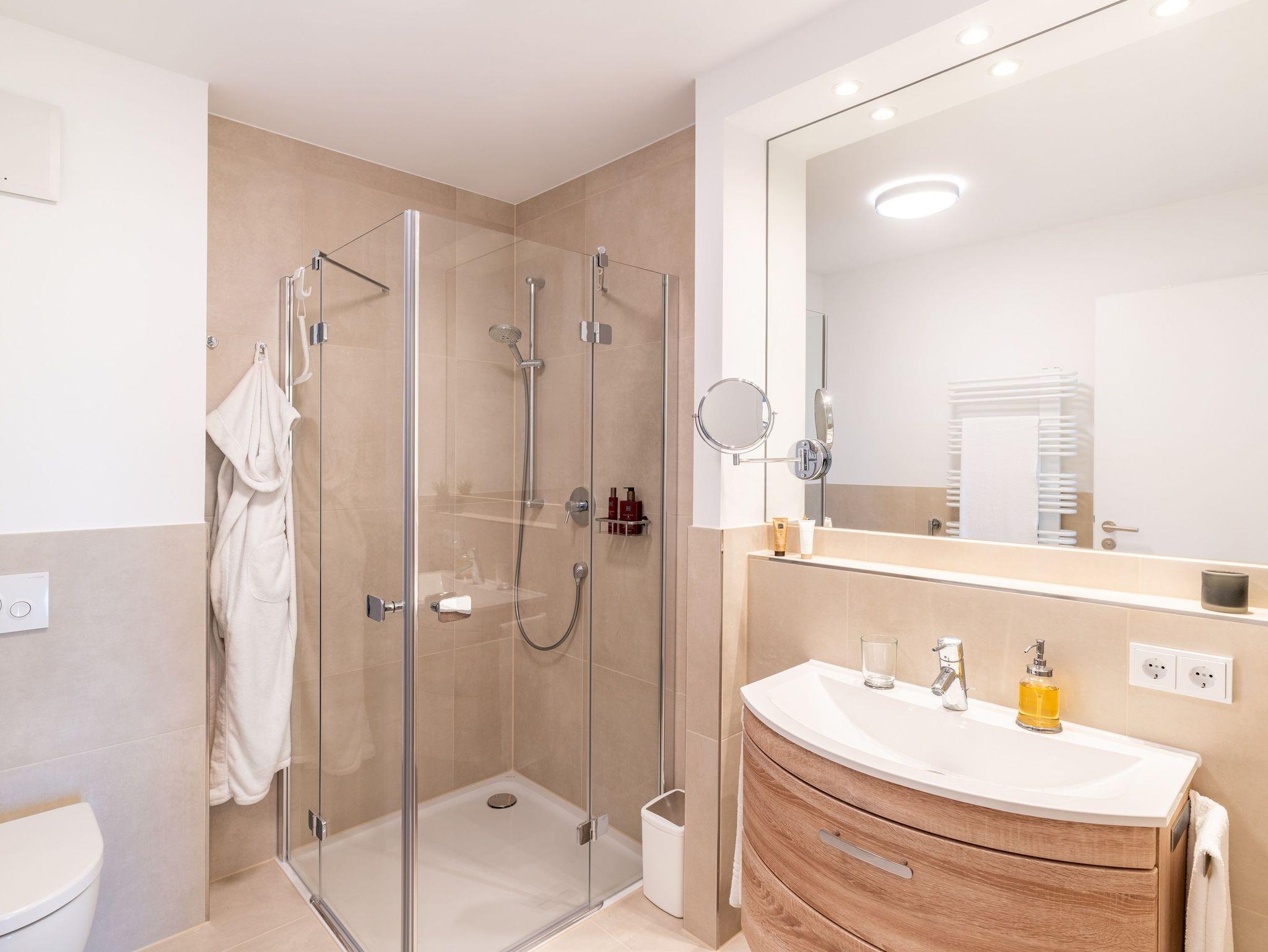 Im zweiten, voll ausgestatteten Badezimmer steht Ihnen eine großzügige Ganzglas-Duschkabine mit den Maßen 90 x 90 cm zur Verfügung.