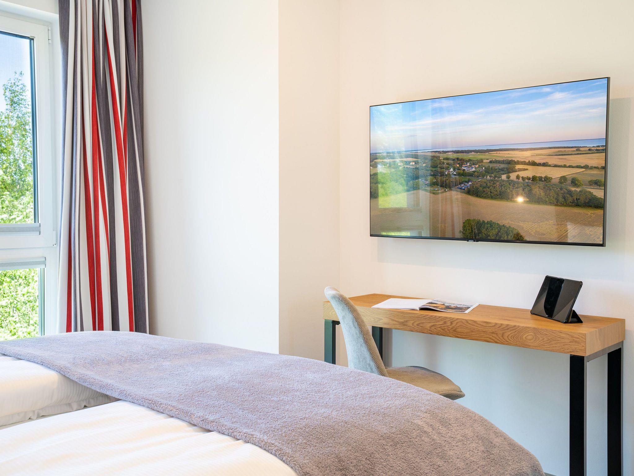 Im zweiten Schlafzimmer finden Sie ebenfalls ein komfortables Boxspringbett (180 x 200 cm), einen Kleiderschrank, einen Schreibtisch und einen Smart-TV vor.