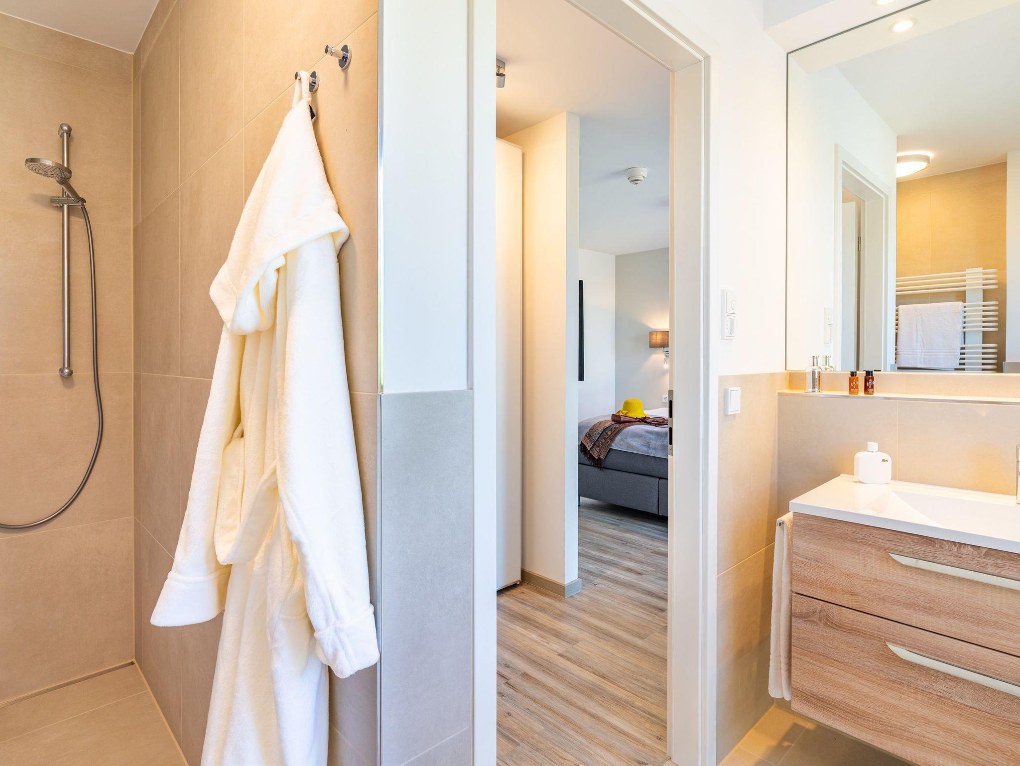 Informationen für Gäste mit Mobilitätseinschränkung: Der Zugang vom Carportstellplatz bis zum Hauseingang ist barrierefrei gestaltet. Direkt vor dem Haus befindet sich eine Kurzzeitparkfläche, die für Be- und Entladevorgänge genutzt werden kann. Die Distanz von der Carportanlage bis zur Hauseingangstür beträgt etwa 30 Meter. Die Breite der Haustür beträgt 100 cm und weist eine Schwelle von etwa 1,5 cm Höhe auf. Der Aufzug im Treppenhaus bedient alle Etagen des Hauses, einschließlich des Freizeit- und Saunabereichs im Untergeschoss. Die Türbreite des Aufzugs beträgt 90 cm, die Tiefe liegt bei 130 cm. Die schwellenlose Wohnungstür weist eine Breite von 90 cm auf. Die Breiten der schwellenlosen Zimmertüren liegen bei 80 cm (Ausnahme: Türbreite von der Abstellkammer beträgt 70 cm). Der schwellenlose Duscheingang im en suite Badezimmer weist eine Breite von 90 cm auf, die Tiefe liegt bei 200 cm. Auf Wunsch kann ein Duschhocker kostenfrei zur Verfügung gestellt werden. Die Waschtische sind nicht unterfahrbar und Haltegriffe sind nicht in den Badezimmern vorhanden. Der Duscheingang im zweiten Badezimmer weist eine Breite von 80 cm auf. Die Höhe der Duschtasse beträgt 2 cm. Die Betten weisen eine Höhe von 65 cm auf und sind unterfahrbar (max. 10 cm). Die Balkonschiebetür lässt sich auf eine Breite von 130 cm öffnen, die Höhe der Schwelle beträgt 1,5 cm. Die Sauna im Untergeschoss ist schwellenlos erreichbar. Die Schwelle am Saunaeingang beträgt 10 cm, die Breite der Saunatür beträgt 60 cm. Die Breite der Tür zum Ruheraum beträgt 90 cm und weist eine Schwelle von etwa 2 cm auf.