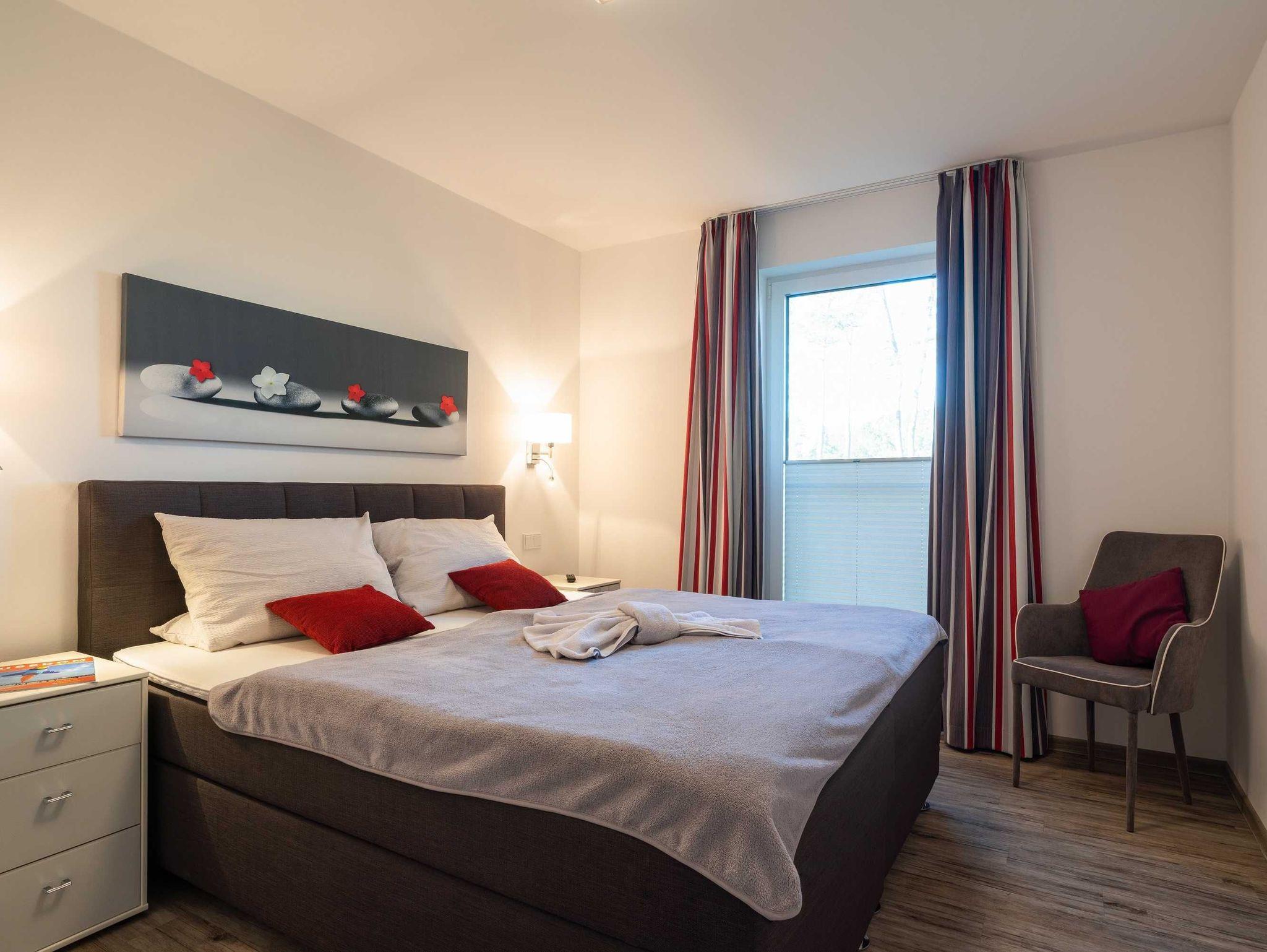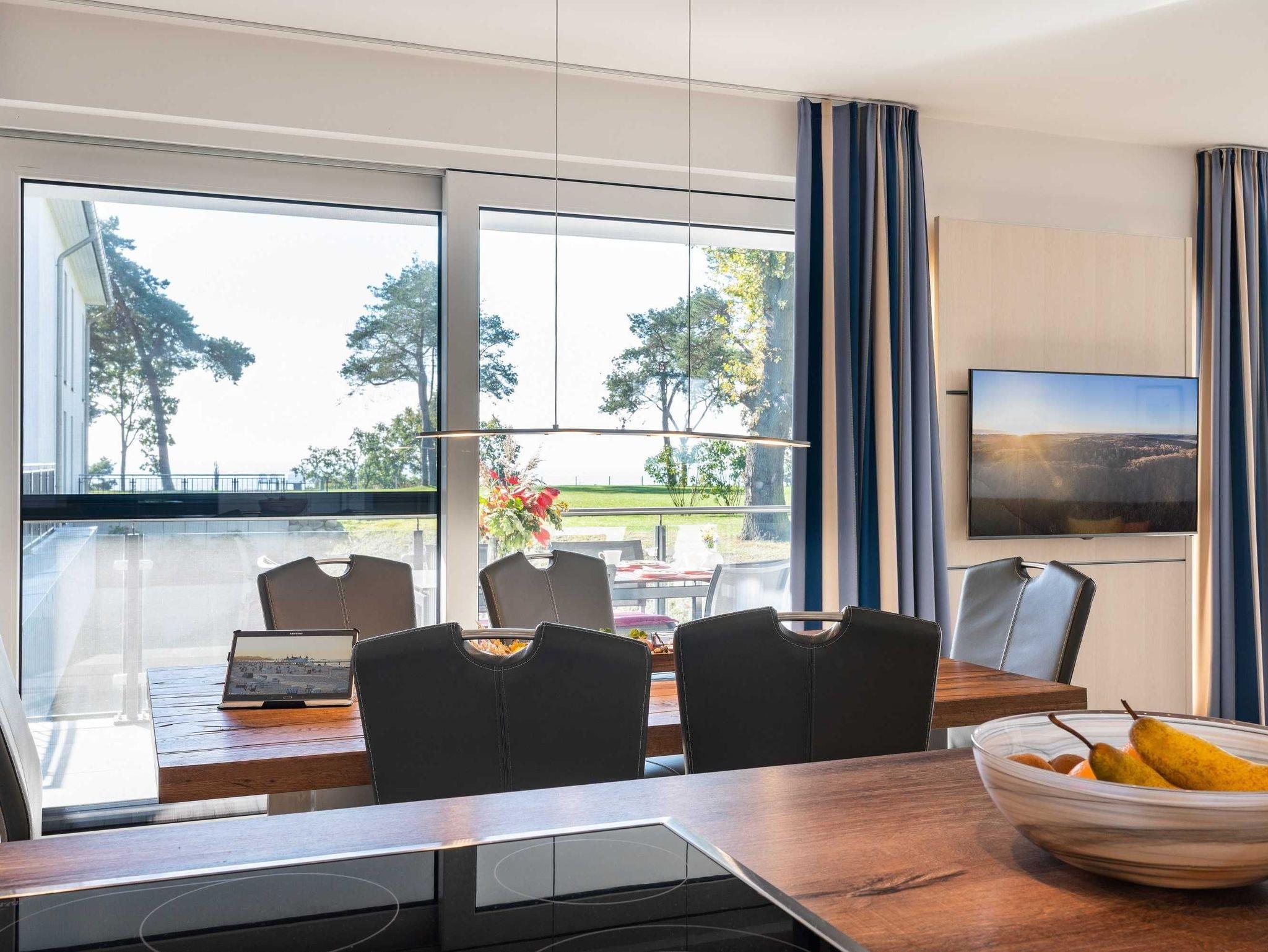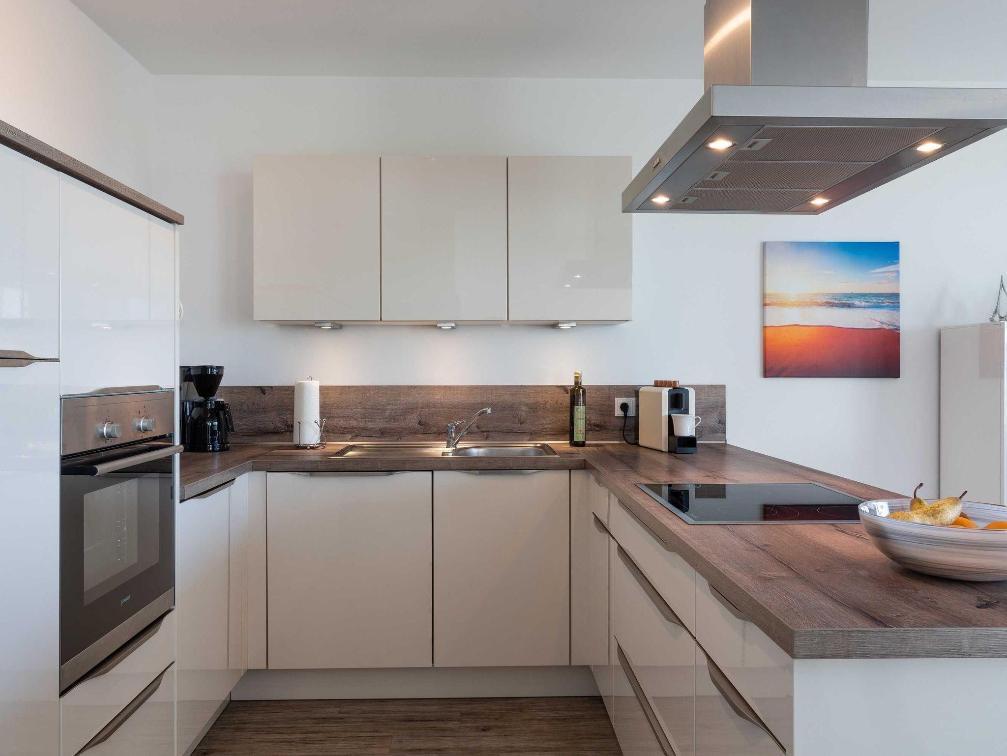 Diese luxuriöse 4-Zimmer-Wohnung im Erdgeschoss von Haus 1 mit Platz für maximal 6 Personen sowie einem Kleinkind bis 2 Jahre im Babybett verfügt über eine Wohnfläche von 119 m² und hat 3 Schlafzimmer sowie 2 voll ausgestattete Duschbäder. Die große Sonnenterrasse mit 17 m² liegt in idealer Süd-Ausrichtung. Die Wohnung ist modern eingerichtet mit offenem Wohn-Essbereich, großem Esstisch, Ledersofa sowie Flat-TV (inkl. Sky-Abo). Die hochwertig ausgestattete Küche, offen zum Wohnbereich, lässt keine Wünsche offen. Für gemütliche Abende sorgt der Elektrokamin mit seinem stimmungsvollen Flammenspiel.
