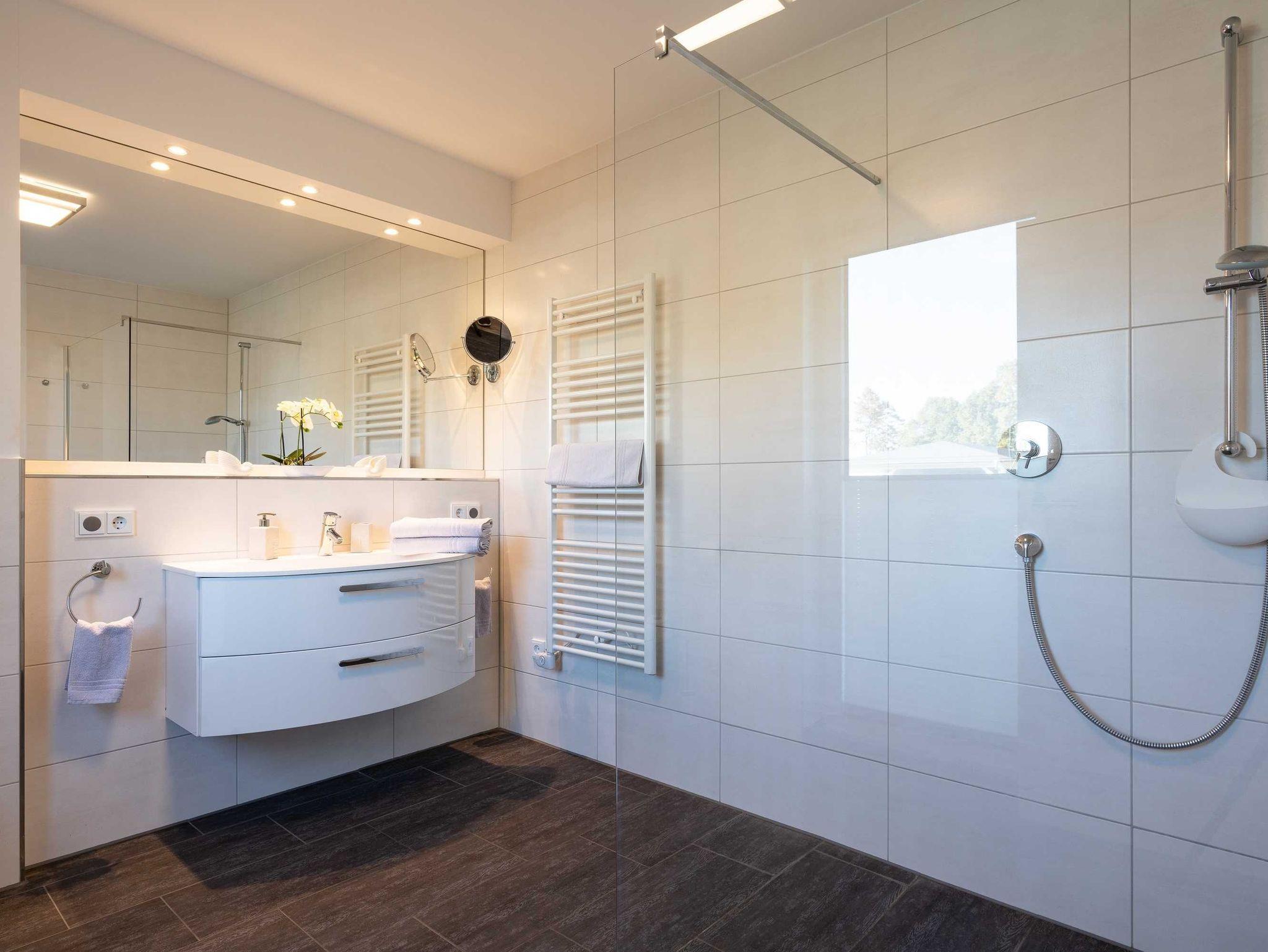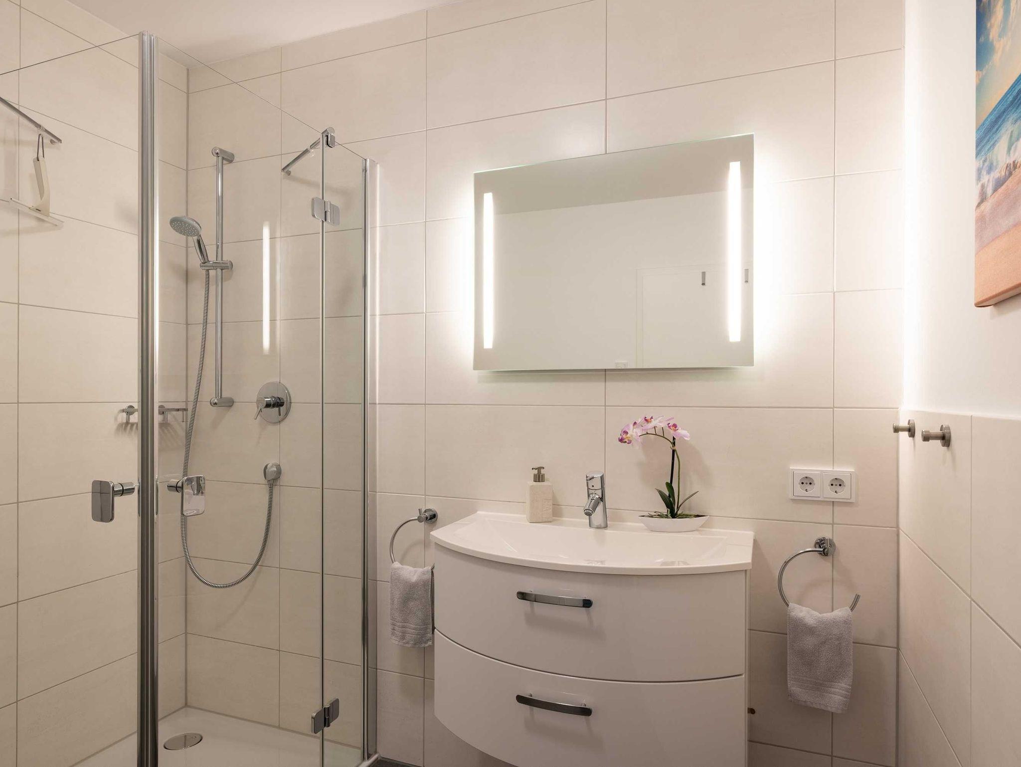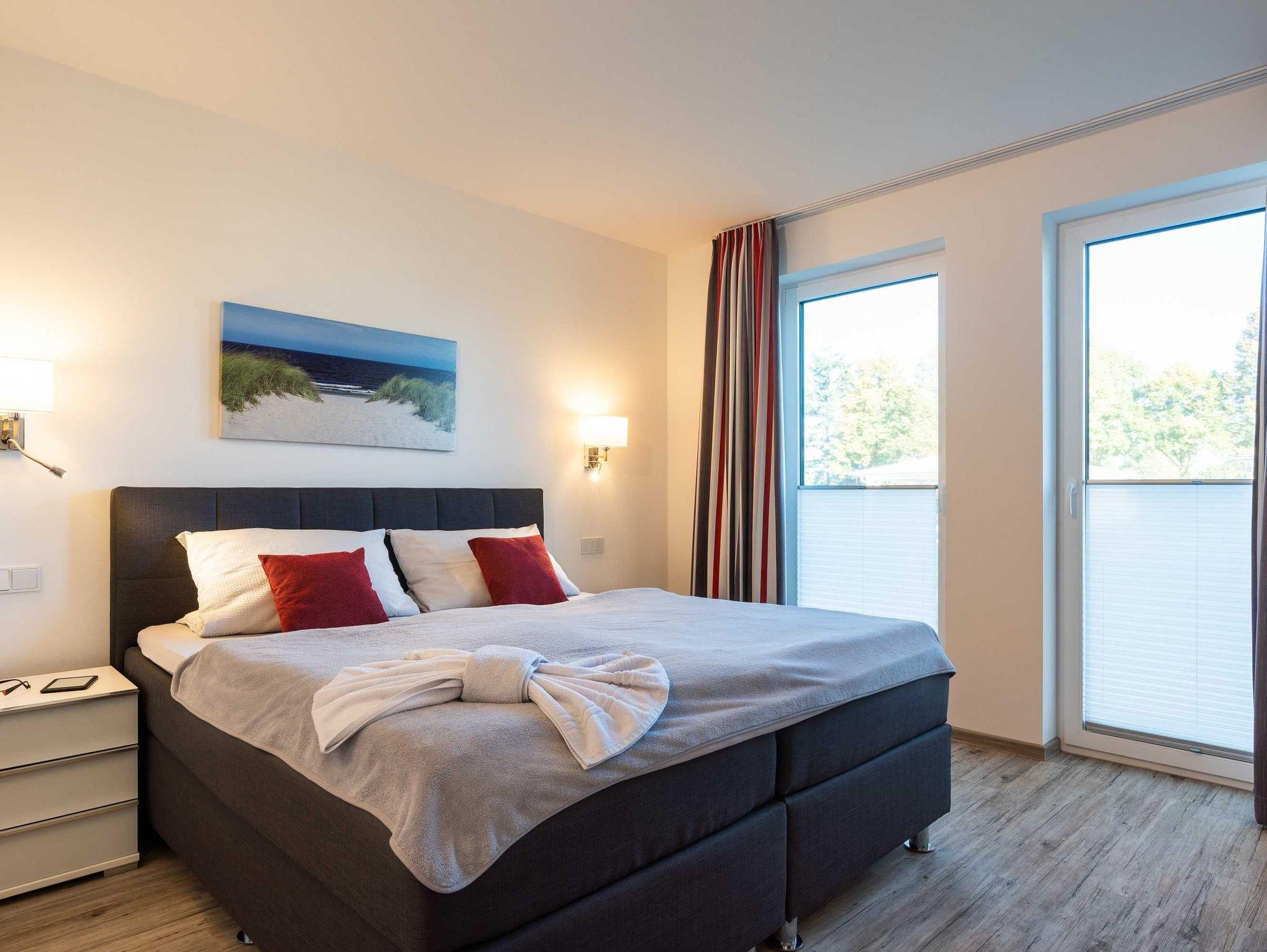 Diese luxuriöse 4-Zimmer-Wohnung im Erdgeschoss von Haus 1 mit Platz für maximal 6 Personen sowie einem Kleinkind bis 2 Jahre im Babybett verfügt über eine Wohnfläche von 119 m² und hat 3 Schlafzimmer sowie 2 voll ausgestattete Duschbäder. Die große Sonnenterrasse mit 17 m² liegt in idealer Süd-Ausrichtung. Die Wohnung ist modern eingerichtet mit offenem Wohn-Essbereich, großem Esstisch, Ledersofa sowie Flat-TV (inkl. Sky-Abo). Die hochwertig ausgestattete Küche, offen zum Wohnbereich, lässt keine Wünsche offen. Für gemütliche Abende sorgt der Elektrokamin mit seinem stimmungsvollen Flammenspiel.