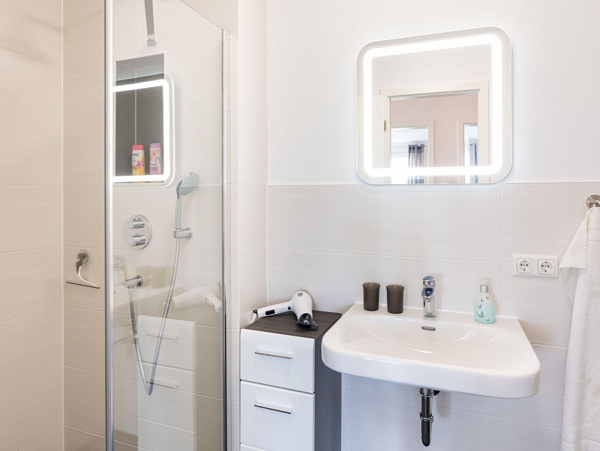 Die beiden vollausgestatteten Badezimmer verfügen jeweils über eine ebenerdige Dusche, WC, Waschtischanlage sowie Fön.