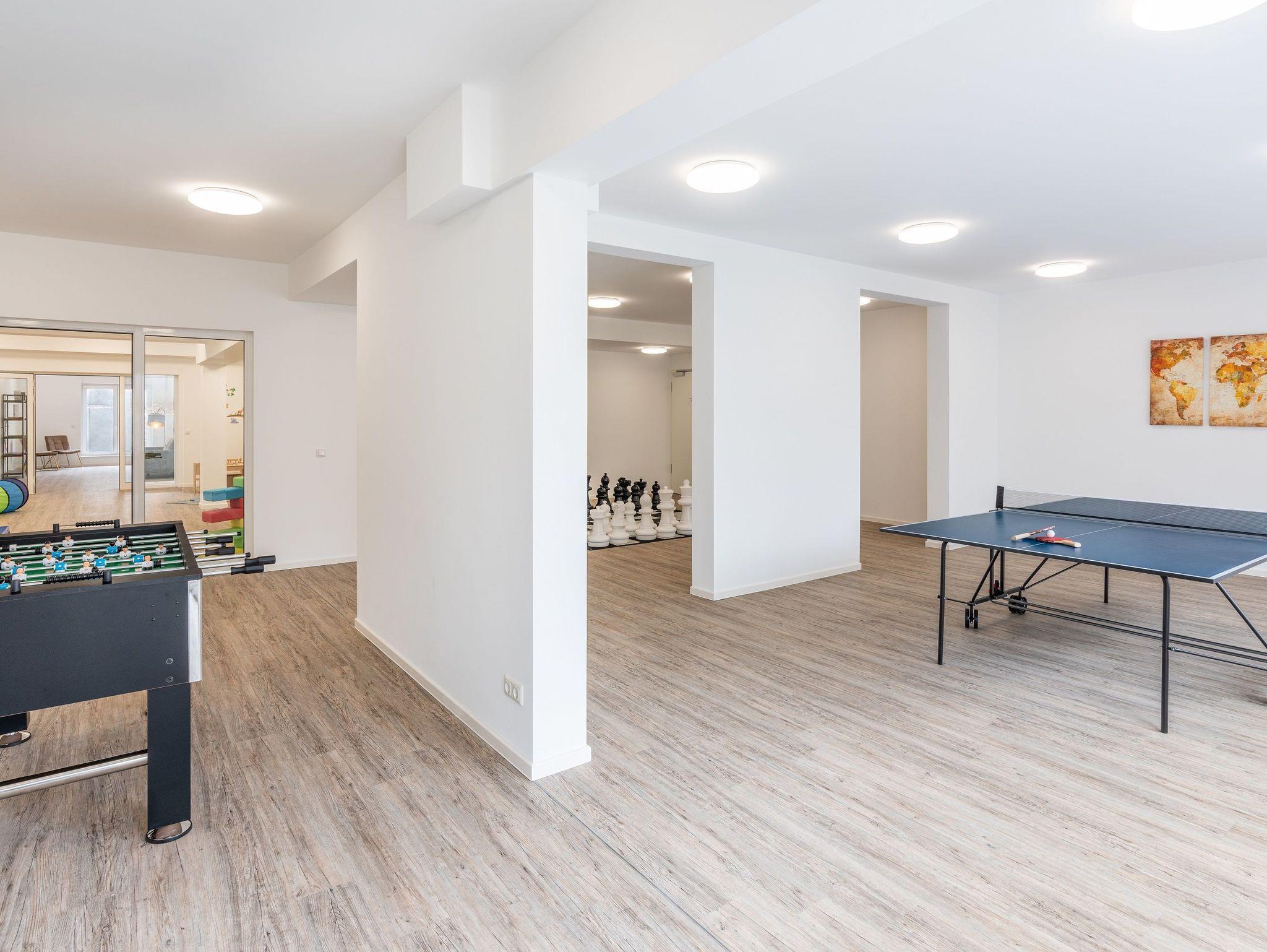 Ihre Kinder dürfen sich auf den vielseitig gestalteten Freizeitbereich (390 m²) im Souterrain mit Tischtennis, Kickertisch, Schachbrett und Spielezimmer freuen, der selbst an Schlechtwettertagen keine Langeweile aufkommen lässt. Erwachsene finden am Billardtisch oder in der gemütlichen Lounge-Ecke Ausgleich mit einem guten Buch oder Musik im Ohr.