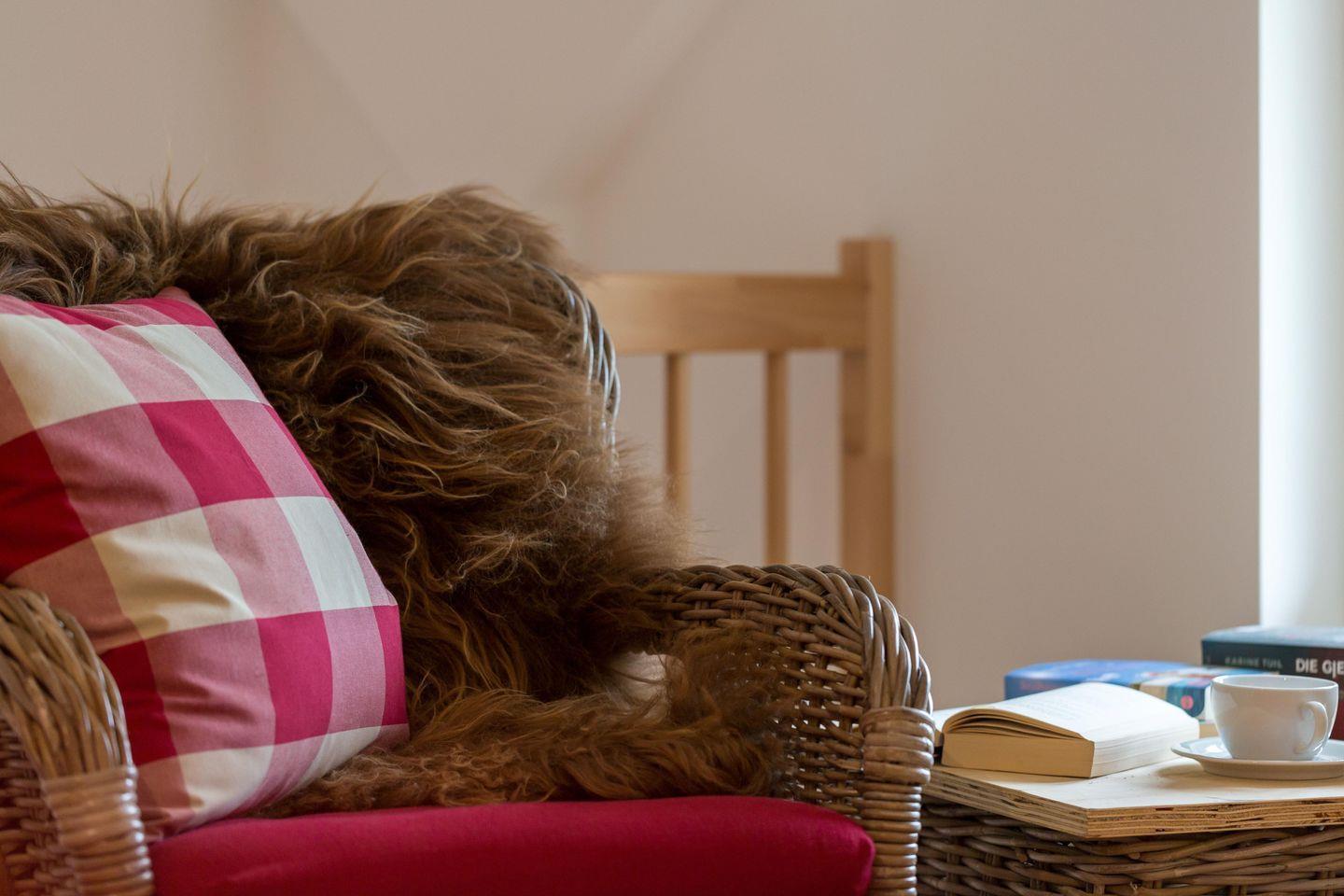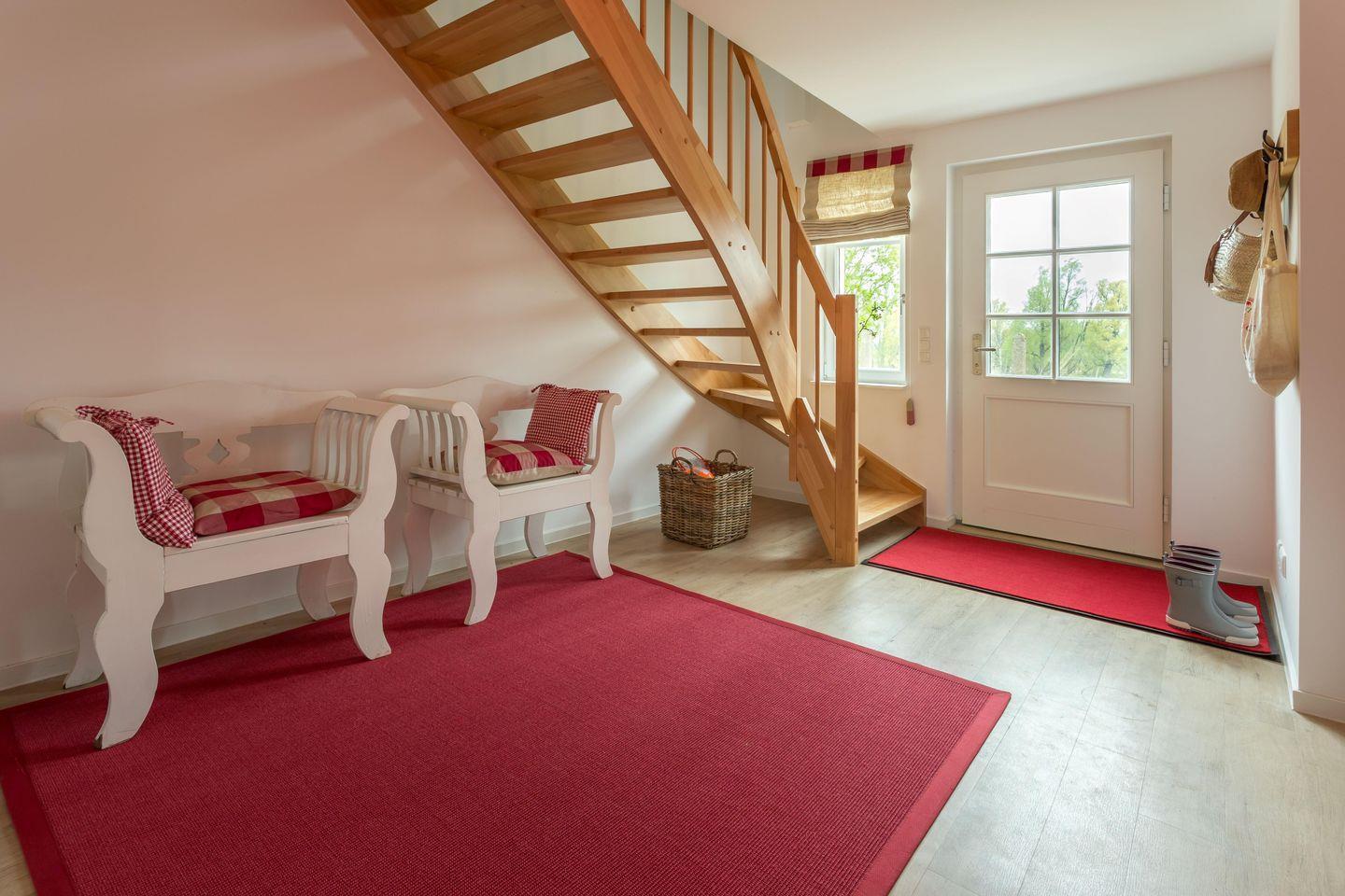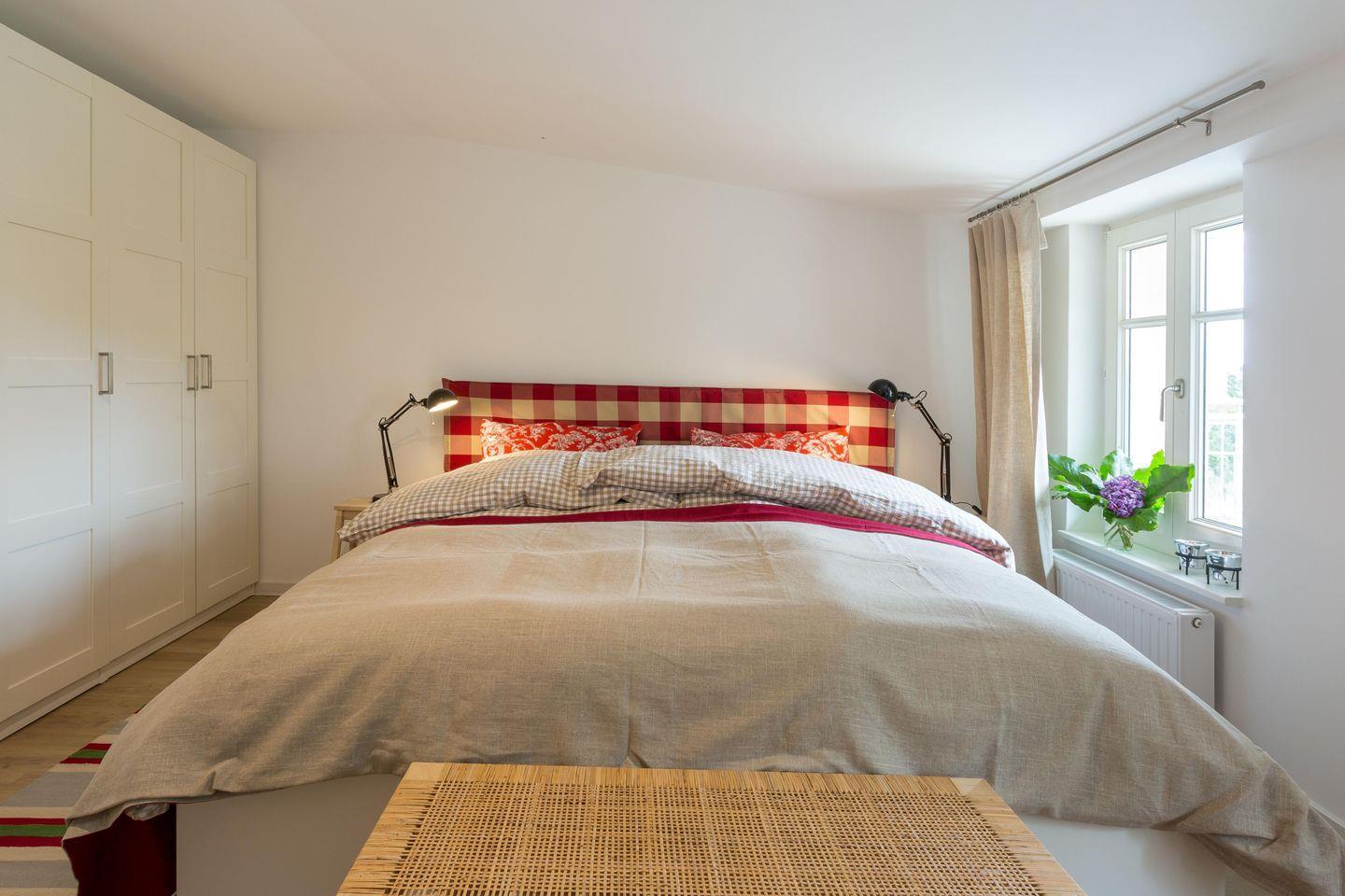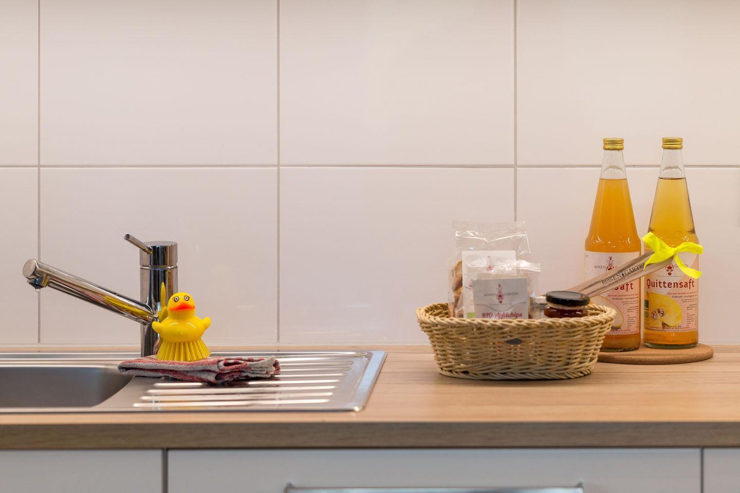 "Die Rose" bietet als 2-Zimmer-Maisonette über zwei Stockwerke auch Platz für bis zu 4 Personen. Im Erdgeschoss finden Sie die wohnliche Diele und eine große Wohnküche. Das innenliegende Duschbad befindet sich ebenfalls im Erdgeschoss. Über die große Holztreppe gelangen Sie in den sehr gemütlichen Wohnbereich mit den zum Teil schrägen Decken und den tiefgezogenen Fenstern mit Weitblick über die Gemüsefelder und Streuobstwiesen bis zum Gutshaus. Das große Sofa kann mit wenigen Griffen zu einem Doppelbett umfunktioniert werden. In das liebevoll gestaltete Schlafzimmer gelangen Sie direkt vom Wohnzimmer aus.