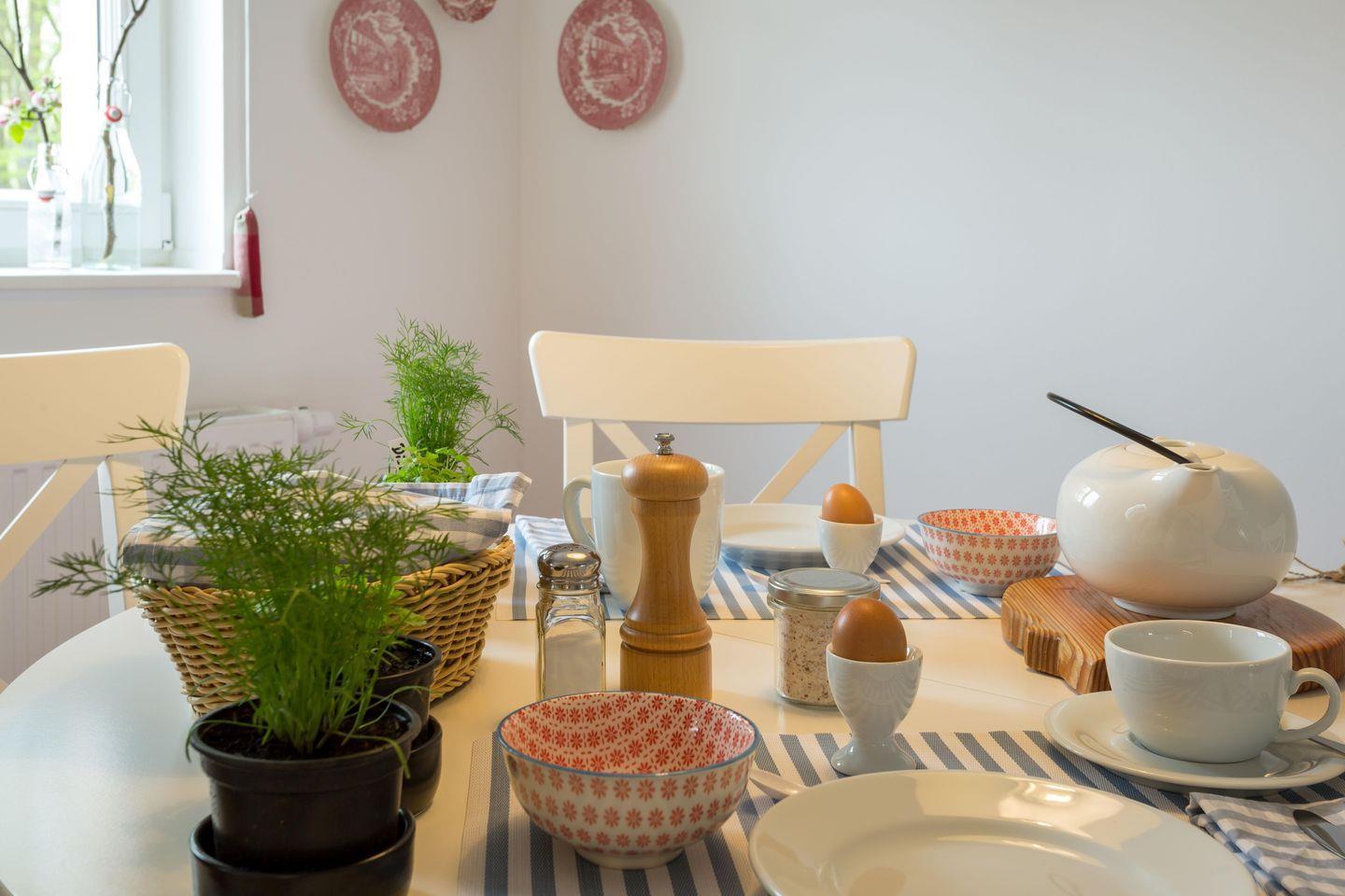 Auf 65 m² finden Sie über 2 Etagen eine separate, voll ausgestattete Küche mit Backofen/Mikrowelle, Kühlschrank mit Gefrierkombination und einem Esstisch.