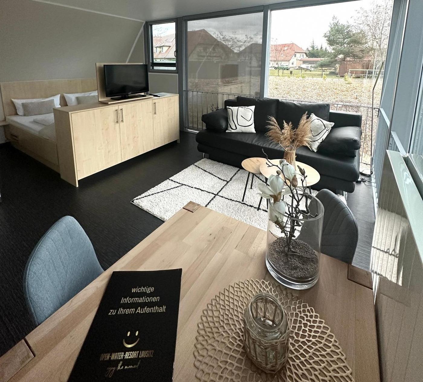 Genießen Sie in unseren komfortablen, geschmackvoll eingerichteten und lichtdurchfluteten Appartements Düne Ihren Aufenthalt im Lausitz Resort. Diese Appartements befinden sich im 2. Obergeschoss des Strandhauses und bieten auf ca. 25 m² Platz für 2 Personen. Ausstattungsmerkmale:Wohn-/Schlafbereich voll klimatisiertDoppelbett im abgegrenzten WohnbereichWohnsofaTV Flachbildschirm mit Radiooffene, voll ausgestattete Küche (Geschirrspüler mit Startpaket, Kühlschrank, 2 Ceran - Kochfelder, Bistroofen, Kaffeemaschine, Wasserkocher), diverse KüchenutensilienBadezimmer mit Dusche/WC, Schminkspiegel und Föhnausgestattet mit Bettwäsche und Handtücher Dachterrassse mit Loungeinsel und EssbereichWLAN inklusiveein kostenfreier PKW-StellplatzHundemitnahme nur unter Voranmeldung möglich