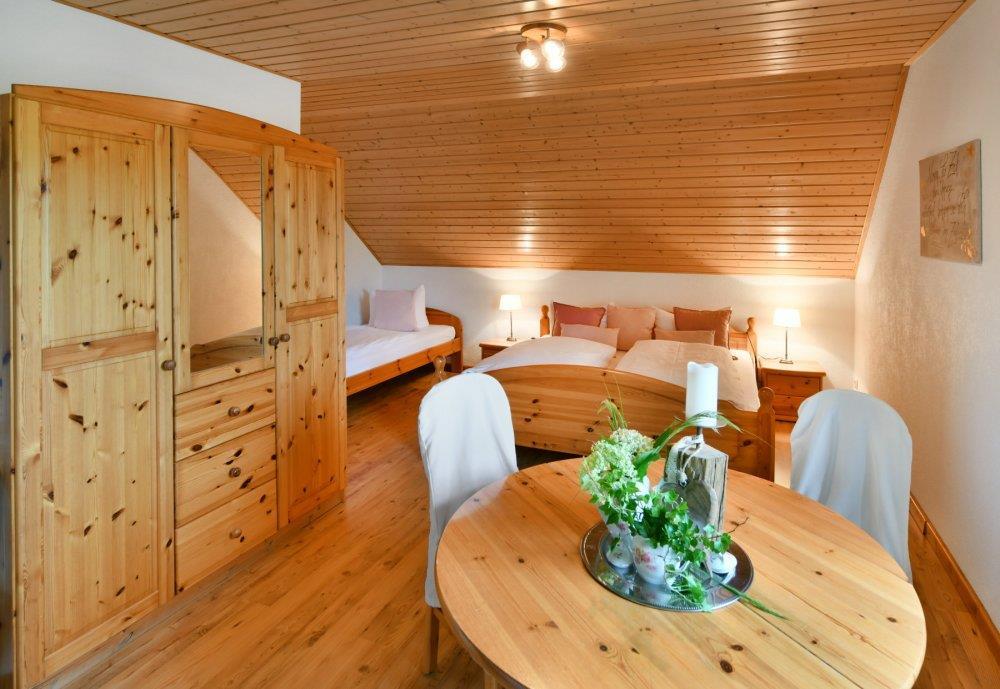 Das Zimmer 4 ist mit 4 Sternen klassifiziert und befindet sich in der 1. Etage. Es verfügt über ein Doppelbett, ein Einzelbett, einen Tisch mit Stühlen und 2 Sesseln. Des Weiteren ist Ihr Zimmer mit Laminatfußboden, einem Safe, einer Kofferablage, Fußbodenheizung im Bad sowie Fön und Kosmetikspiegel ausgestattet.Der Blick aus dem Fenster geht über den Garten zum Hochberg sowie zum Rhöndörfchen Bremen.