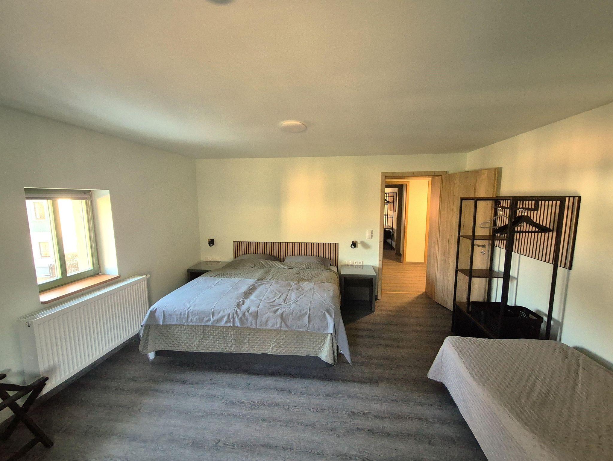 Die FeWo Kohlhaukuppe im 1. OG, mit großem Flur (kleiner Schreibtisch), Wohnzimmer mit neuer Einbauküche (inklusive Backofen, Mikrowelle und Geschirrspüler) Esstisch für 8 Pers., Couch (für 2 Aufbettungen 160x200cm), Sat-TV, zwei separate Schlafzimmer je mit Doppelbett (180x200cm) u. Einzelbett (90 x200cm), ein Balkon zur Hofseite, 2 Bäder je mit Dusche/WC, dazu 1 Infrarot-Ecksauna für 4 Personen.