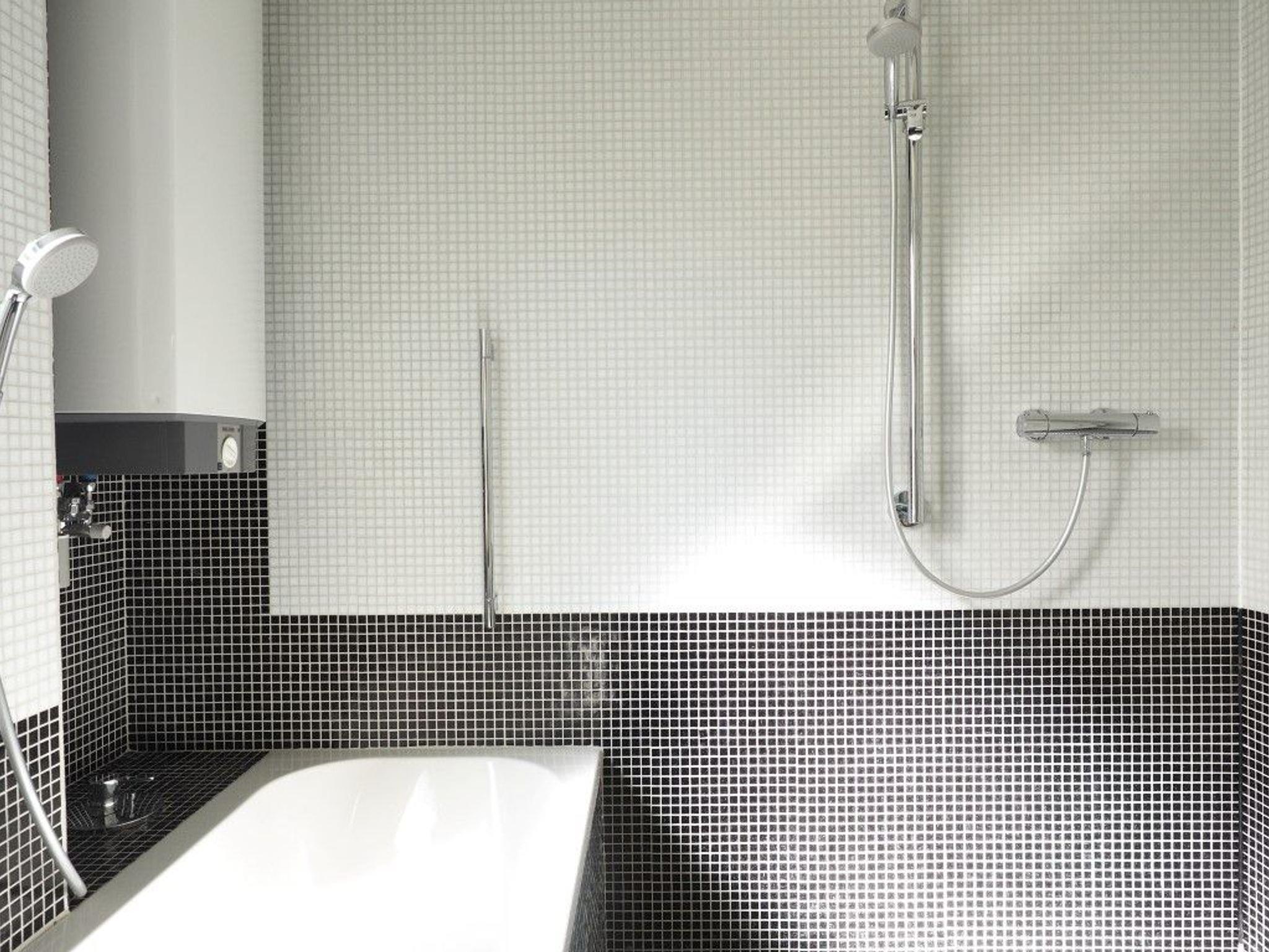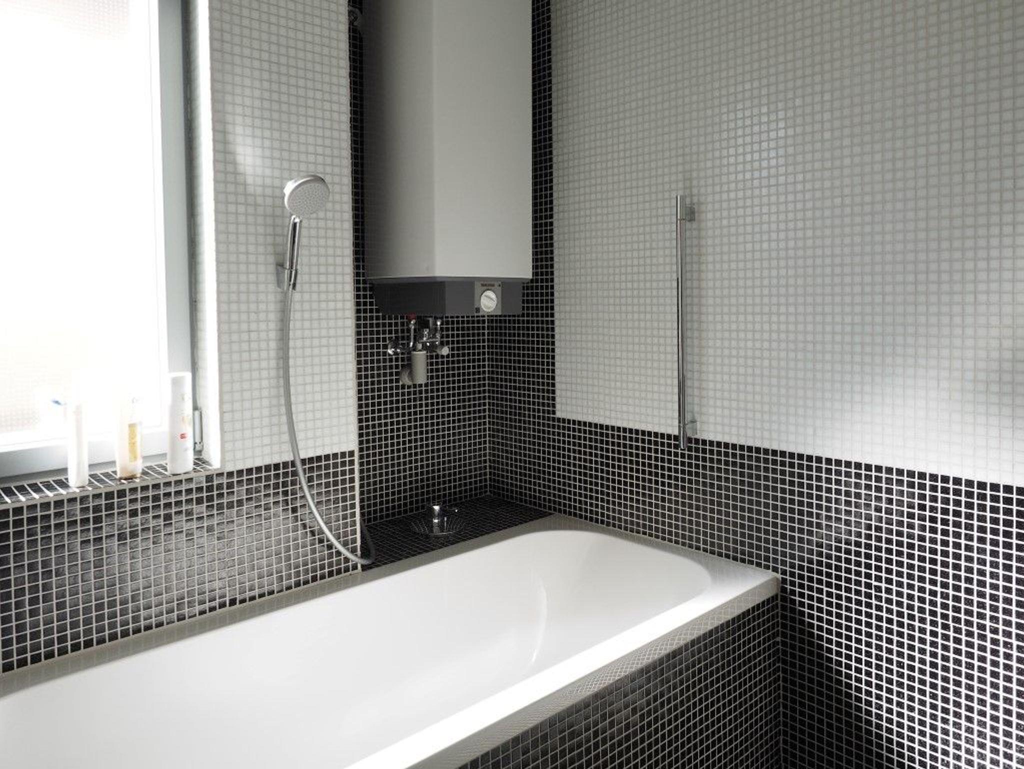 Das Bad verfügt über einen großzügigen Bodengleichen Duschbereich und eine Badewanne.