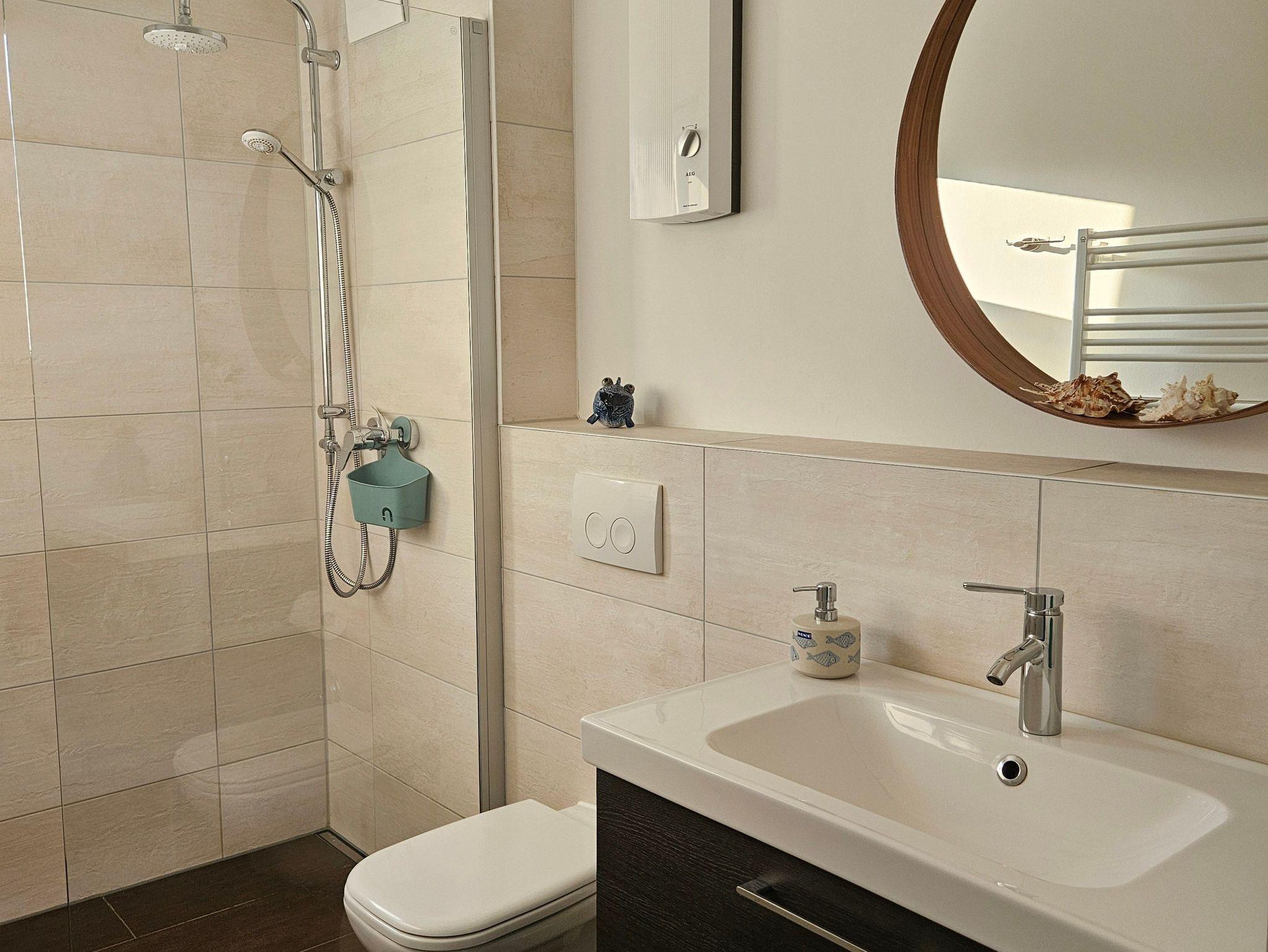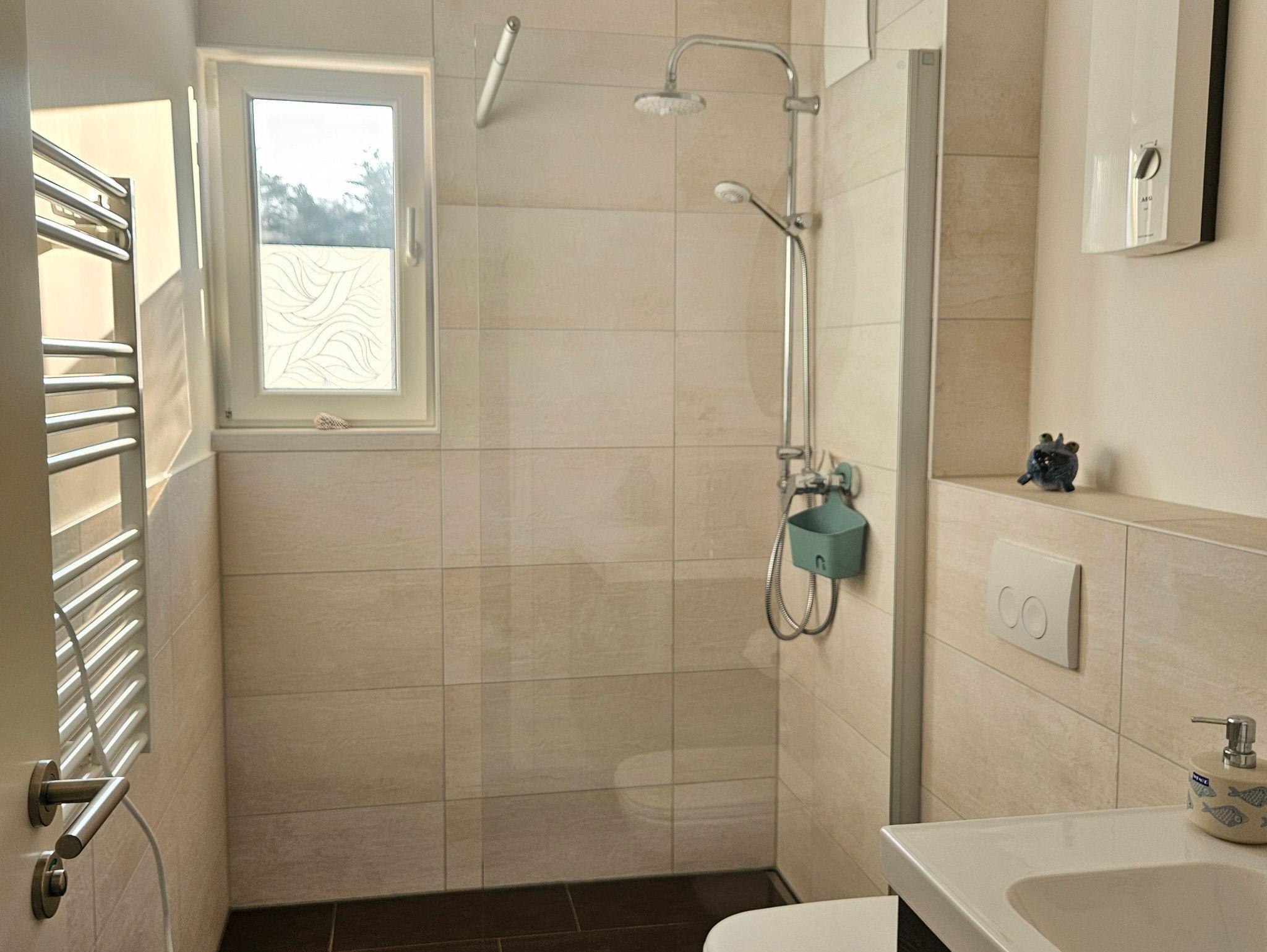 Im Badezimmer sind eine bodengleiche Dusche, WC und ein Haartrockner vorhanden.
