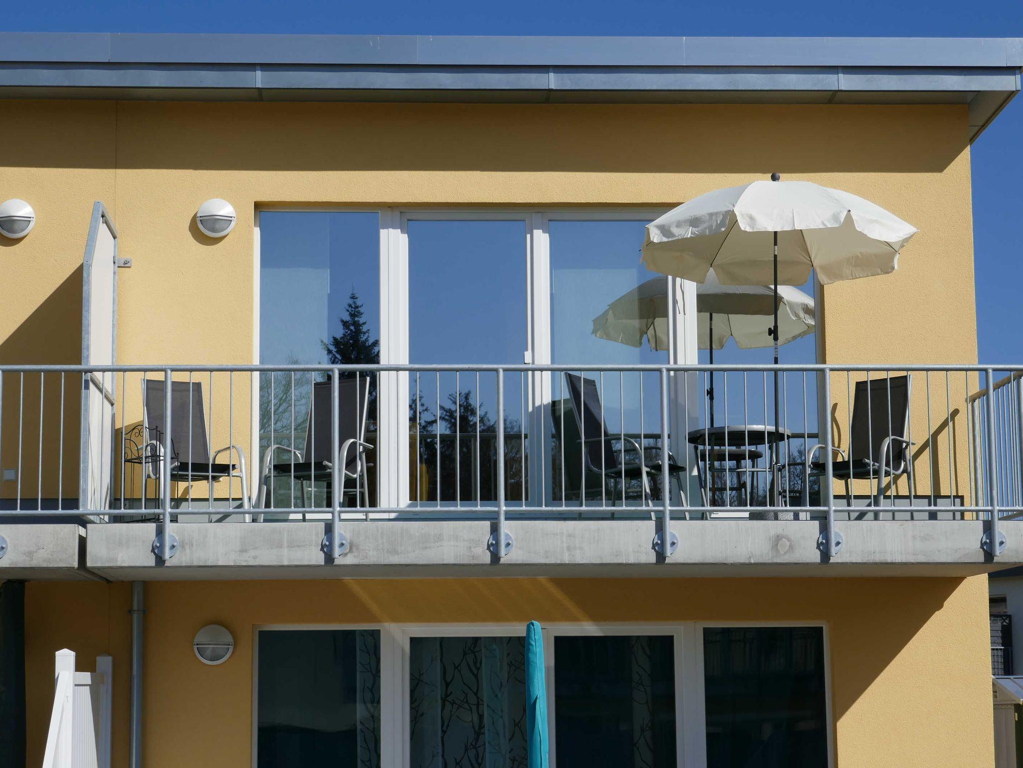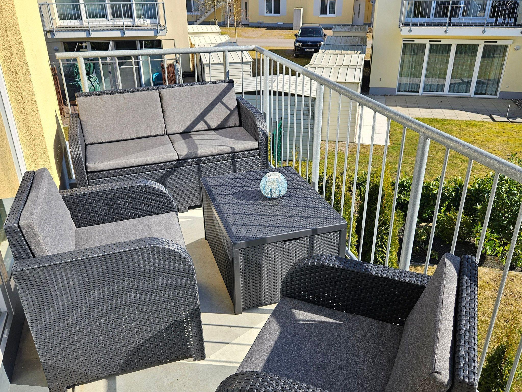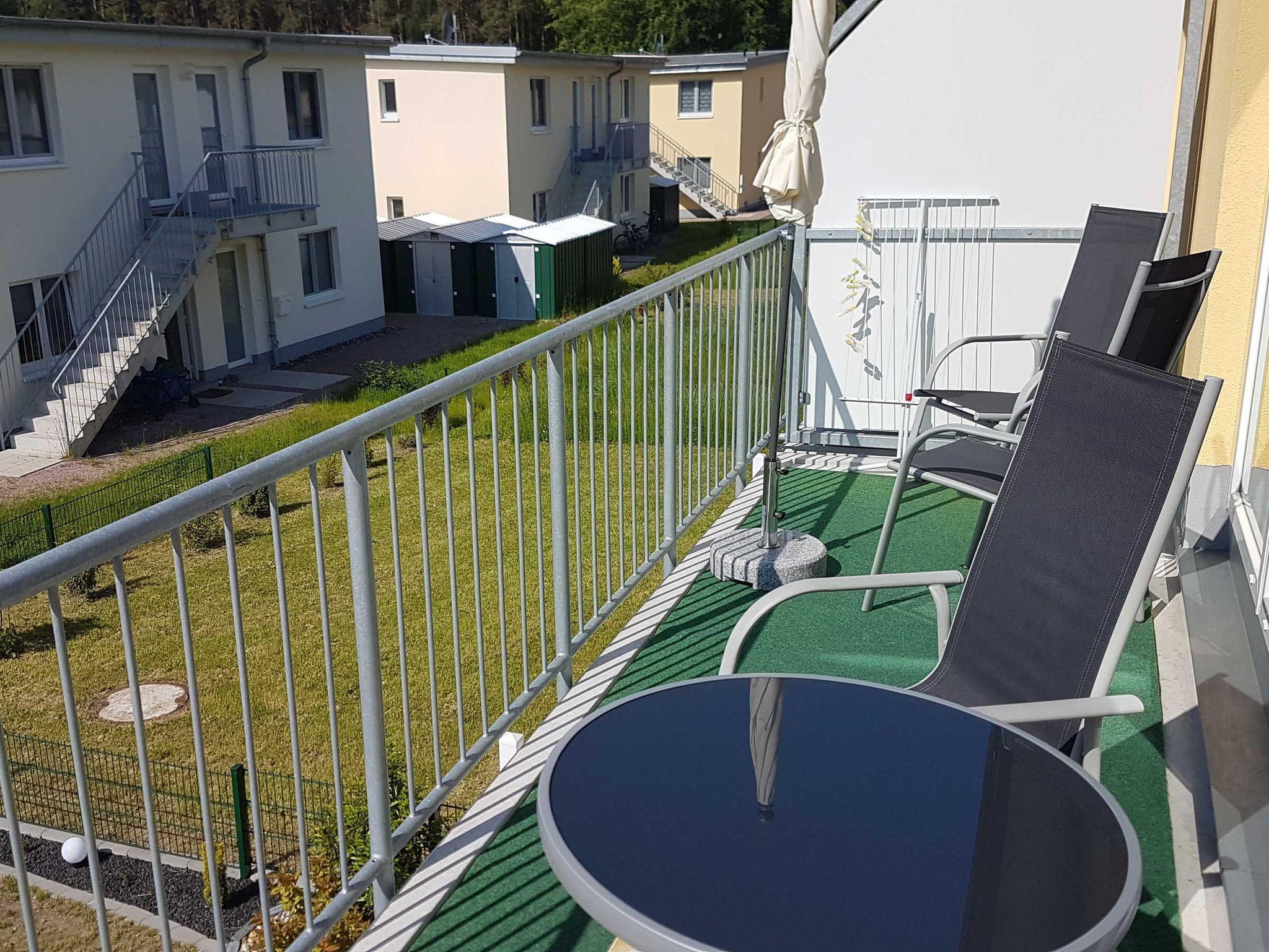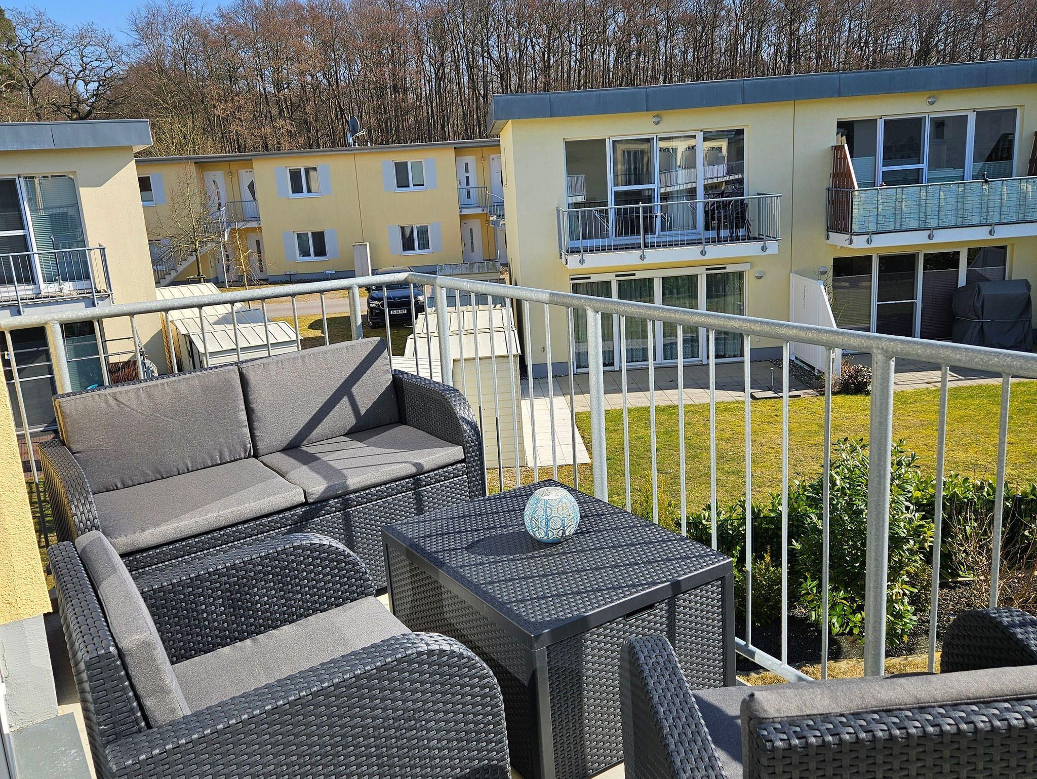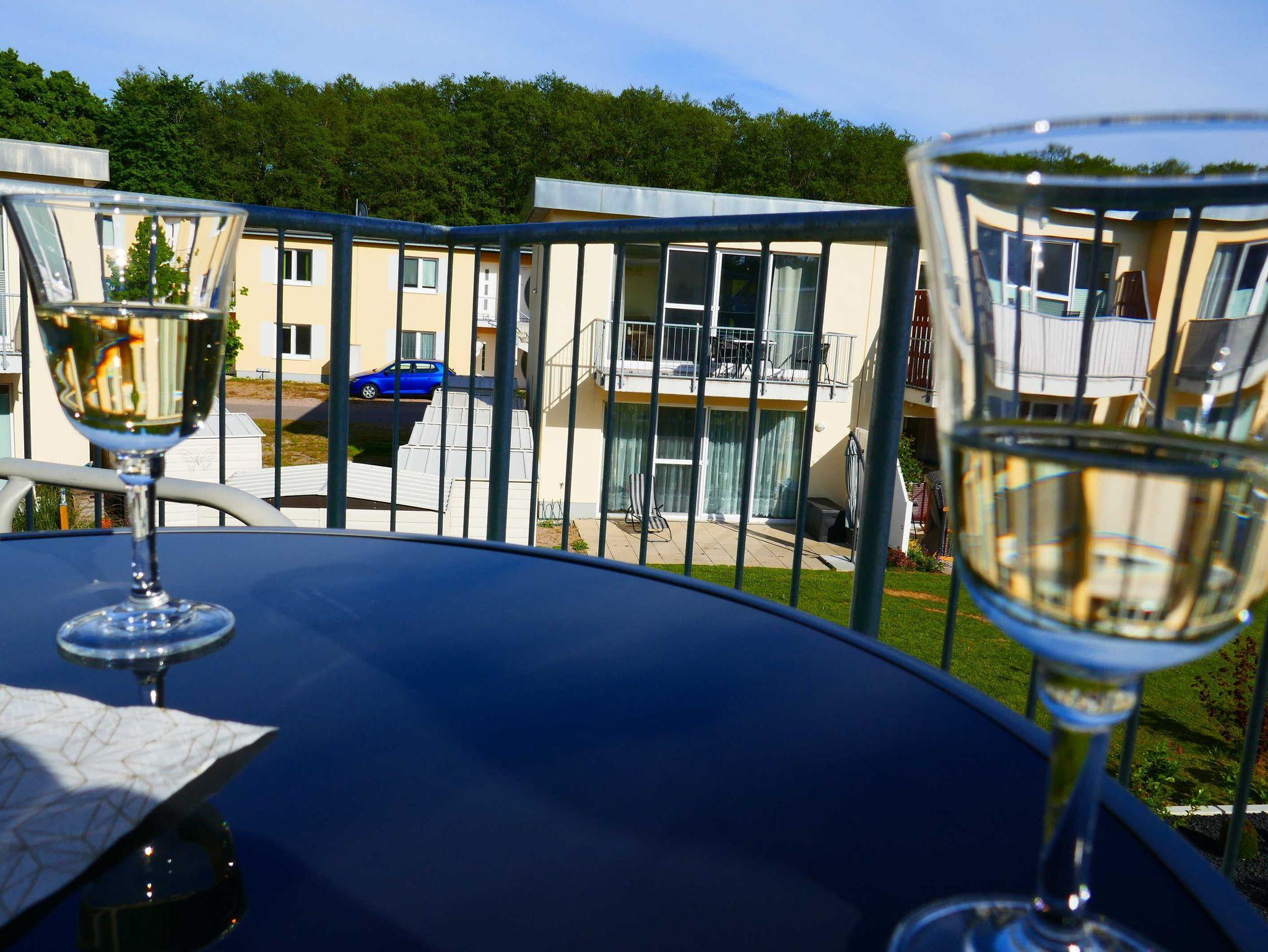Die Wohnfläche beträgt ca. 42 m² Wfl. Der Balkon mit 8,6 m² Fläche und Südausrichtung lädt zum frühstücken, lesen und relaxen ein. Der Blick fällt in den Gartenbereich der Ferienanlage.