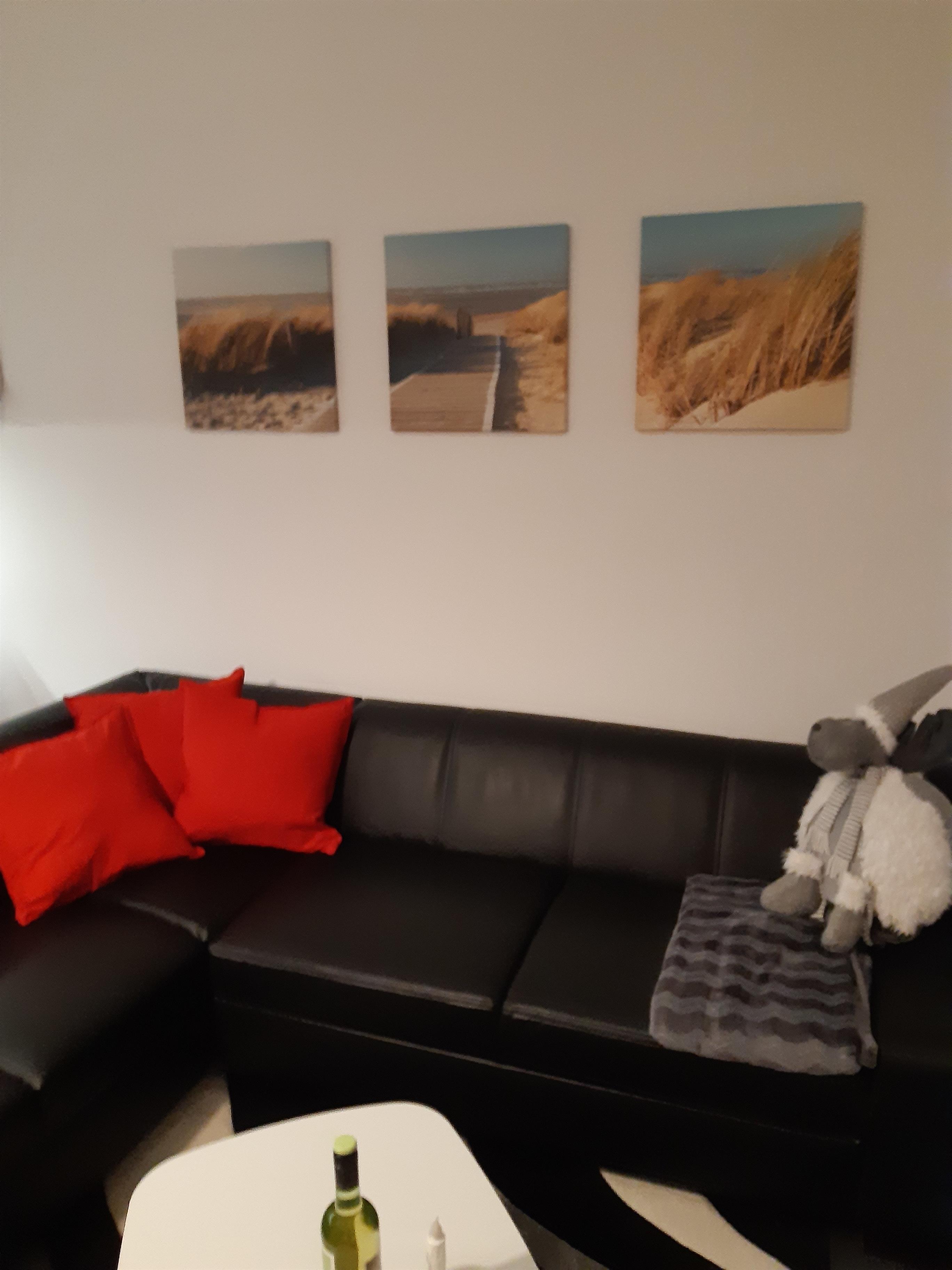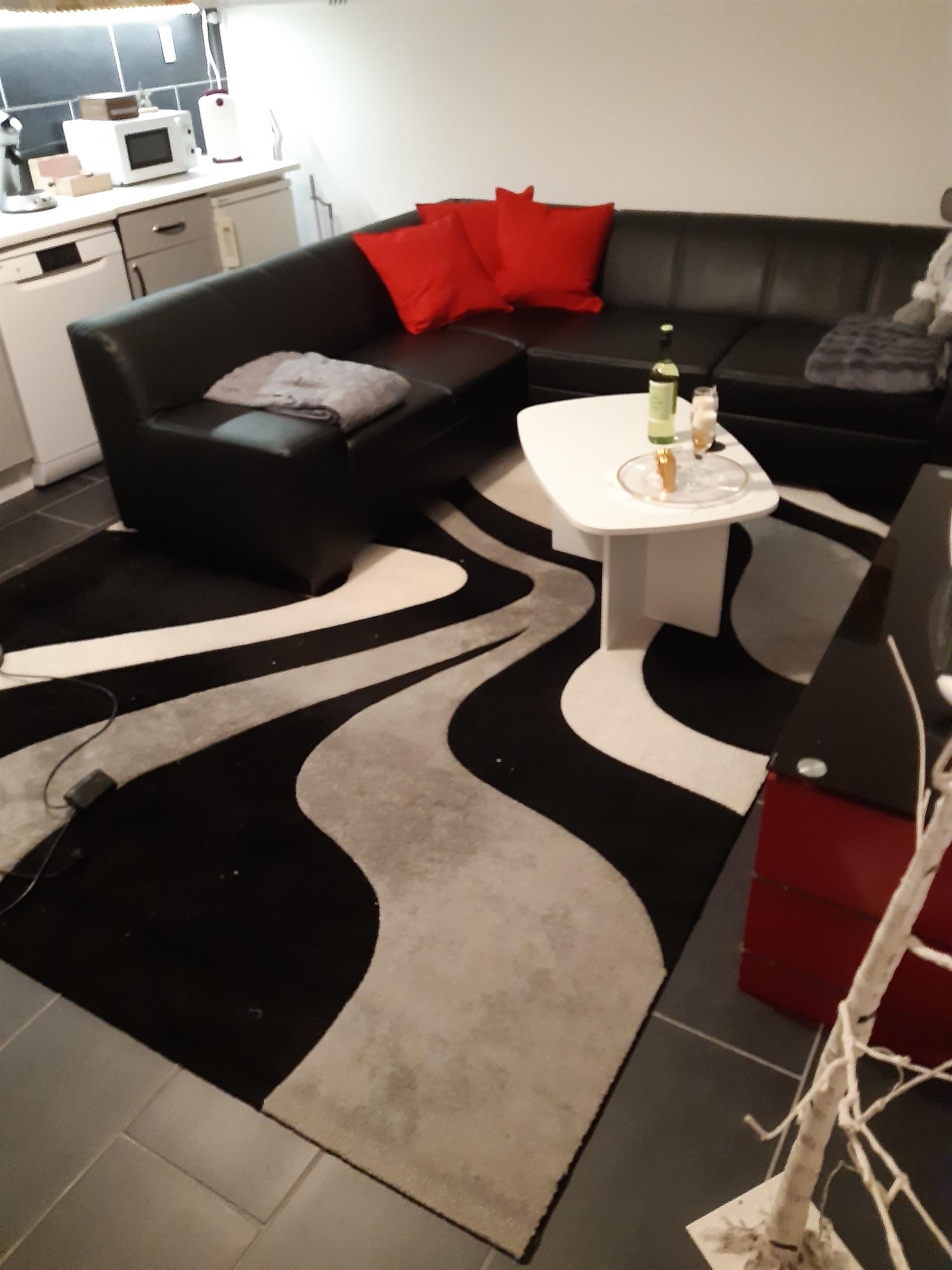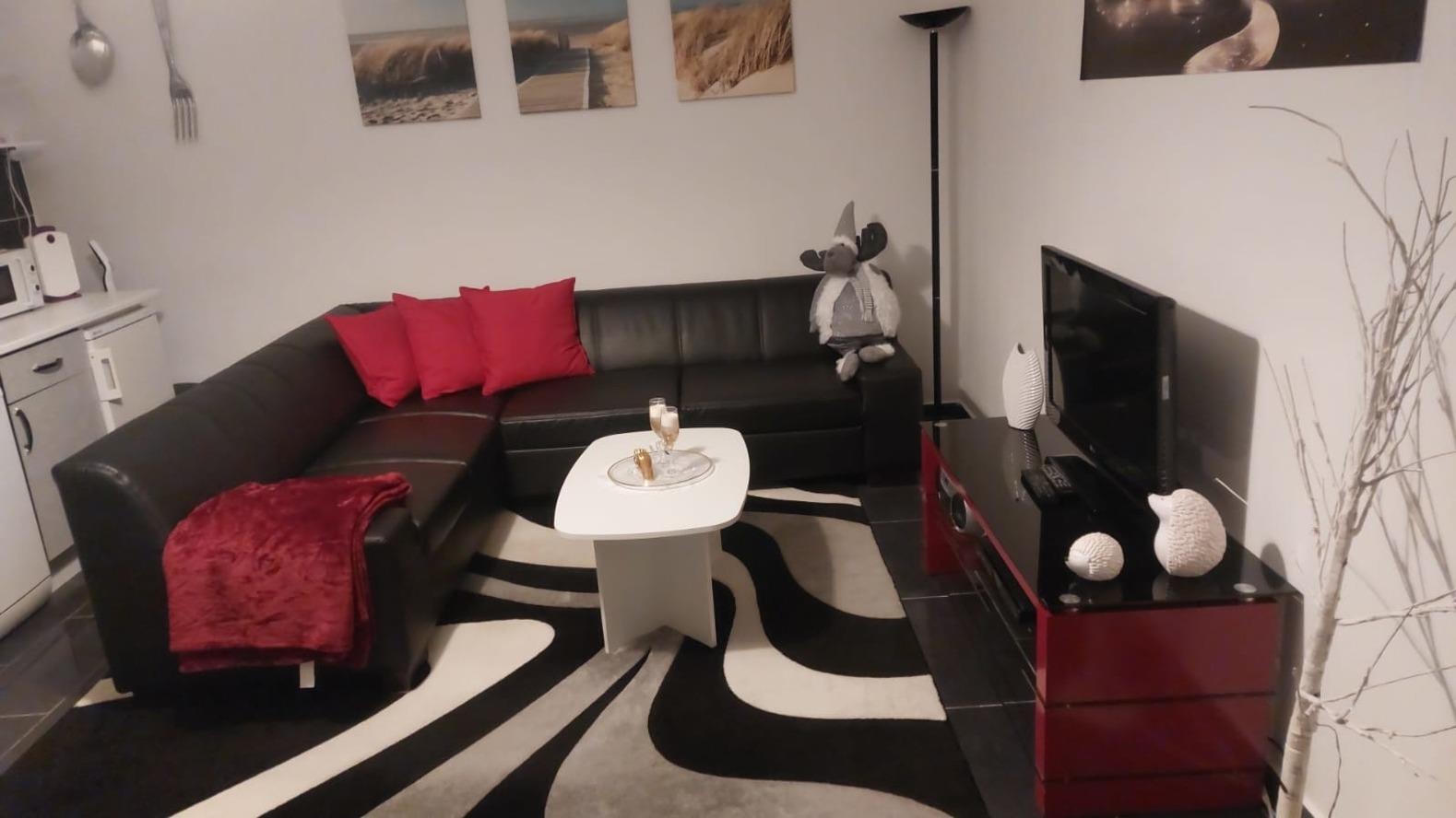 Im Wohnzimmer lädt eine Riesige Eckcouch zum Kuscheln ein, zieht man Sie aus
