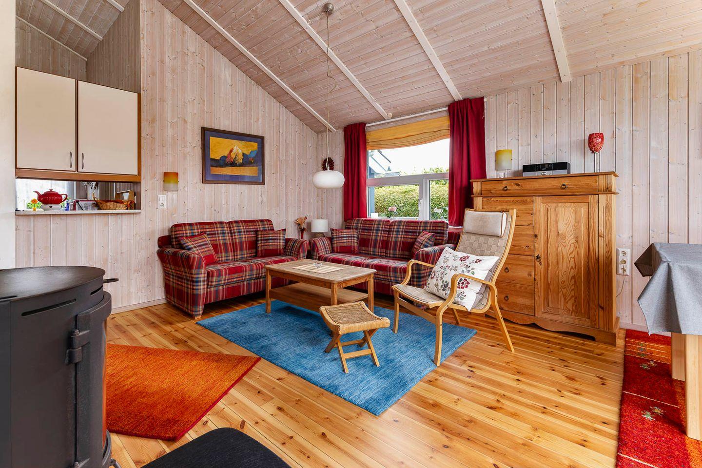 Das ebenerdige Domizil verfügt über 1 großzügigen Wohn- / Essbereich mit Kaminofen, 1 offene Einbauküche, 2 separate Schlafräume, 1 Bad mit Sauna, 1 Terrasse und einen Garten.